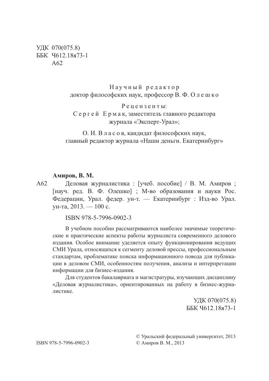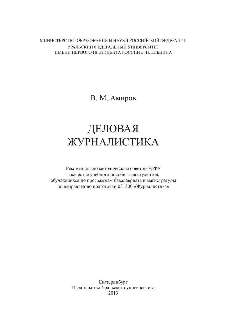 В учебном пособии рассматриваются наиболее значимые теоретические и практические аспекты работы журналиста современного делового издания. Особое внимание уделяется опыту функционирования ведущих СМИ Урала, относящихся к сегменту деловой прессы, профессиональным стандартам, проблематике поиска информационного повода для публикации в деловом СМИ, особенностям получения, анализа и интерпретации информации для бизнес-издания. Для студентов бакалавриата и магистратуры, изучающих дисциплину «Деловая журналистика», ориентированных на работу в бизнес-журналистике.