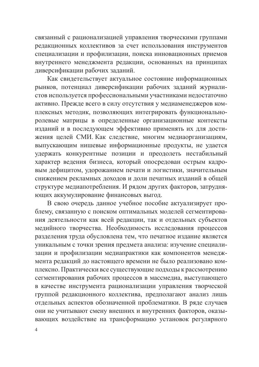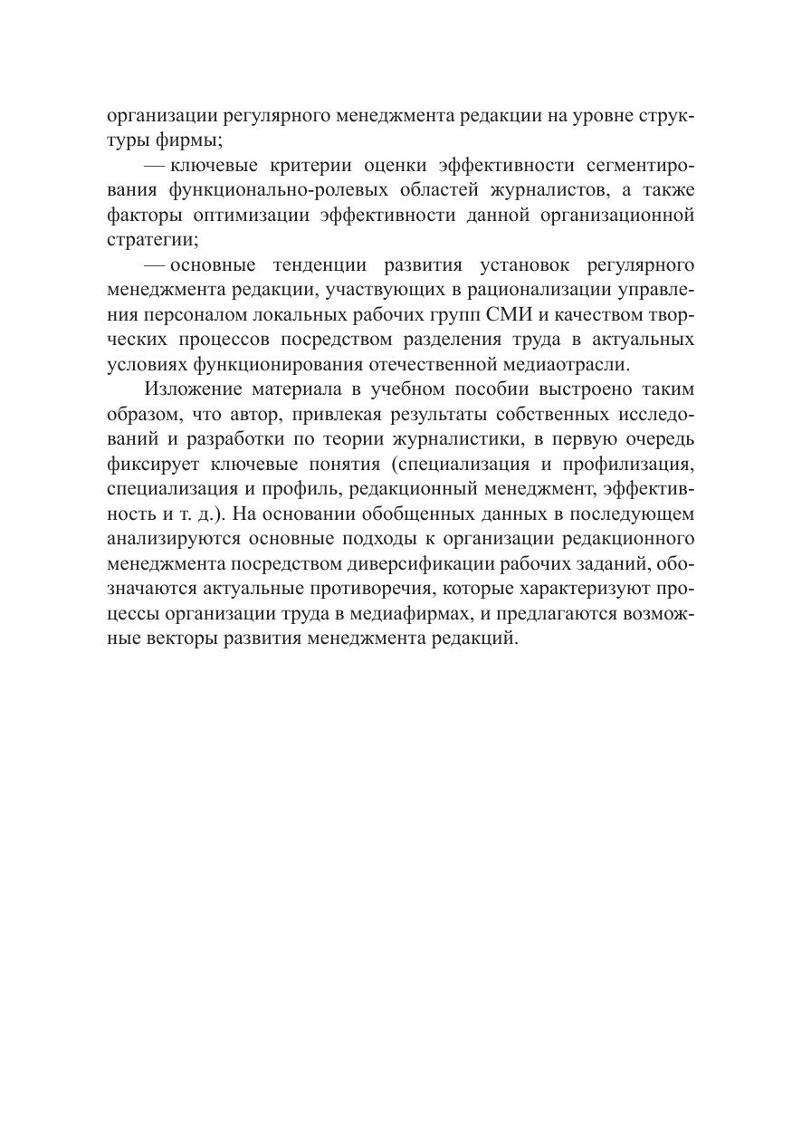 В учебном пособии раскрываются особенности выстраивания менеджмента редакции на уровне формирования структуры медиафирмы. Показаны факторы оптимизации разделения труда в редакционном коллективе, для чего автор уточняет сущность и содержание понятий «специализация» и «профилизация» журналистской деятельности. Исследуется трансформация процедур выстраивания редакционного менеджмента согласно принципам сегментирования медиапрактики. Рекомендуется студентам факультетов и отделений журналистики, преподавателям, журналистам-практикам.