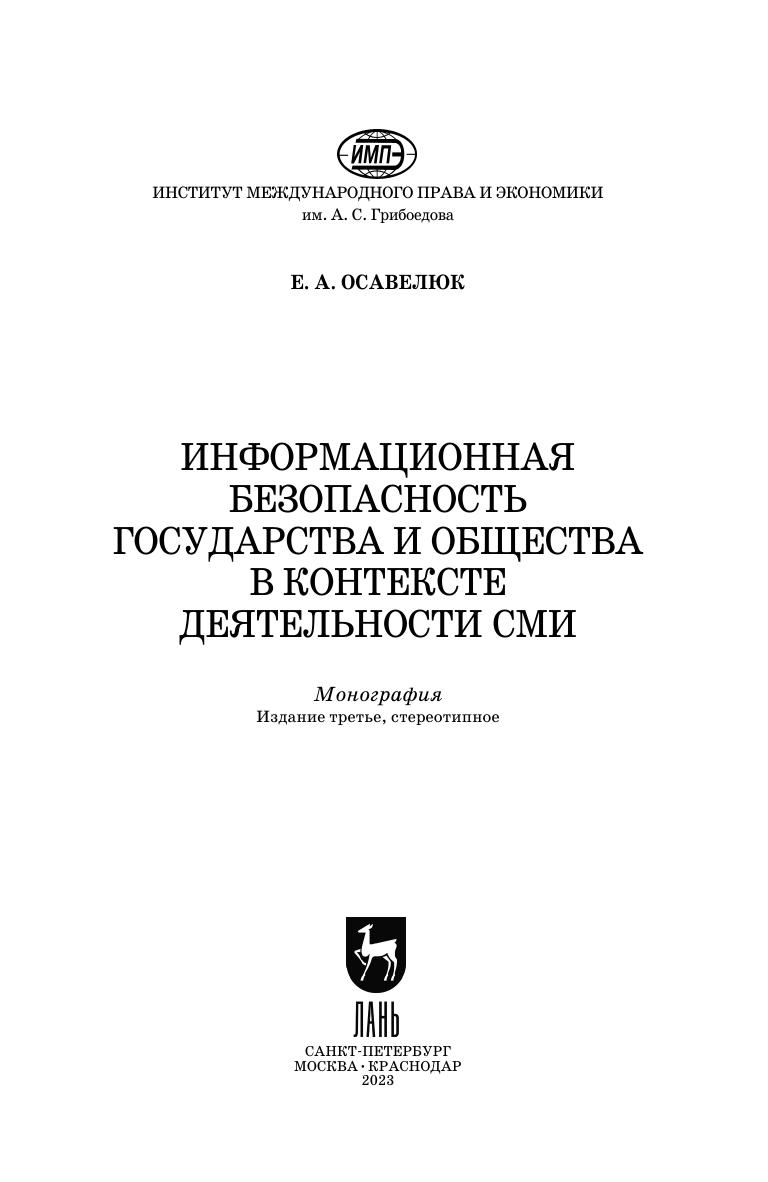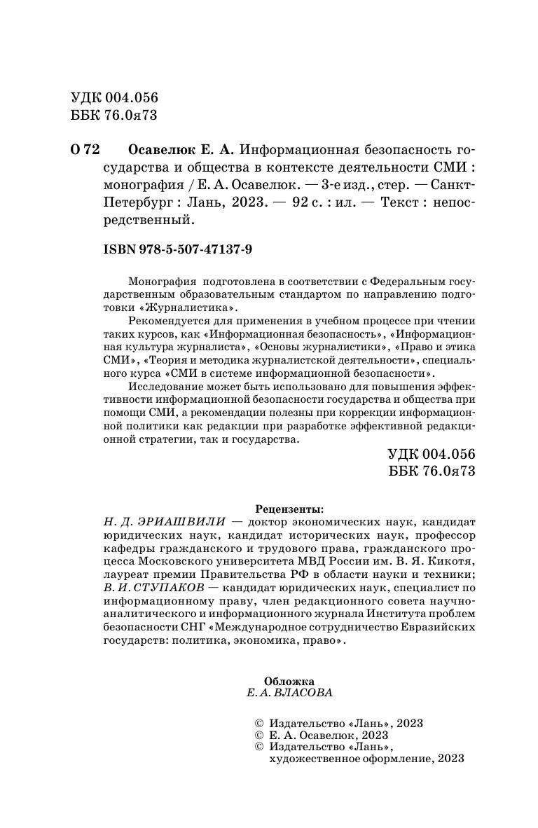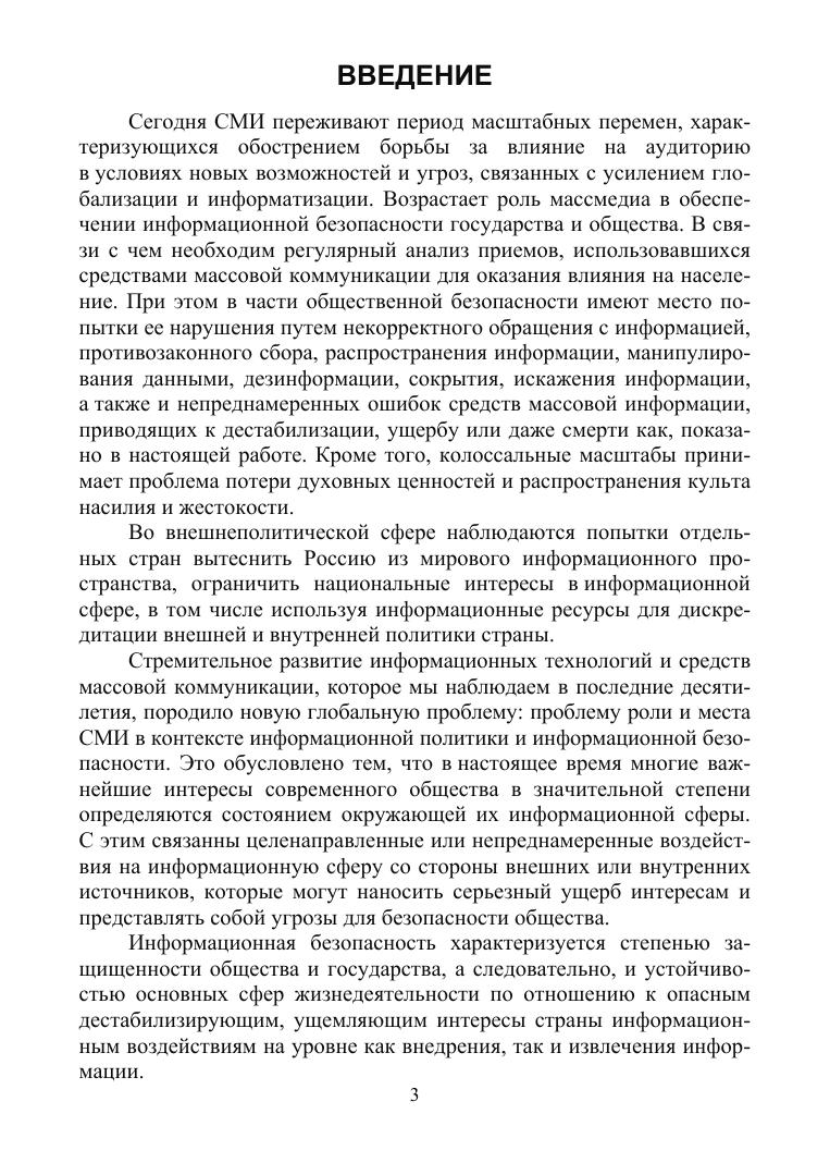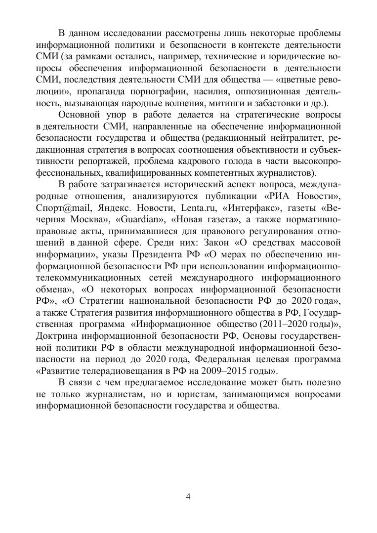 Монография подготовлена в соответствии с Федеральным государственным образовательным стандартом по направлению подготовки «Журналистика». Рекомендуется для применения в учебном процессе при чтении таких курсов, как «Информационная безопасность», «Информационная культура журналиста», «Основы журналистики», «Право и этика СМИ», «Теория и методика журналистской деятельности», специального курса «СМИ в системе информационной безопасности». Исследование может быть использовано для повышения эффективности информационной безопасности государства и общества при помощи СМИ, а рекомендации полезны при коррекции информационной политики как редакции при разработке эффективной редакционной стратегии, так и государства.