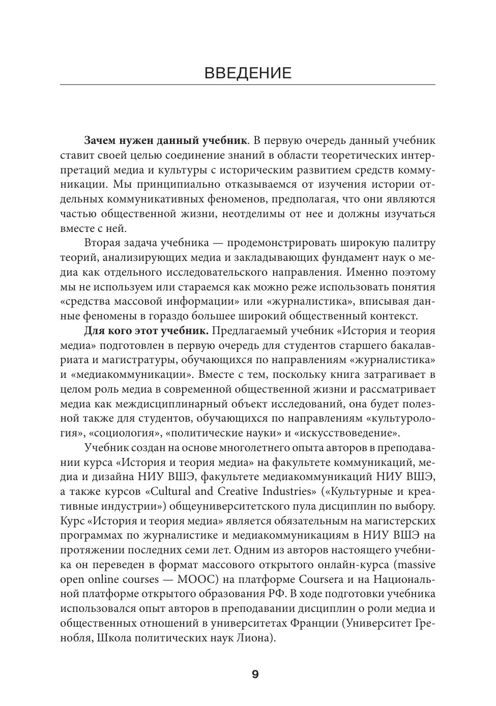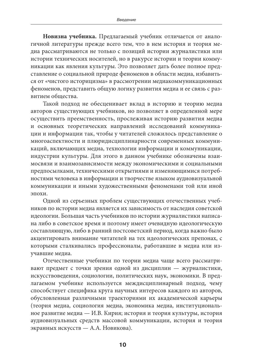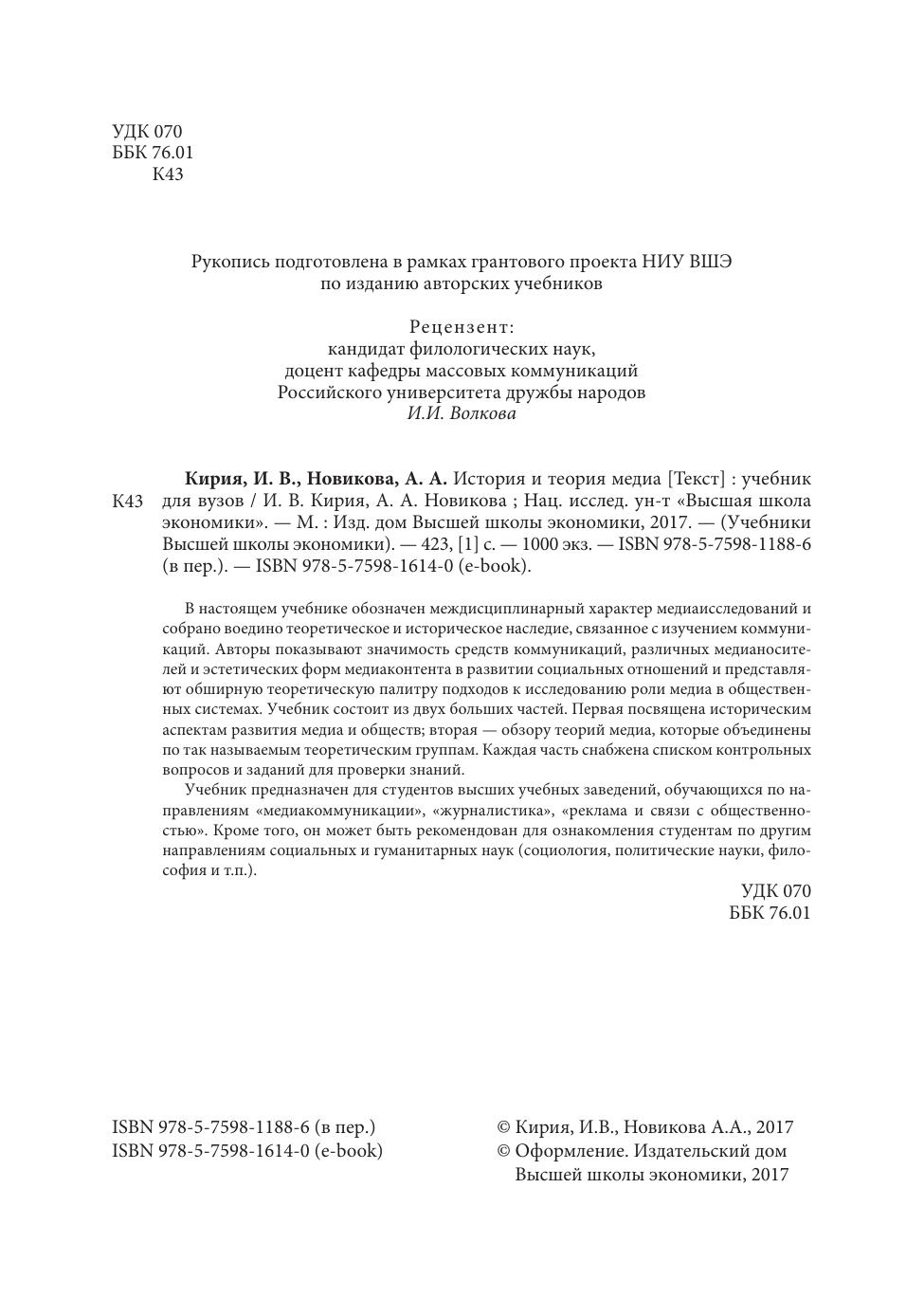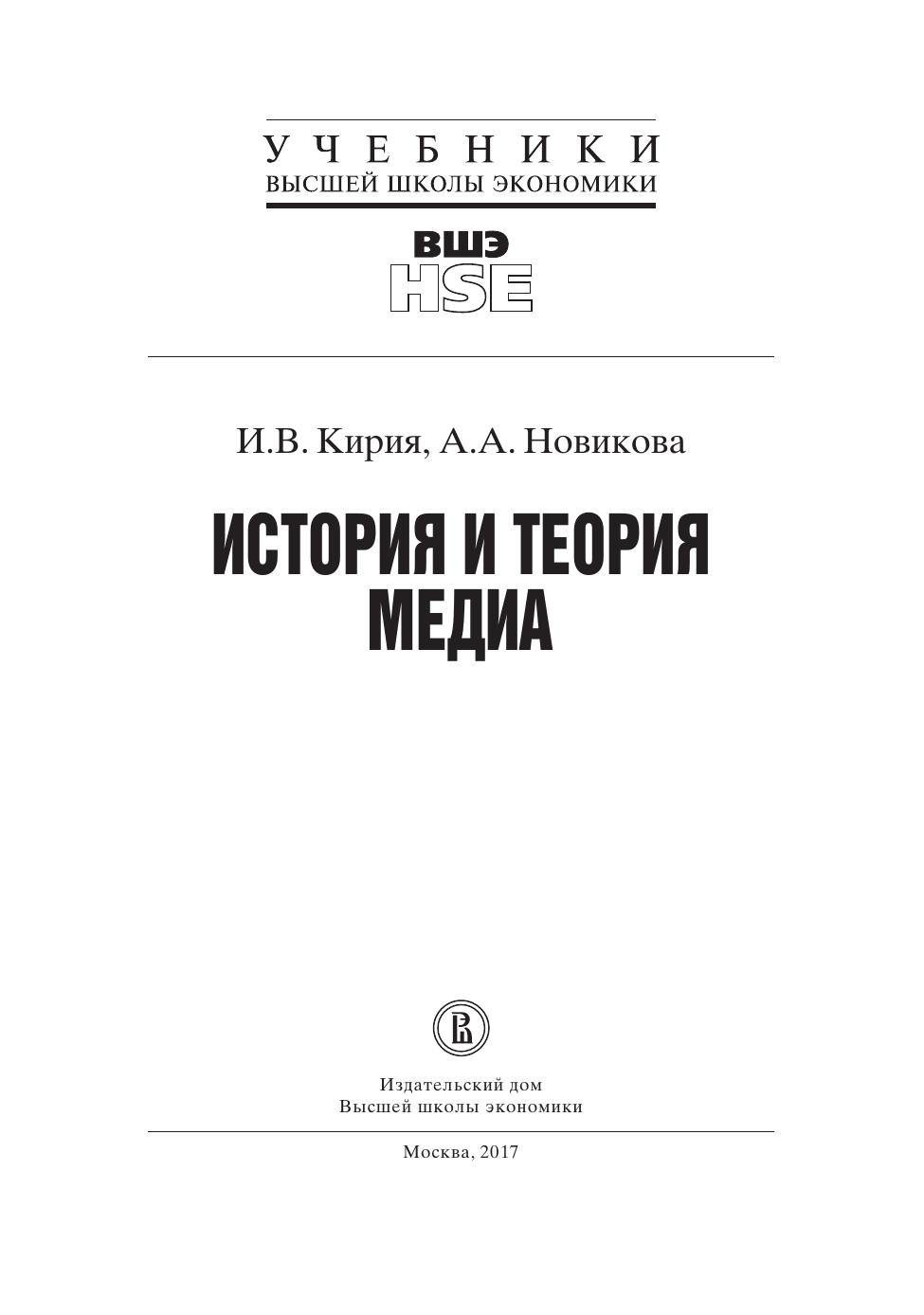 В настоящем учебнике обозначен междисциплинарный характер медиаисследований и собрано воедино теоретическое и историческое наследие, связанное с изучением коммуникаций. Авторы показывают значимость средств коммуникаций, различных медианосителей и эстетических форм медиаконтента в развитии социальных отношений и представляют обширную теоретическую палитру подходов к исследованию роли медиа в общественных системах. Учебник состоит из двух больших частей. Первая посвящена историческим аспектам развития медиа и обществ; вторая — обзору теорий медиа, которые объединены по так называемым теоретическим группам. Каждая часть снабжена списком контрольных вопросов и заданий для проверки знаний. Учебник предназначен для студентов высших учебных заведений, обучающихся по направлениям «медиакоммуникации», «журналистика», «реклама и связи с общественностью». Кроме того, он может быть рекомендован для ознакомления студентам по другим направлениям социальных и гуманитарных наук (социология, политические науки, философия и т.п.).