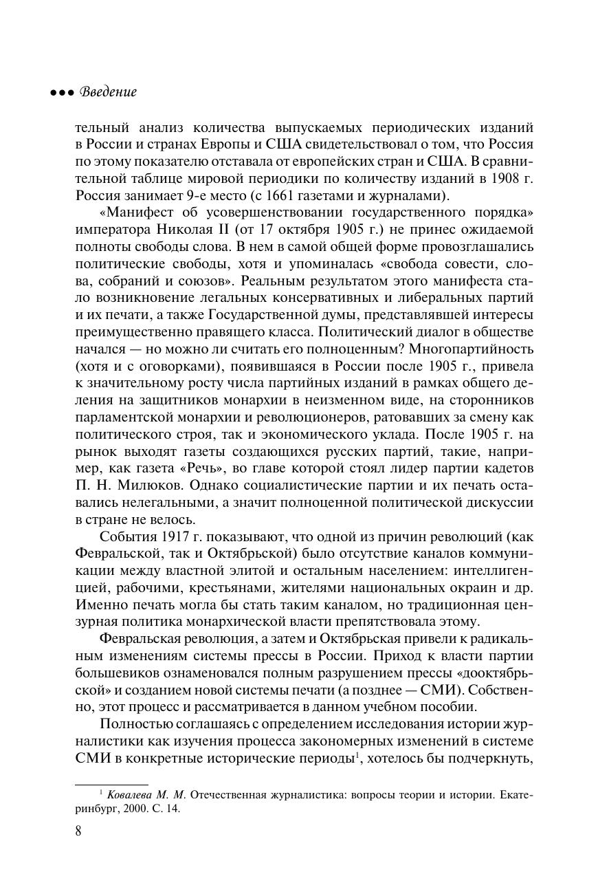 В учебном пособии рассматриваются трансформации российской системы СМИ в первой половине XX века. Анализируется функционирование системы печати в период Временного правительства, затем формирование систем печати большевиков, белых армий и русского зарубежья. Дается характеристика системы партийно-советских СМИ, ее функций и методов партийного руководства. Рассматриваются особенности функционирования системы СМИ в периоды НЭПа, индустриализации и коллективизации, а также в годы Великой Отечественной войны. Для преподавателей и студентов факультетов журналистики, изучающих курс «История российской журналистики».