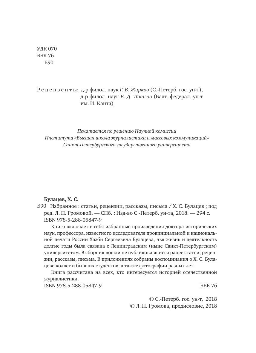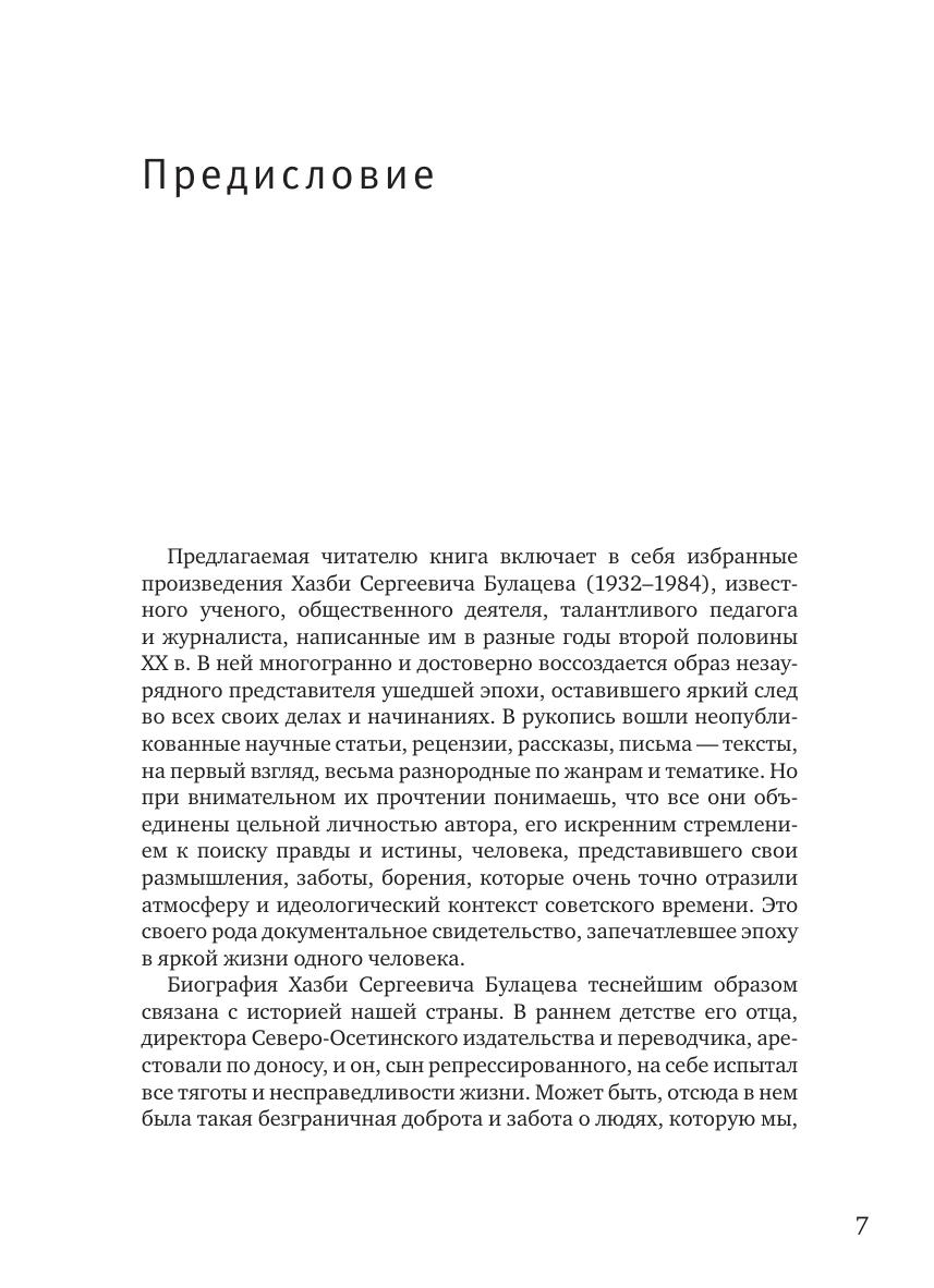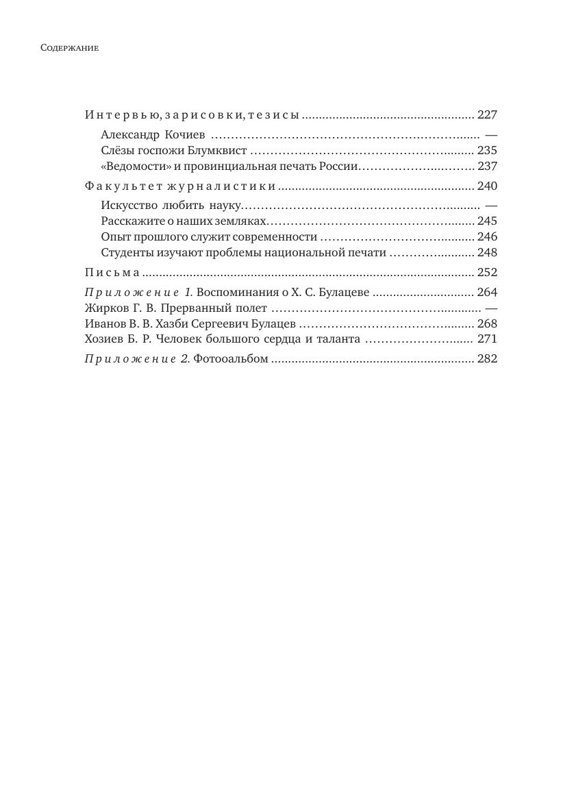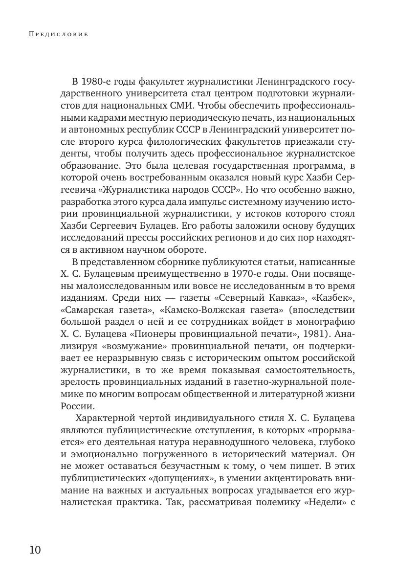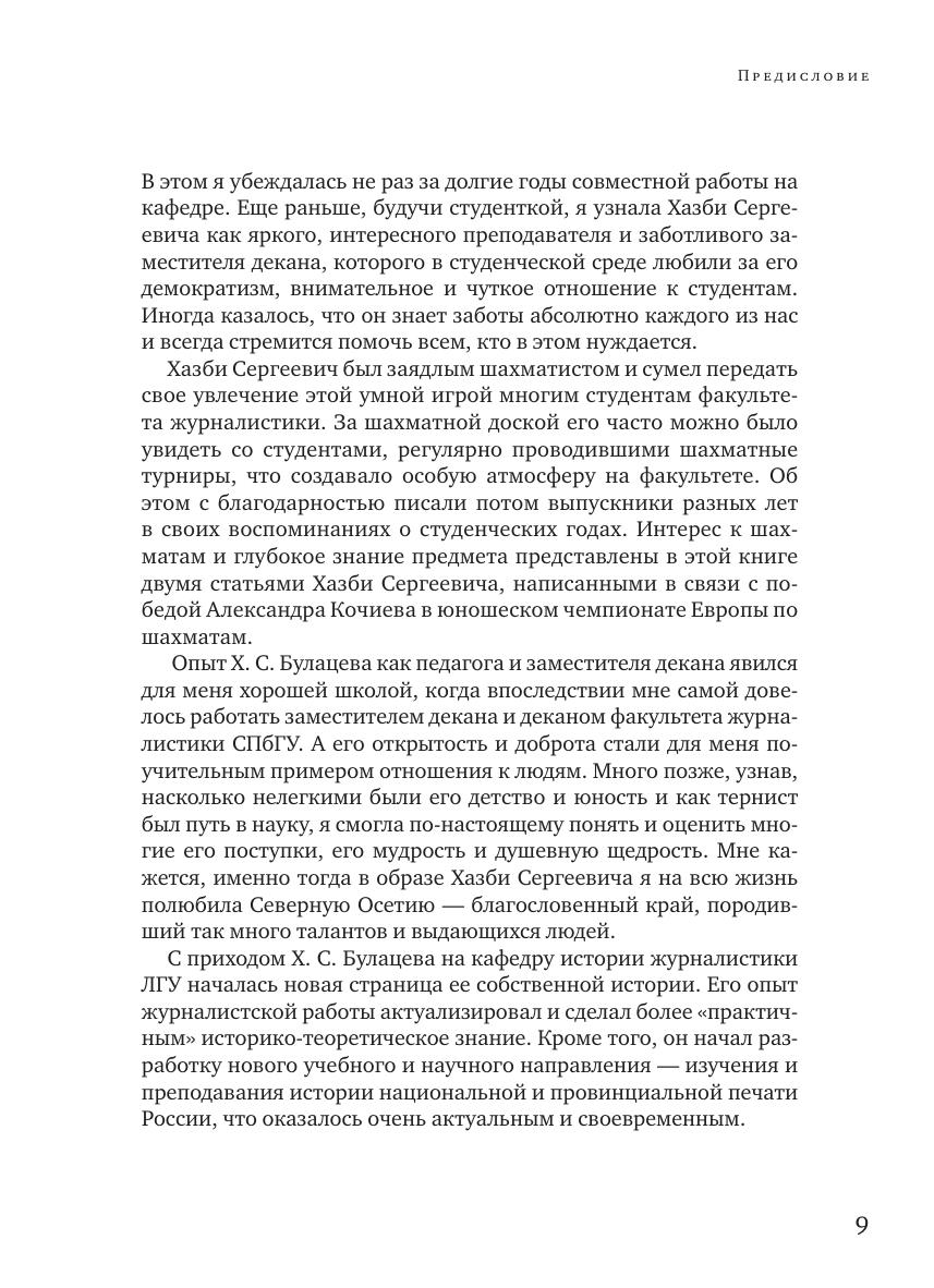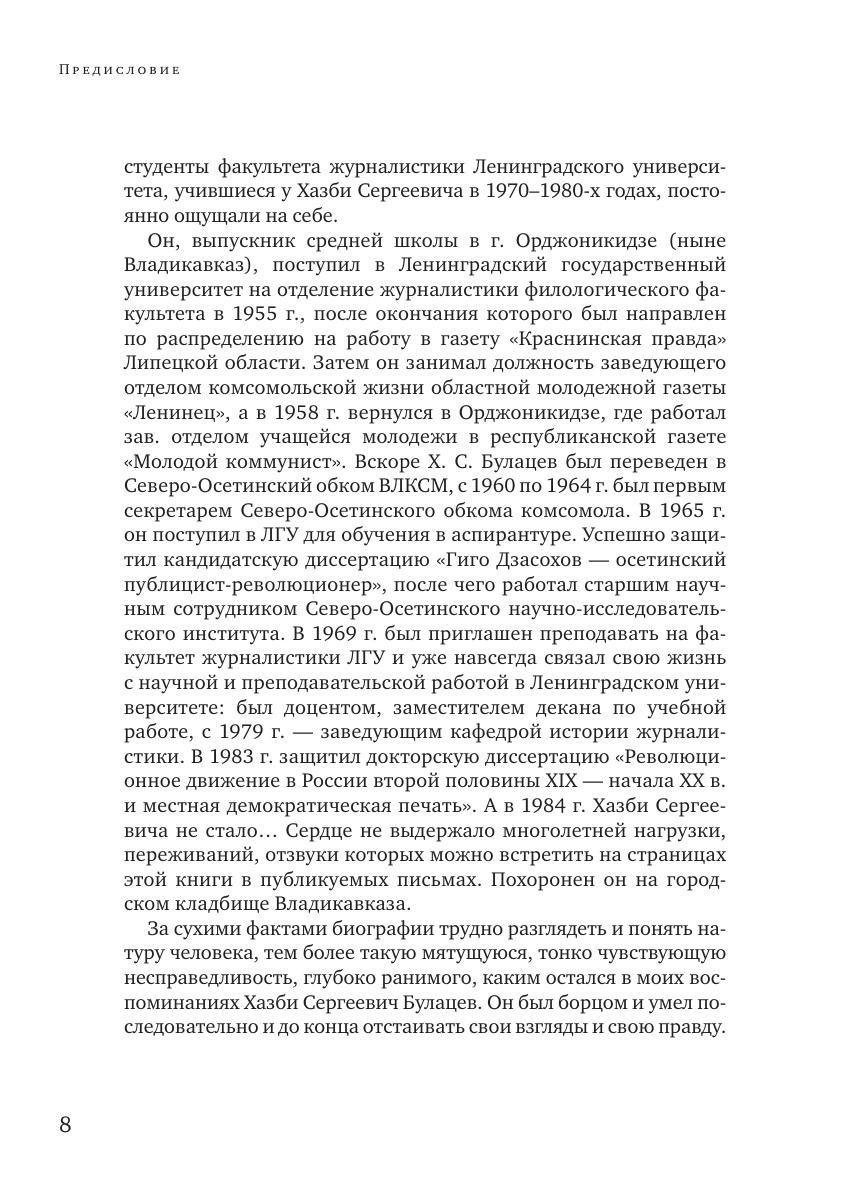 Книга включает в себя избранные произведения доктора исторических наук, профессора, известного исследователя провинциальной и национальной печати России Хазби Сергеевича Булацева, чья жизнь и деятельность долгие годы была связана с Ленинградским (ныне Санкт-Петербургским) университетом. В сборник вошли не публиковавшиеся ранее статьи, рецензии, рассказы, письма. В приложениях собраны воспоминания о Х. С. Булацеве коллег и бывших студентов, а также фотографии разных лет. Книга рассчитана на всех, кто интересуется историей отечественной журналистики.