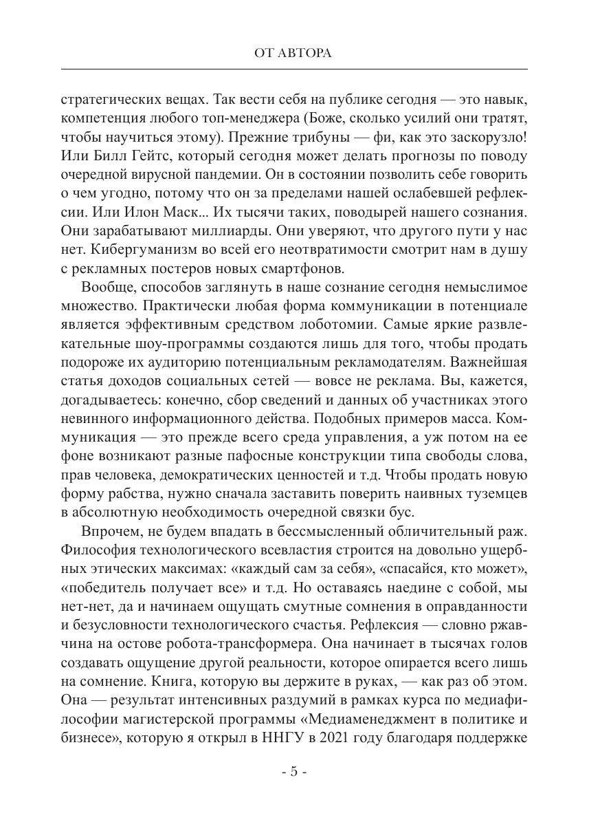 Кибергуманизм» — термин, характеризующий агрессивную сущность коммуникативных технологий, направленных на подчинение человека изощренным средствам коммуникации. Медиа, опираясь на миллиардные доходы поддерживающих их корпораций, стали настоящими лидерами общественной динамики. В состоянии ли человек сопротивляться этим процессам? Автор книги выражает осторожный оптимизм: человеку на протяжении всей истории не раз приходилось прорываться сквозь давление идеологий и технологий.