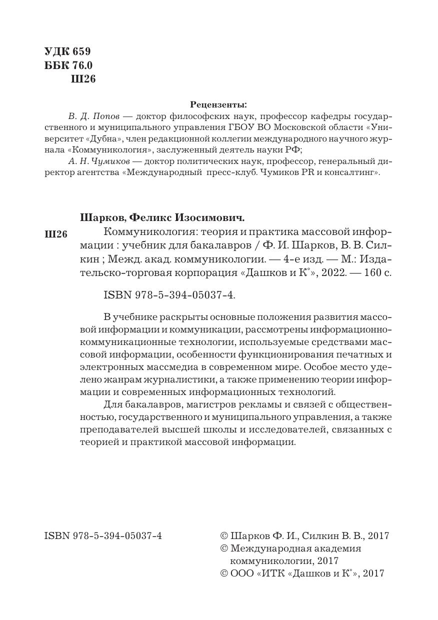 В учебнике раскрыты основные положения развития массовой информации и коммуникации, рассмотрены информационно-коммуникационные технологии, используемые средствами массовой информации, особенности функционирования печатных и электронных массмедиа в современном мире. Особое место уделено жанрам журналистики, а также применению теории информации и современных информационных технологий. Для бакалавров, магистров рекламы и связей с общественностью, государственного и муниципального управления, а также преподавателей высшей школы и исследователей, связанных с теорией и практикой массовой информации.