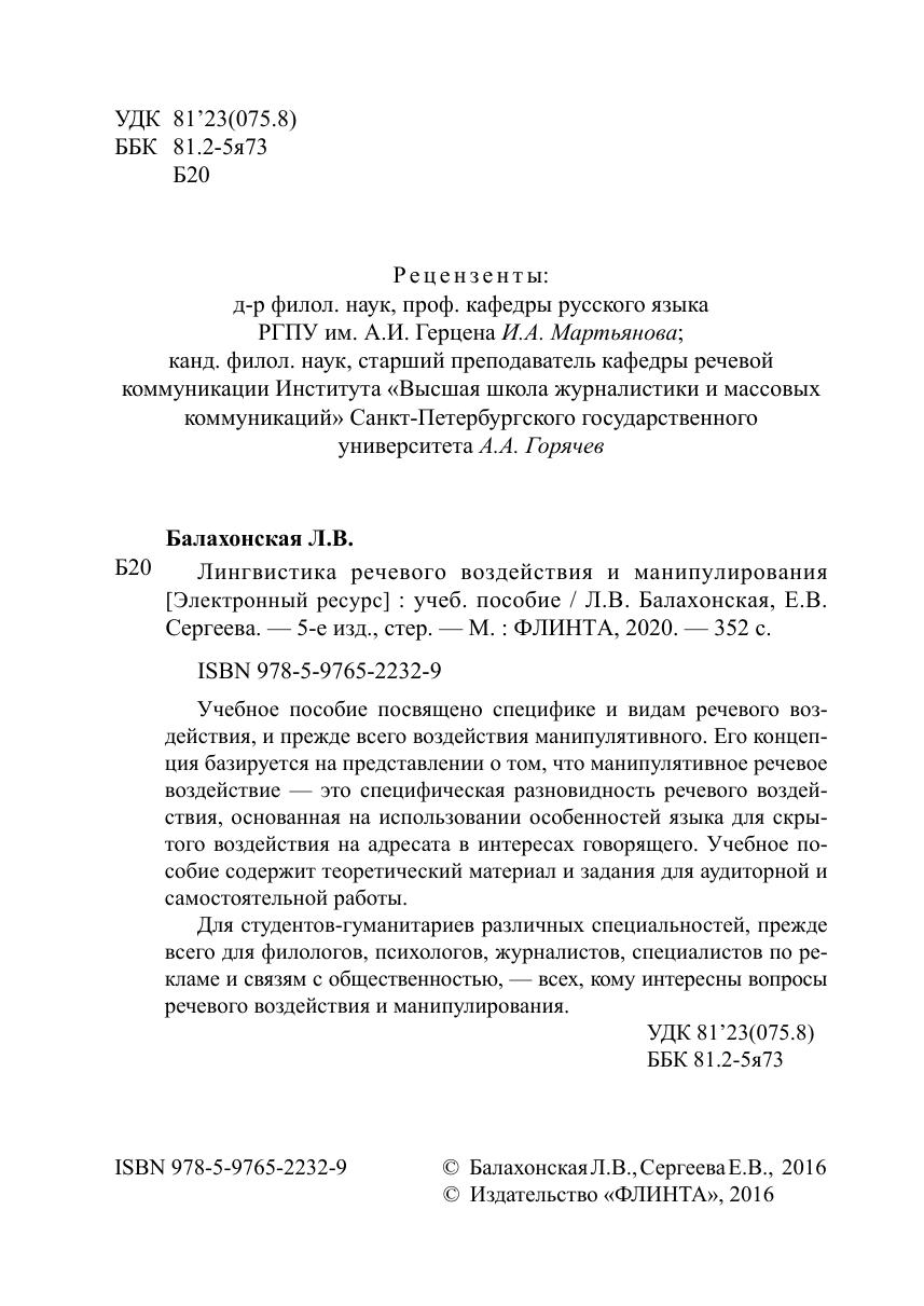 Учебное пособие посвящено специфике и видам речевого воздействия, и прежде всего воздействия манипулятивного. Его концепция базируется на представлении о том, что манипулятивное речевое воздействие — это специфическая разновидность речевого воздействия, основанная на использовании особенностей языка для скрытого воздействия на адресата в интересах говорящего. Учебное пособие содержит теоретический материал и задания для аудиторной и самостоятельной работы.