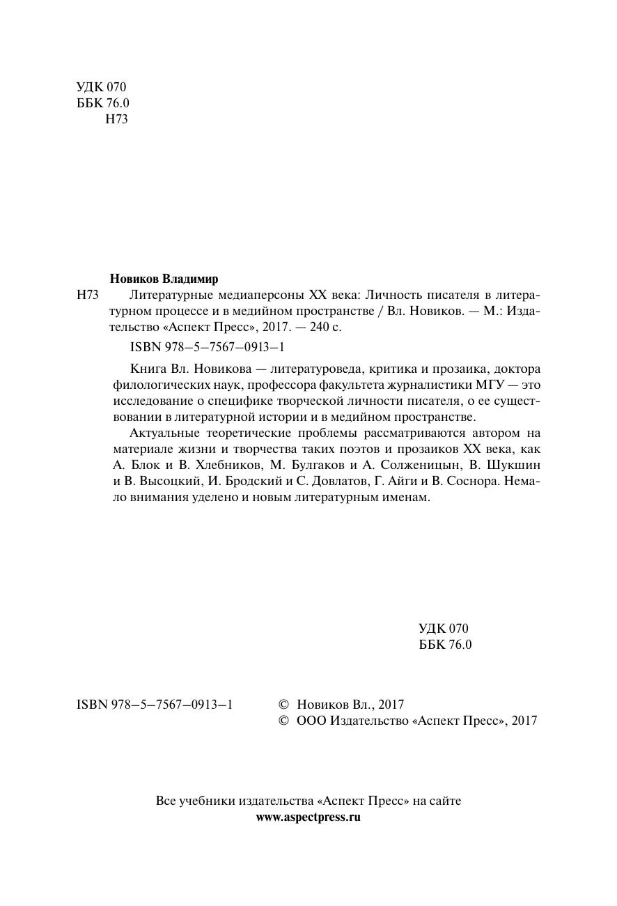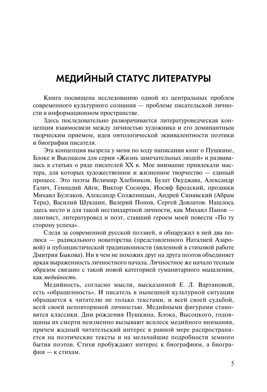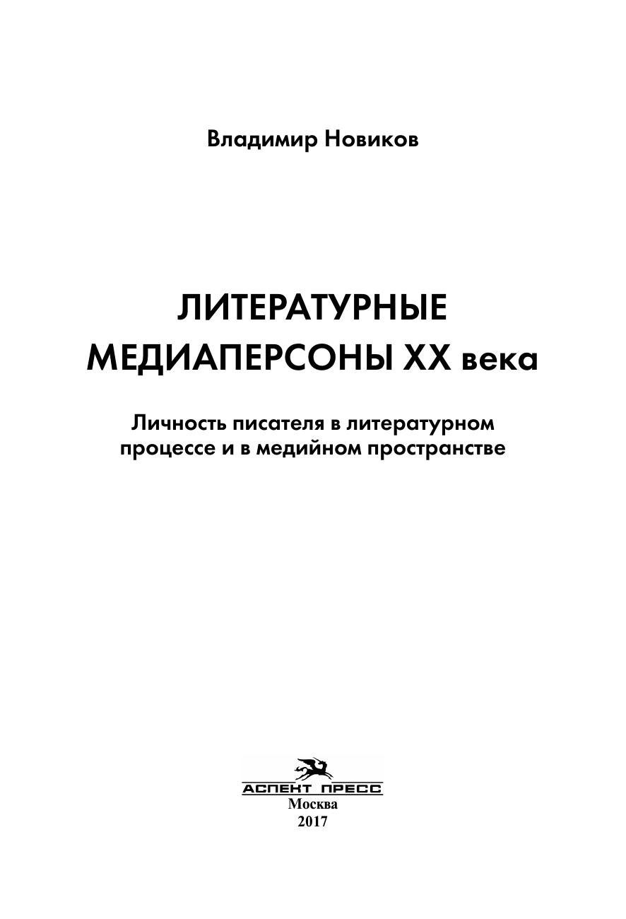 Книга Вл. Новикова — литературоведа, критика и прозаика, доктора филологических наук, профессора факультета журналистики МГУ — это исследование о специфике творческой личности писателя, о ее существовании в литературной истории и в медийном пространстве. Актуальные теоретические проблемы рассматриваются автором на материале жизни и творчества таких поэтов и прозаиков ХХ века, как А. Блок и В. Хлебников, М. Булгаков и А. Солженицын, В. Шукшин и В. Высоцкий, И. Бродский и С. Довлатов, Г. Айги и В. Соснора. Немало внимания уделено и новым литературным именам.