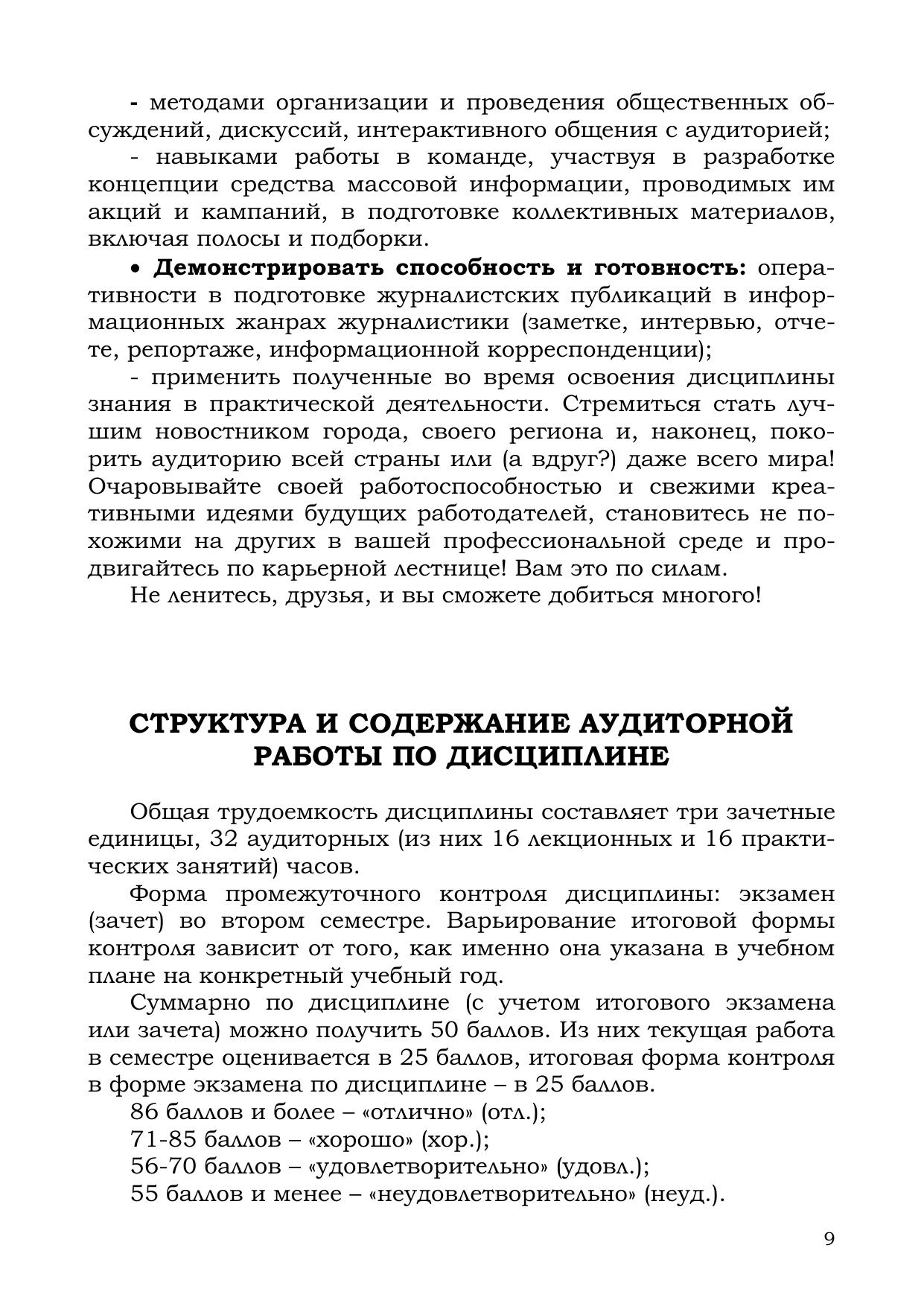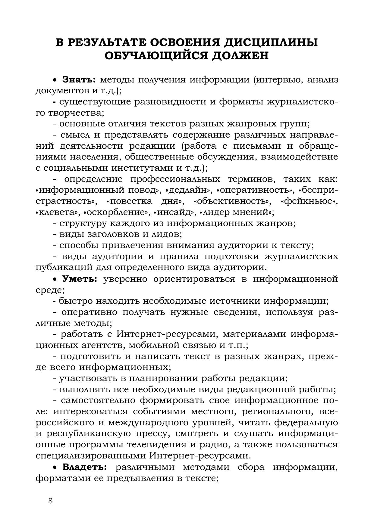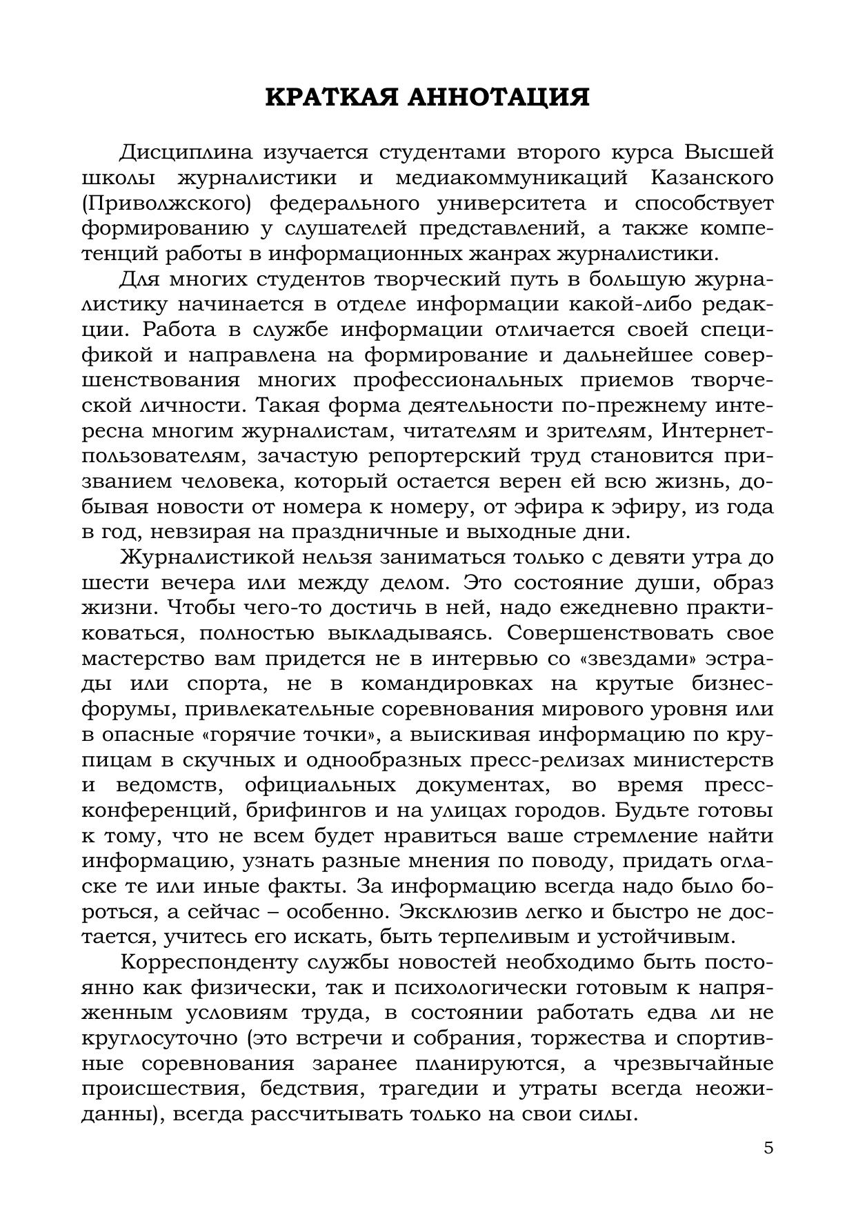 Учебное пособие предлагает технологию работы современного журналиста новостной редакции: от творческого замысла до реализации идеи в каждом из информационных жанров журналистики. Не имея опыта и навыков журналисткой деятельности, вы сможете сделать первые шаги в мир медиа, почувствовать себя журналистом. Кому будет полезна эта книга? Студентам вузов, обучающимся по направлениям высшего образования «Журналистика», «Телевидение» и «Медиакоммуникации» по очной и заочной формам обучения всех профилей подготовки. Учащимся школ молодого журналиста и различных профильных классов при вузах, общеобразовательных школах и центрах детского и молодежного творчества, а также для их медийных педагогов, вместе со своими воспитанниками постигающих азы нелегкой и неоднозначно воспринимаемой современным обществом профессии журналиста.