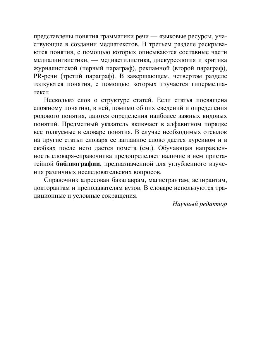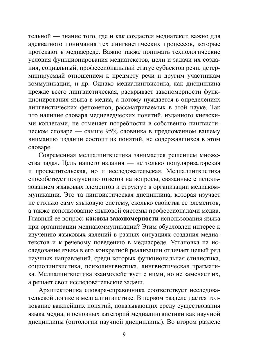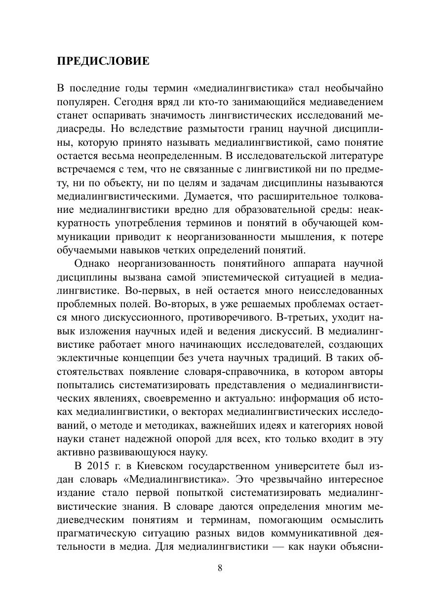 Словарь-справочник по медиалингвистике издается в России впервые. Он отражает четыре направления медиалингвистики: критику медиаречи, грамматику медиаречи, медиастилистику и медиалингводискурсологию. В словаре упорядочены и систематизированы имеющиеся в исследовательской литературе медиалингвистические идеи, впервые представлены дискуссионные вопросы медиалингвистики. Словарь характеризуется речеведческой направленностью, что актуально для современного языкознания.