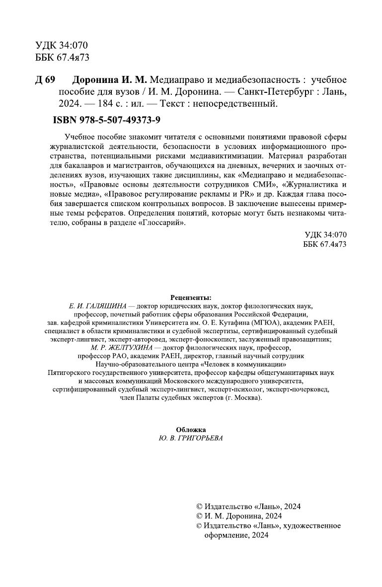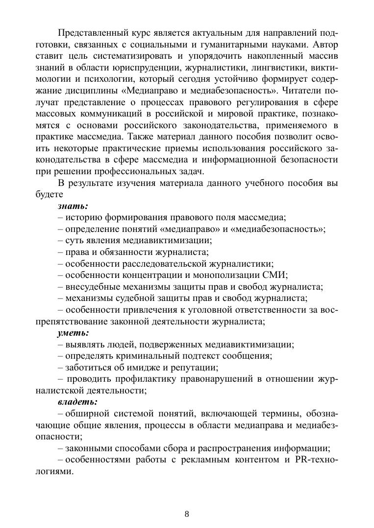 Учебное пособие знакомит читателя с основными понятиями правовой сферы журналистской деятельности, безопасности в условиях информационного пространства, потенциальными рисками медиавиктимизации. Материал разработан для бакалавров и магистрантов, обучающихся на дневных, вечерних и заочных отделениях вузов, изучающих такие дисциплины, как «Медиаправо и медиабезопасность», «Правовые основы деятельности сотрудников СМИ», «Журналистика и новые медиа», «Правовое регулирование рекламы и PR» и др. Каждая глава пособия завершается списком контрольных вопросов. В заключение вынесены примерные темы рефератов. Определения понятий, которые могут быть незнакомы читателю, собраны в разделе «Глоссарий».