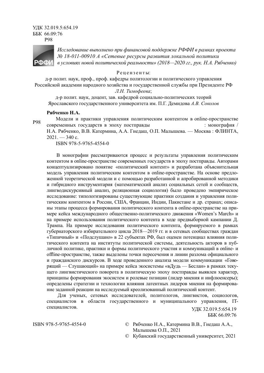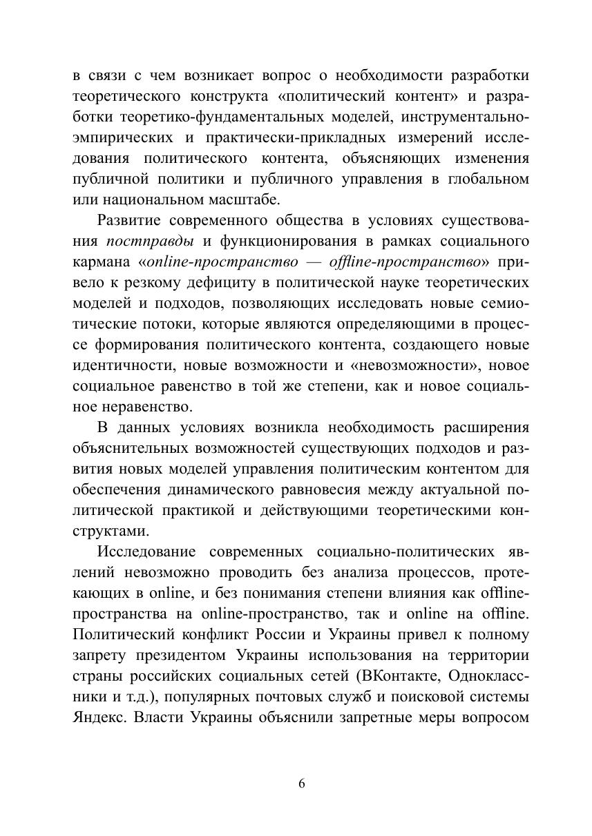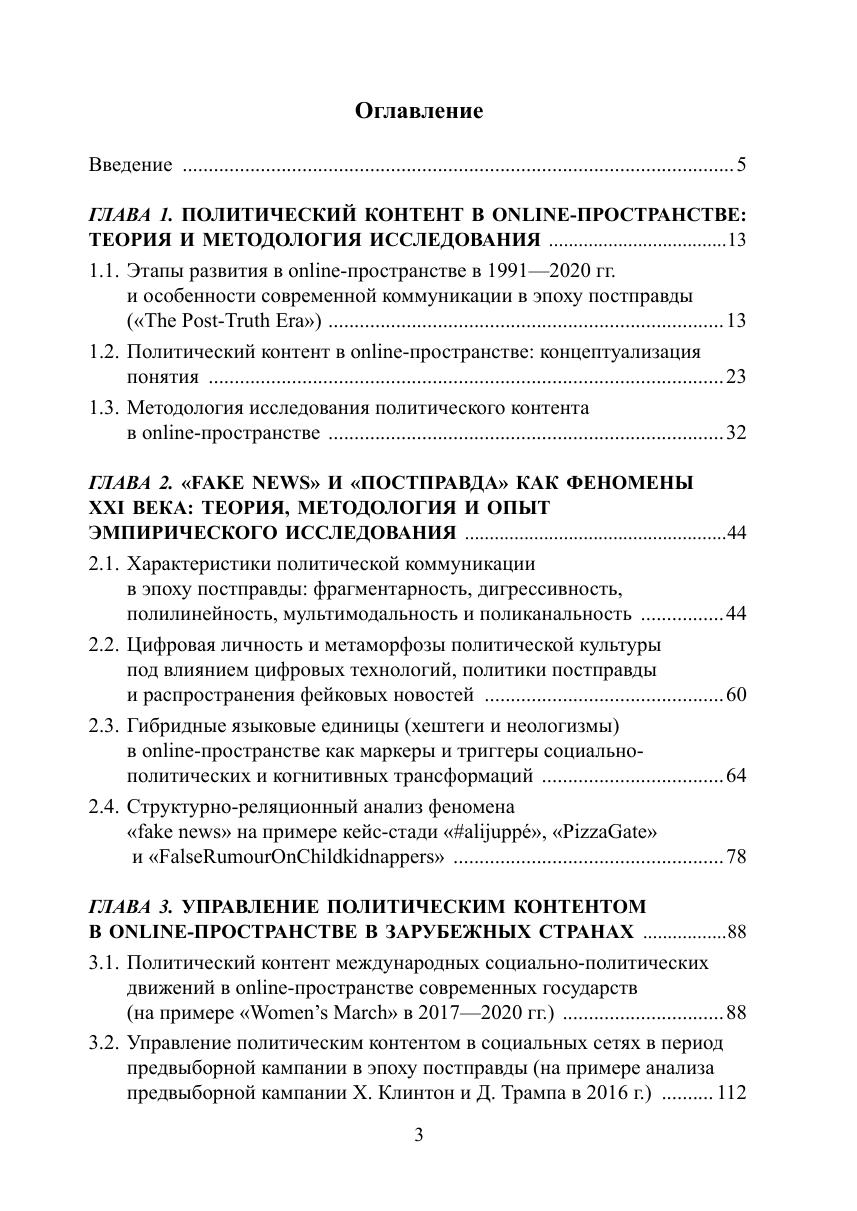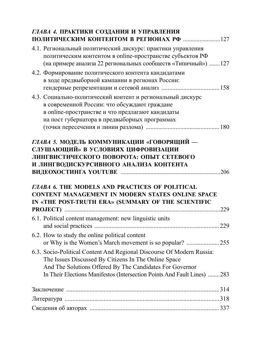 В монографии рассматриваются процесс и результаты управления политическим контентом в online-пространстве современных государств в эпоху постправды. Авторами концептуализировано понятие «политический контент» и разработана объяснительная модель управления политическим контентом в online-пространстве. На основе предложенной теоретической модели и с помощью разработанной и апробированной методики и гибридного инструментария (математический анализ социальных сетей и сообществ, лингводискурсивный анализ, реляционная социология) было проведено эмпирическое исследование: типологизированы существующие практики создания и управления поли-тическим контентом в России, США, Франции, Индии, Пакистане и др. странах; описаны этапы процесса формирования политического контента в online-пространстве на примере кейса международного общественно-политического движения «Women’s March» и на примере использования политического контента в ходе предвыборной кампании Д. Трампа. На примере исследования политического контента, формируемого в рамках губернаторского избирательного цикла 2018—2019 гг. и в сетевых сообществах граждан «Типичный» и «Подслушано» в 22 субъектах РФ, был оценен потенциал влияния политического контента на институты политической системы, деятельность акторов в публичной политике, практики и формы политического участия и коммуникаций в online- и offline-пространстве, также выделены точки пересечения и линии разлома официального и гражданского дискурсов. В ходе проведенного анализа модели коммуникации «Говорящий — Слушающий» на примере кейса экосистемы «вДудь — Беслан» в рамках текущего лингвистического поворота в политическую эпоху постправды выявлен характер, принципы формирования экосистем и ролевые позиции (лидер мнения и инфлюенсеры); определены стратегии и технологии влияния латентных лидеров мнения на формирование заданной реакции на исследуемый креолизованный политический контент.