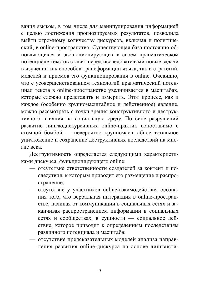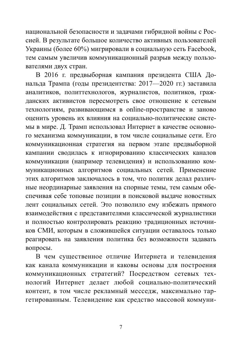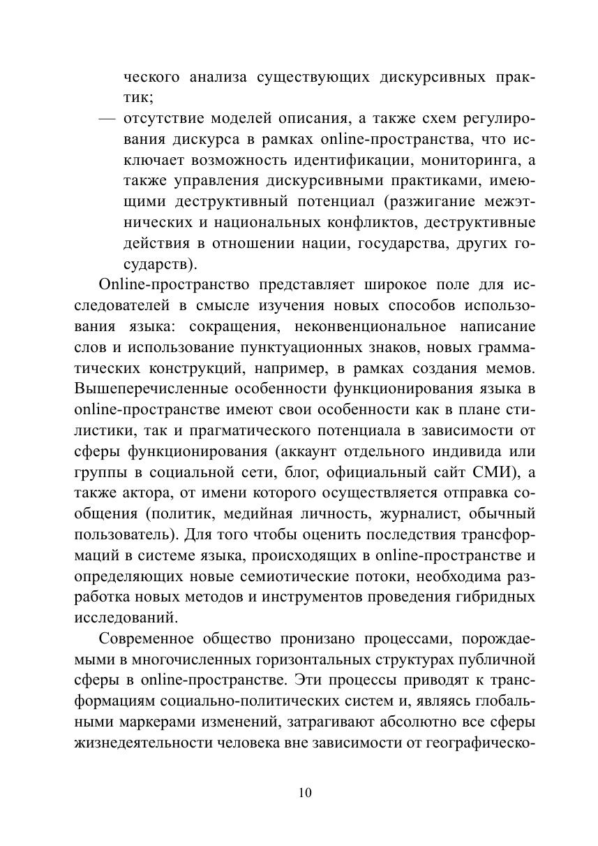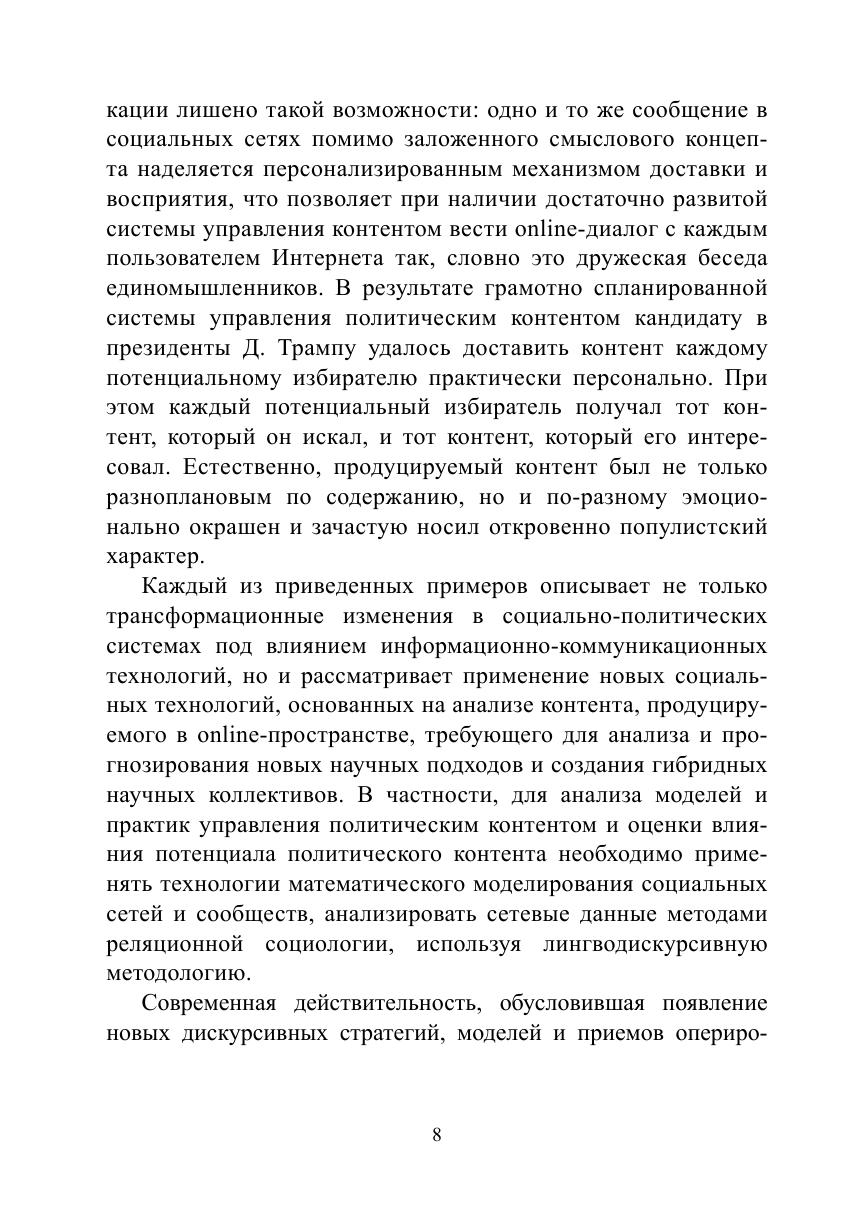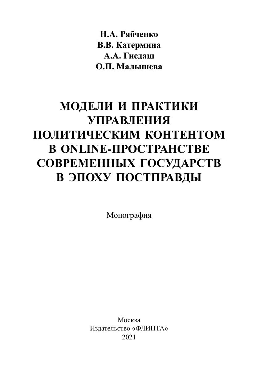 В монографии рассматриваются процесс и результаты управления политическим контентом в online-пространстве современных государств в эпоху постправды. Авторами концептуализировано понятие «политический контент» и разработана объяснительная модель управления политическим контентом в online-пространстве. На основе предложенной теоретической модели и с помощью разработанной и апробированной методики и гибридного инструментария (математический анализ социальных сетей и сообществ, лингводискурсивный анализ, реляционная социология) было проведено эмпирическое исследование: типологизированы существующие практики создания и управления поли-тическим контентом в России, США, Франции, Индии, Пакистане и др. странах; описаны этапы процесса формирования политического контента в online-пространстве на примере кейса международного общественно-политического движения «Women’s March» и на примере использования политического контента в ходе предвыборной кампании Д. Трампа. На примере исследования политического контента, формируемого в рамках губернаторского избирательного цикла 2018—2019 гг. и в сетевых сообществах граждан «Типичный» и «Подслушано» в 22 субъектах РФ, был оценен потенциал влияния политического контента на институты политической системы, деятельность акторов в публичной политике, практики и формы политического участия и коммуникаций в online- и offline-пространстве, также выделены точки пересечения и линии разлома официального и гражданского дискурсов. В ходе проведенного анализа модели коммуникации «Говорящий — Слушающий» на примере кейса экосистемы «вДудь — Беслан» в рамках текущего лингвистического поворота в политическую эпоху постправды выявлен характер, принципы формирования экосистем и ролевые позиции (лидер мнения и инфлюенсеры); определены стратегии и технологии влияния латентных лидеров мнения на формирование заданной реакции на исследуемый креолизованный политический контент.