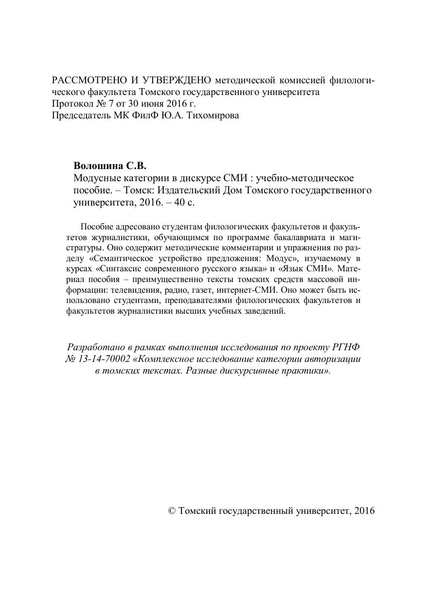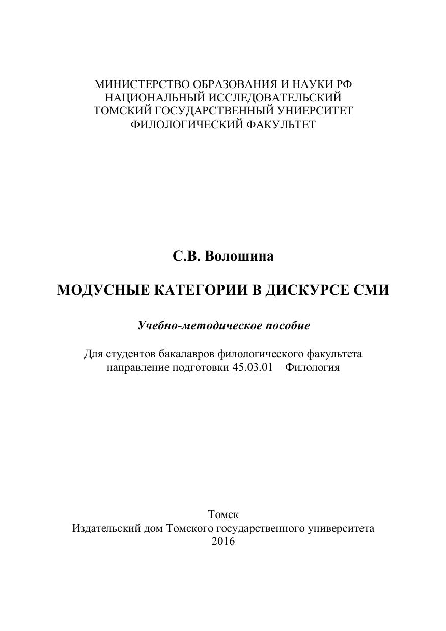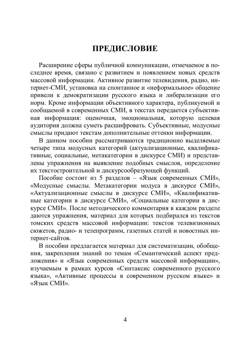 Пособие адресовано студентам филологических факультетов и факультетов журналистики, обучающимся по программе бакалавриата и магистратуры. Оно содержит методические комментарии и упражнения по разделу «Семантическое устройство предложения: Модус», изучаемому в курсах «Синтаксис современного русского языка» и «Язык СМИ». Материал пособия – преимущественно тексты томских средств массовой информации: телевидения, радио, газет, интернет-СМИ. Оно может быть использовано студентами, преподавателями филологических факультетов и факультетов журналистики высших учебных заведений.