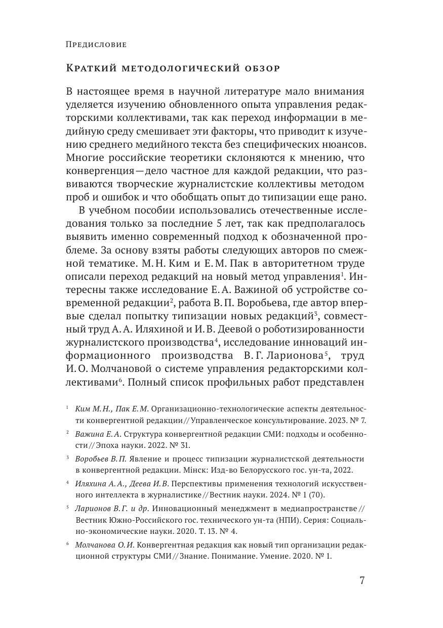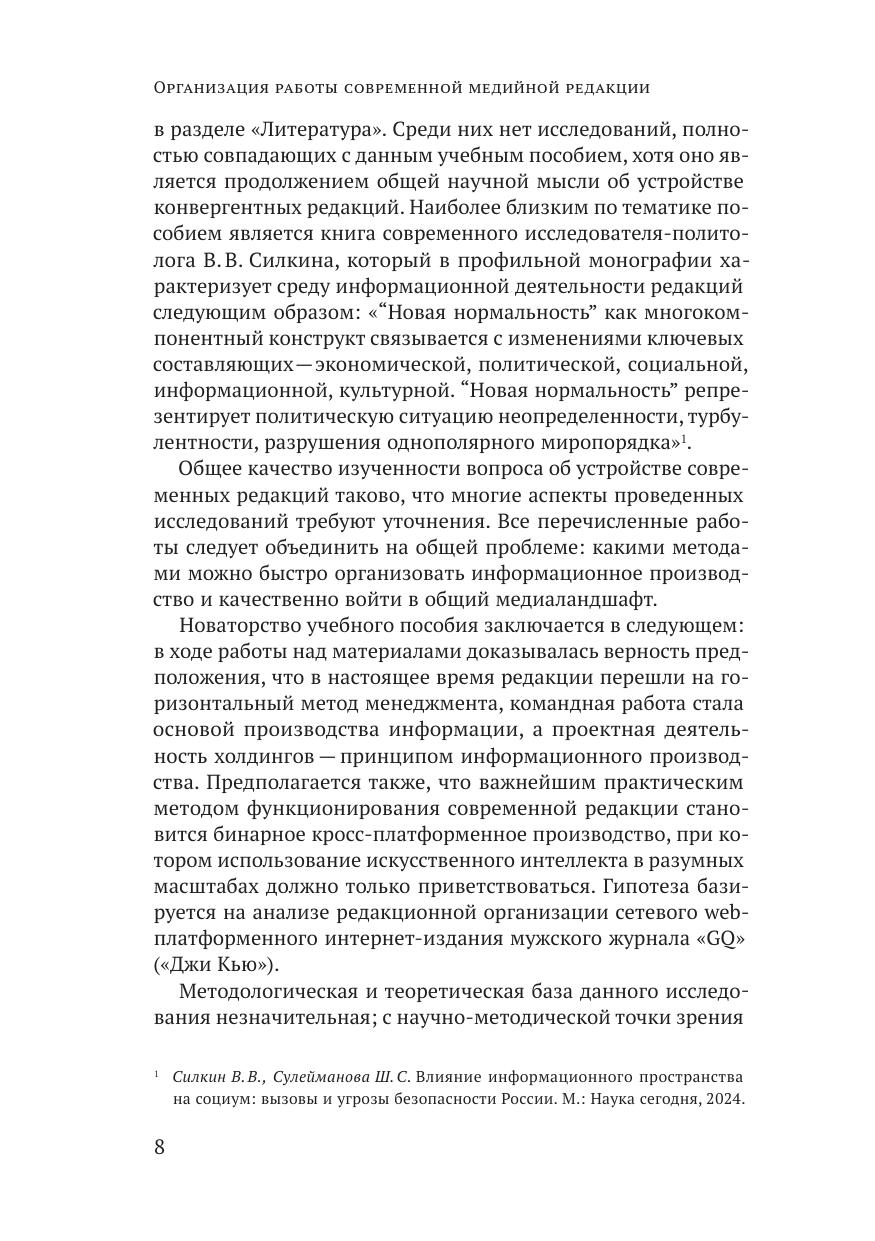 В книге актуализируется вопрос о глобальных изменениях, которые происходят в сфере организации деятельности современной медийной редакции. Подобного рода темы нечасто обращают на себя внимание отечественных исследователей: принято считать, что осуществляемые в редакторских коллективах модернизации управления стихийны, ведь они связаны с непредсказуемым вектором развития технического прогресса, поэтому описать их с точки зрения научных предположений проблематично. Переход от «вертикального» строения творческих коллективов редакции к «горизонтальному» уже завершен и описан в научной литературе, но типизация нового устройства и новых принципов руководства современной редакцией еще не приобрела структурно-научную целостность.