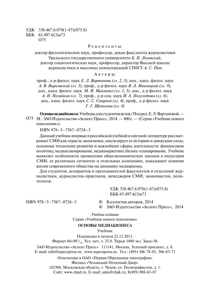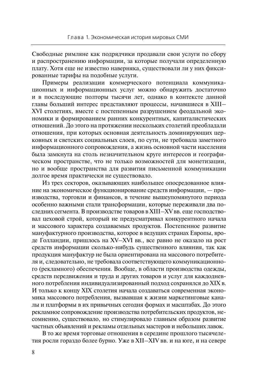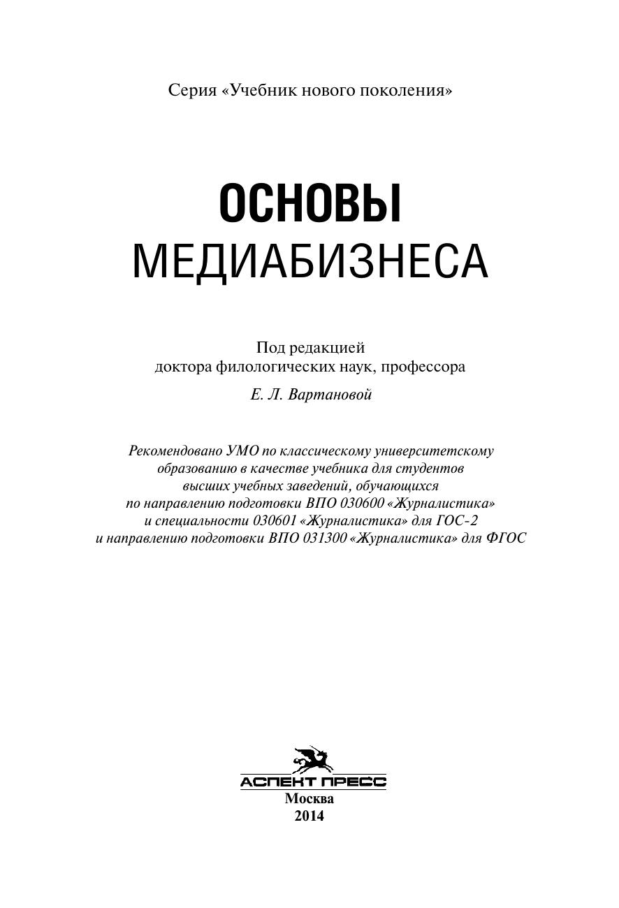 Данный учебник впервые в российской учебной и научной литературе рассматривает СМИ как отрасль экономики, анализирует ее историю и движущие силы, основные тенденции развития и важнейшие сферы деятельности: финансовую политику, медиапланирование, медиамаркетинг, бизнес-планирование. Учебник выявляет особенности проявления общеэкономических законов в индустрии СМИ, ее различных сегментах и отдельных компаниях, показывает влияние жизни современного общества на динамику медиарынка. Для студентов, аспирантов и преподавателей факультетов и отделений журналистики, журналистов?практиков, менеджеров СМИ, экономистов, политологов.