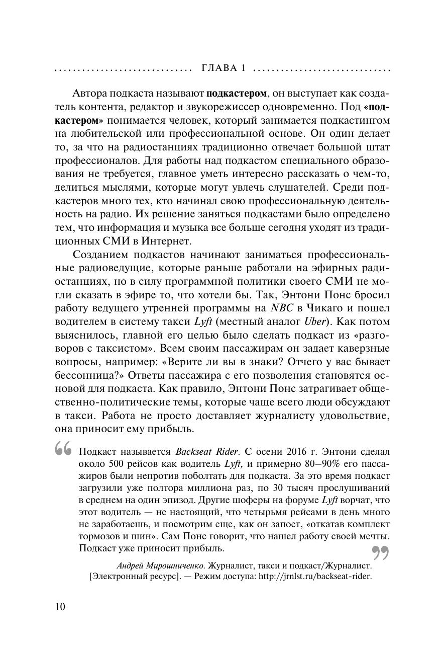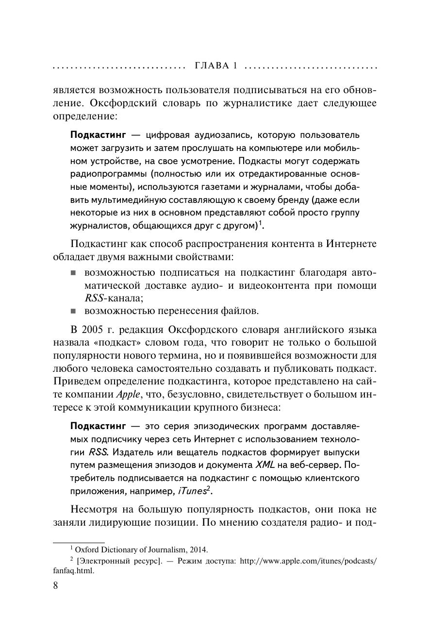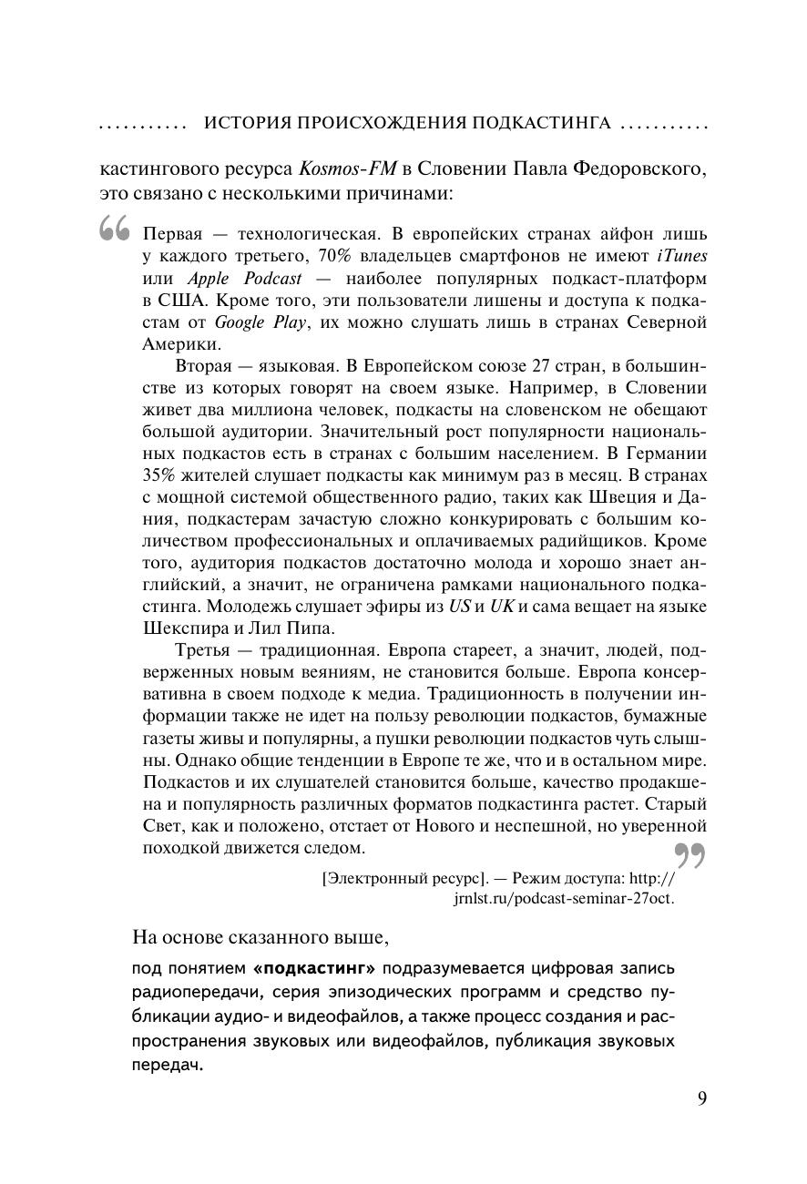 В учебном пособии подкастинг рассматривается в теоретическом и прикладном значении как новое медиа, сущестование которого стало возможно в условиях развития Интернета. Авторы уделили внимание истории происхождения подкастинга и его отличиям от радио, а также особенностям подкаста как речевого и интернет-жанра. Отдельное место в книге занимает технология создания подкастов. В приложении описываются подходы к созданию подкастов для начинающих журналистов и подкастеров (из зарубежного опыта). Книга предназначена студентам, журналистам, исследователям новых медиа, а также для широкого круга читателей.