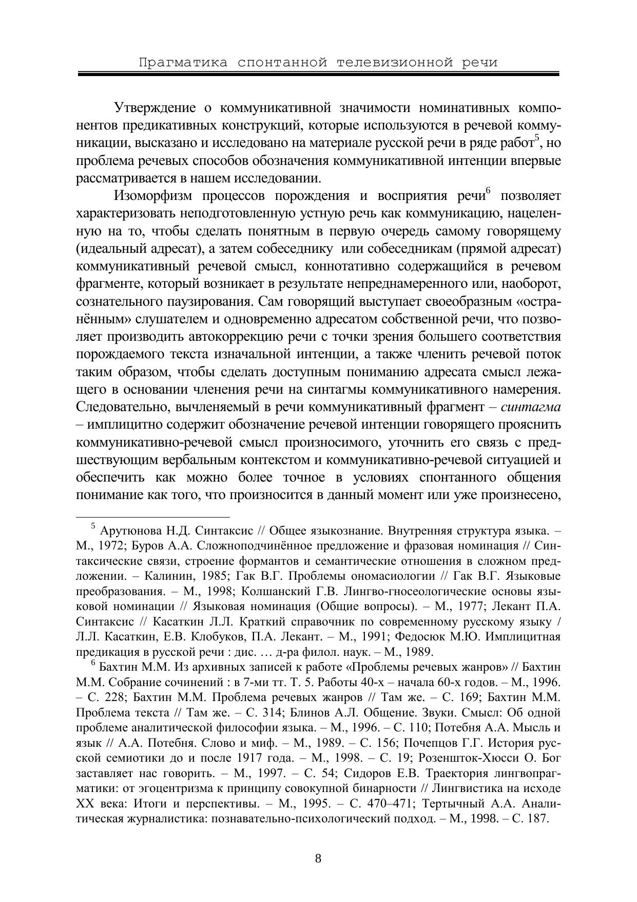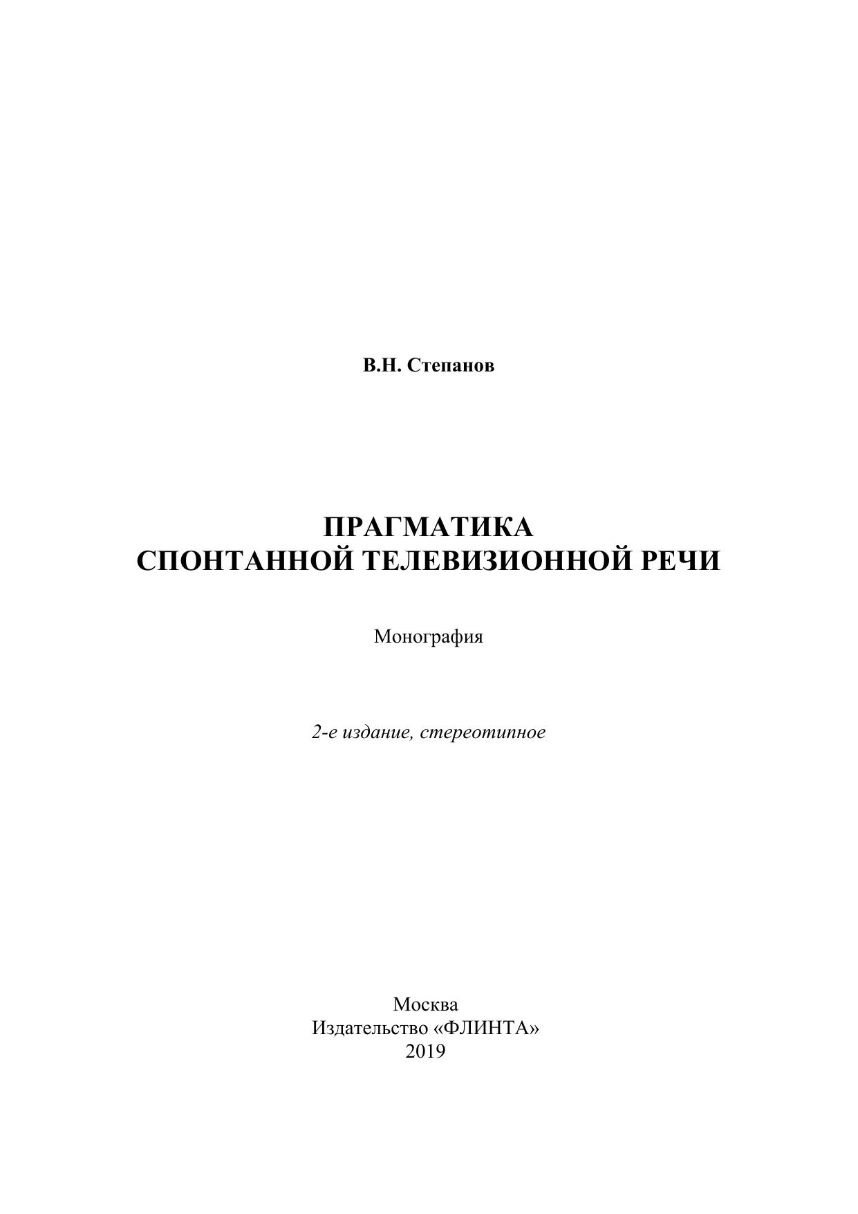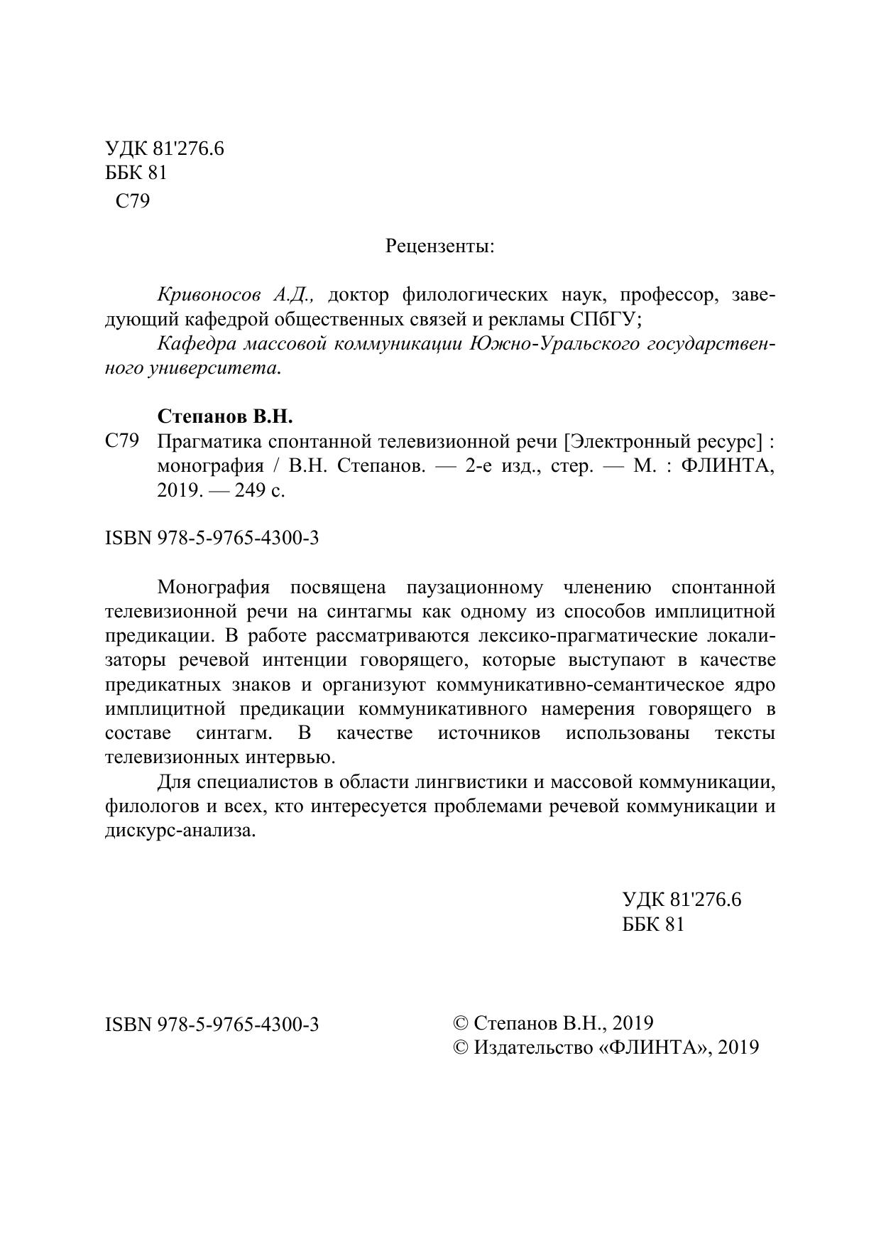 Монография посвящена паузационному членению спонтанной телевизионной речи на синтагмы как одному из способов имплицитной предикации. В работе рассматриваются лексико-прагматические локализаторы речевой интенции говорящего, которые выступают в качестве предикатных знаков и организуют коммуникативно-семантическое ядро имплицитной предикации коммуникативного намерения говорящего в составе синтагм. В качестве источников использованы тексты телевизионных интервью. Для специалистов в области лингвистики и массовой коммуникации, филологов и всех, кто интересуется проблемами речевой коммуникации и дискурс-анализа.