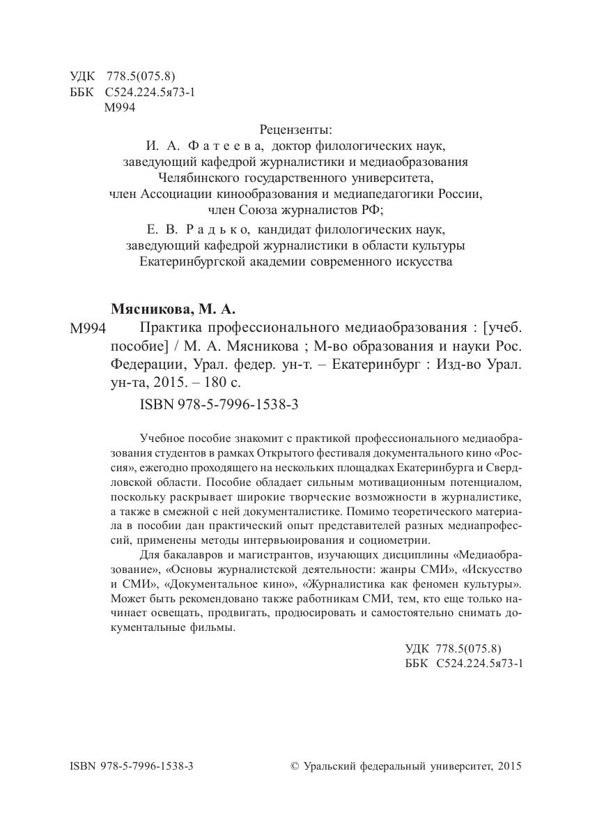 Учебное пособие знакомит с практикой профессионального медиаобразования студентов в рамках Открытого фестиваля документального кино «Россия», ежегодно проходящего на нескольких площадках Екатеринбурга и Свердловской области. Пособие обладает сильным мотивационным потенциалом, поскольку раскрывает широкие творческие возможности в журналистике, а также в смежной с ней документалистике. Помимо теоретического материала в пособии дан практический опыт представителей разных медиапрофессий, применены методы интервьюирования и социометрии. Для бакалавров и магистрантов, изучающих дисциплины «Медиаобразование», «Основы журналистской деятельности: жанры СМИ», «Искусство и СМИ», «Документальное кино», «Журналистика как феномен культуры». Может быть рекомендовано также работникам СМИ, тем, кто еще только начинает освещать, продвигать, продюсировать и самостоятельно снимать документальные фильмы.