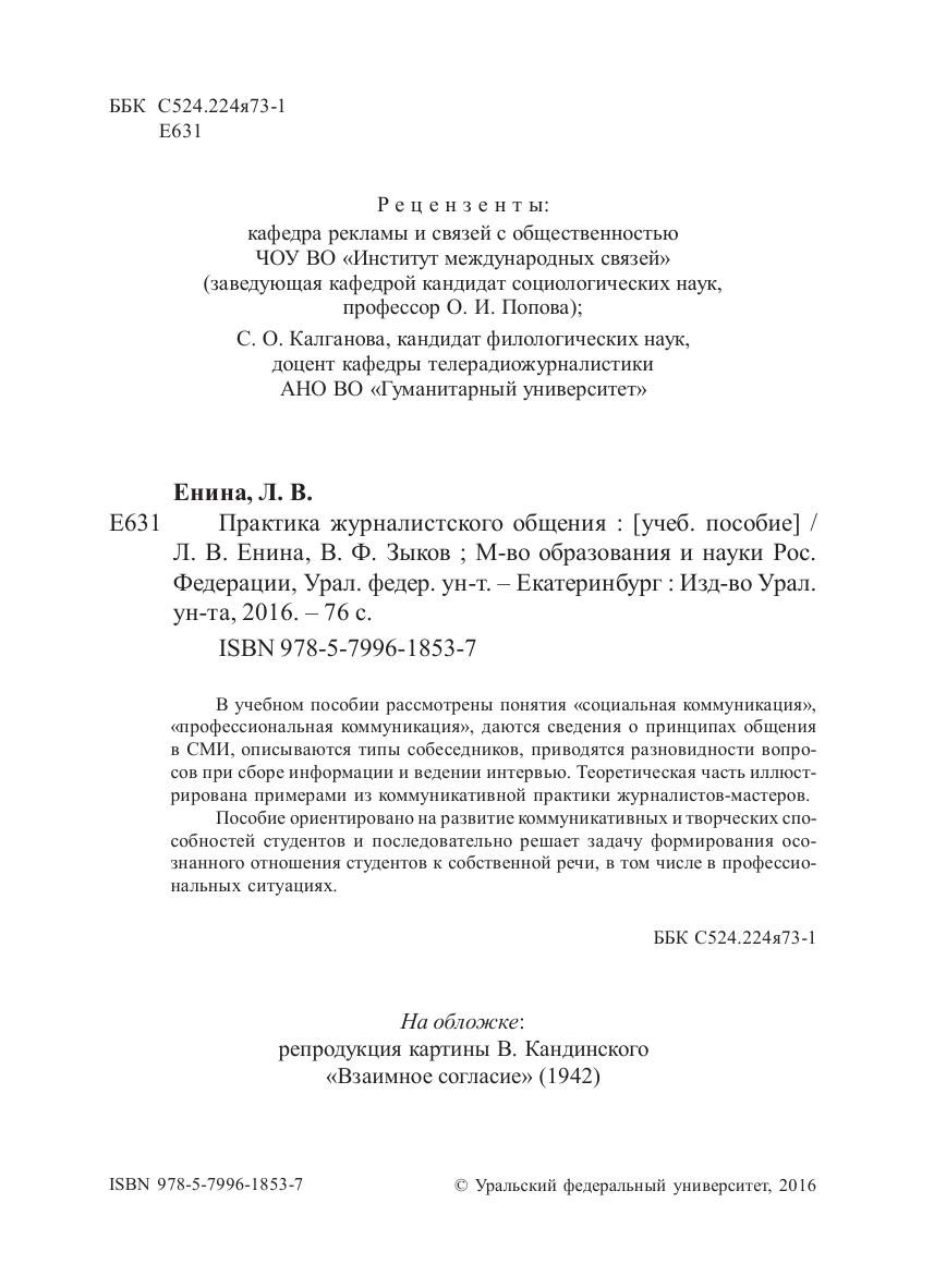 В учебном пособии рассмотрены понятия «социальная коммуникация», «профессиональная коммуникация», даются сведения о принципах общения в СМИ, описываются типы собеседников, приводятся разновидности вопросов при сборе информации и ведении интервью. Теоретическая часть иллюстрирована примерами из коммуникативной практики журналистов-мастеров. Пособие ориентировано на развитие коммуникативных и творческих способностей студентов и последовательно решает задачу формирования осознанного отношения студентов к собственной речи, в том числе в профессиональных ситуациях.