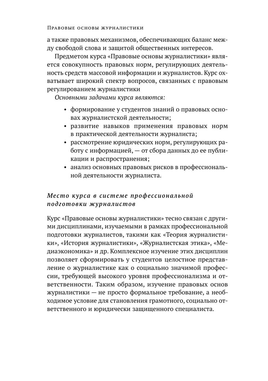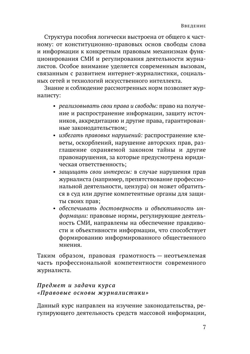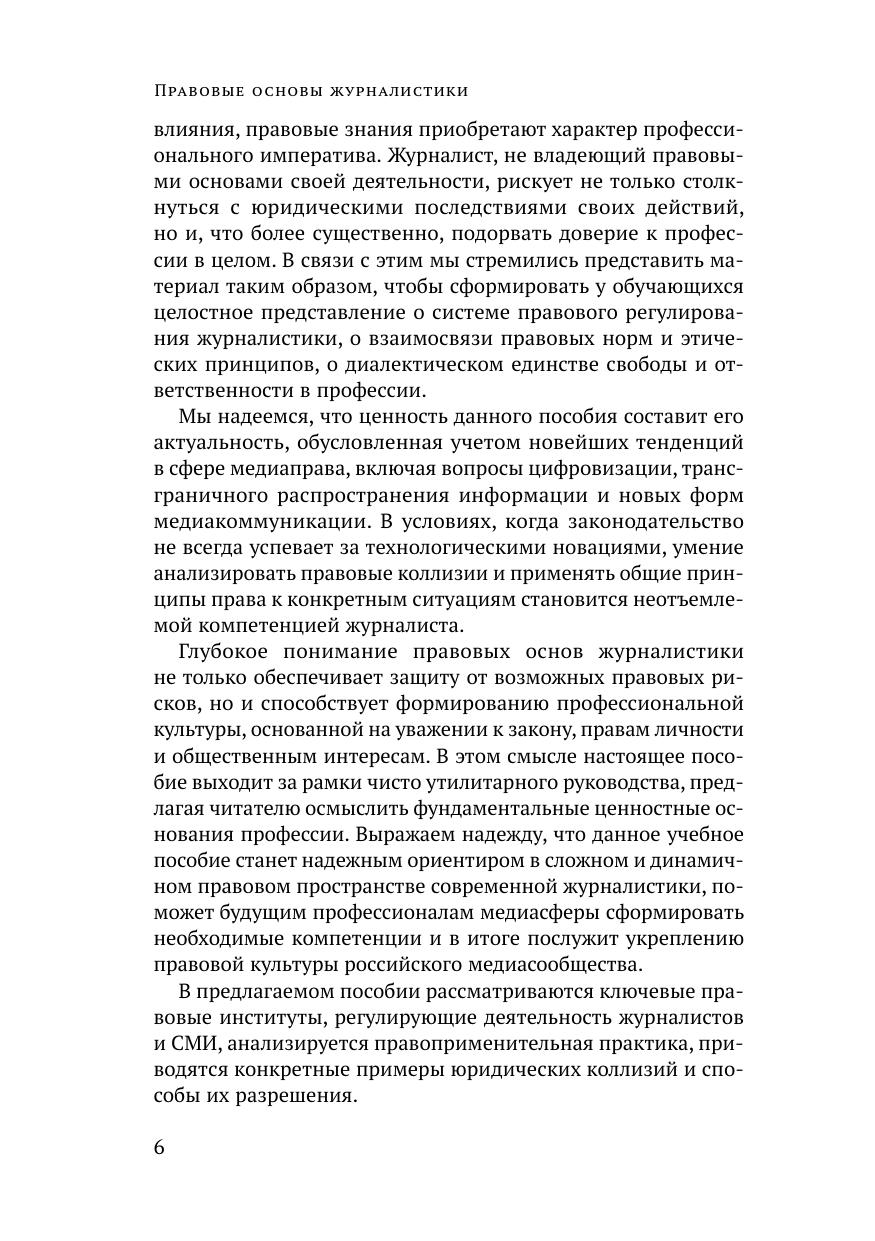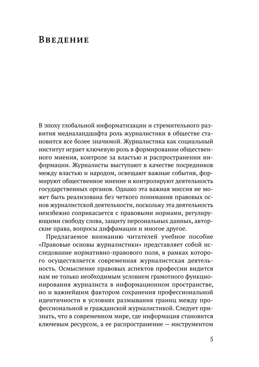 Учебное пособие «Правовые основы журналистики» представляет собой исследование нормативно- правового поля, в рамках которого осуществляется современная журналистская деятельность. В нем рассматриваются ключевые правовые институты, регулирующие деятельность журналистов и СМИ, анализируется правоприменительная практика, приводятся конкретные примеры юридических коллизий и способы их разрешения. Ценность данного пособия в рамках профессиональной подготовки журналистов составит его актуальность, обусловленная учетом новейших тенденций в сфере медиаправа, включая вопросы цифровизации, трансграничного распространения информации и новых форм медиакоммуникации. В условиях, когда законодательство не всегда успевает за технологическими новациями, умение анализировать правовые коллизии и применять общие принципы права к конкретным ситуациям становится неотъемлемой компетенцией журналиста.