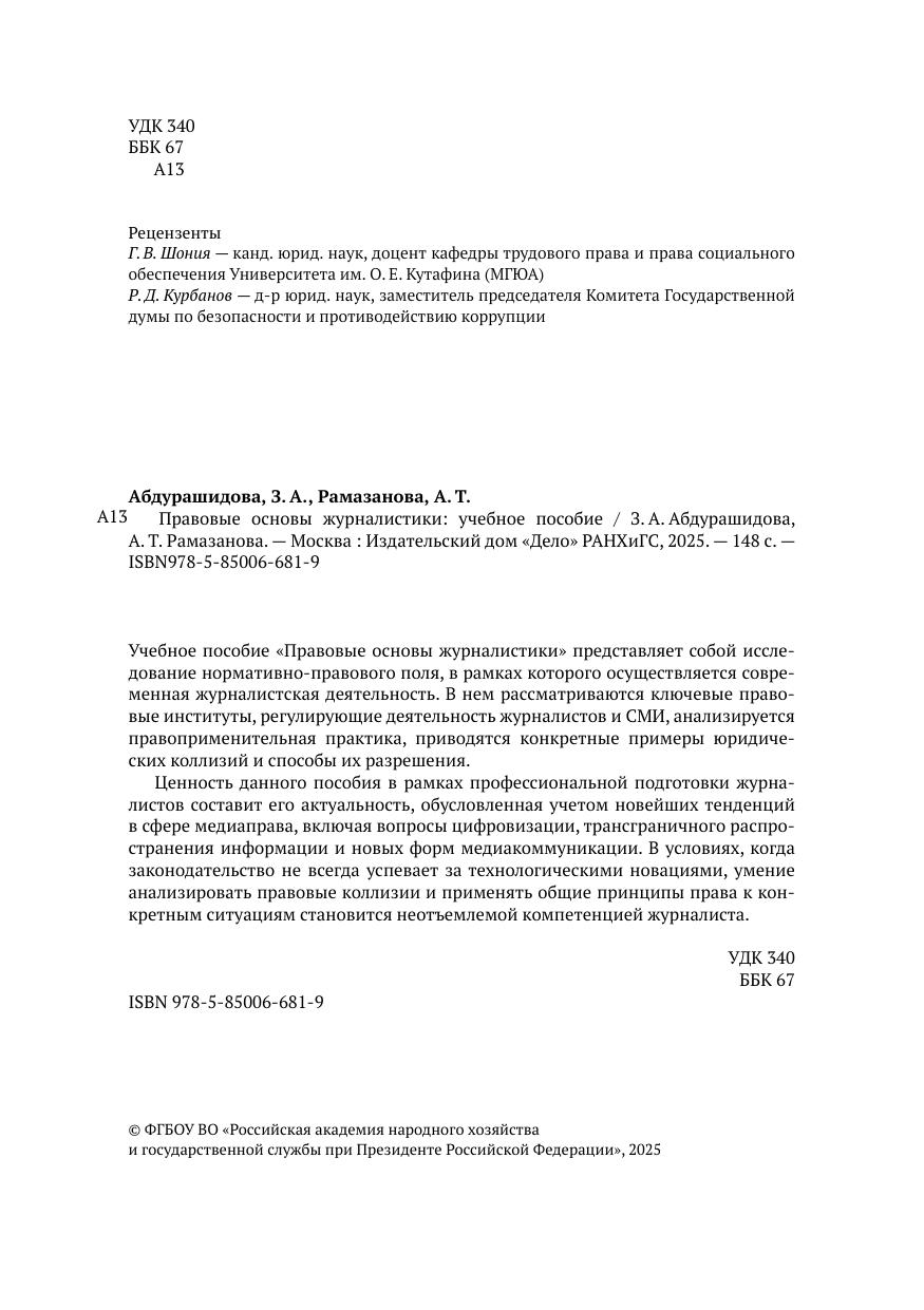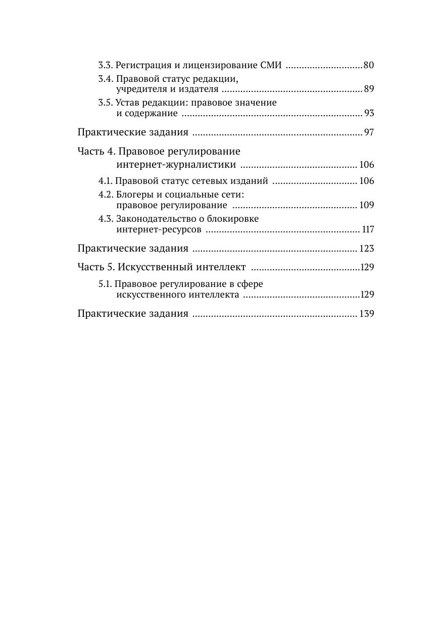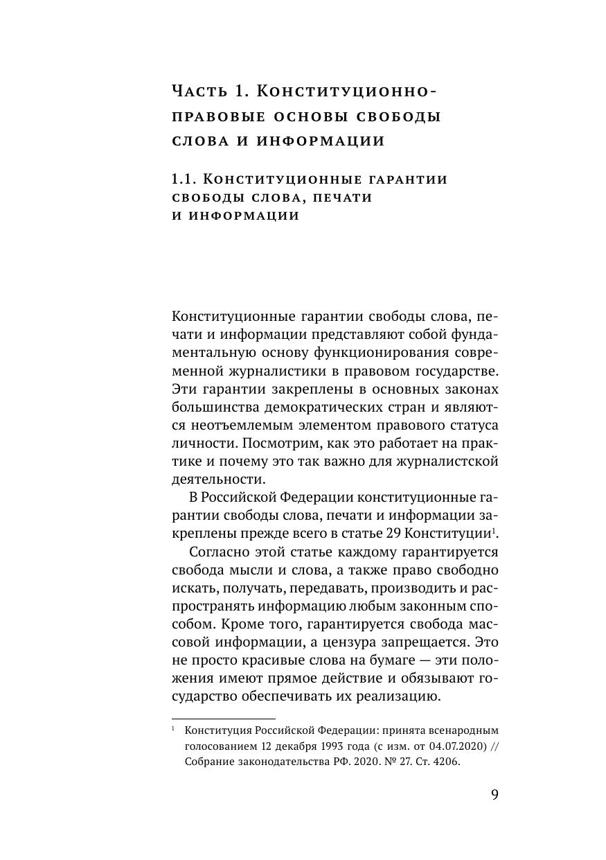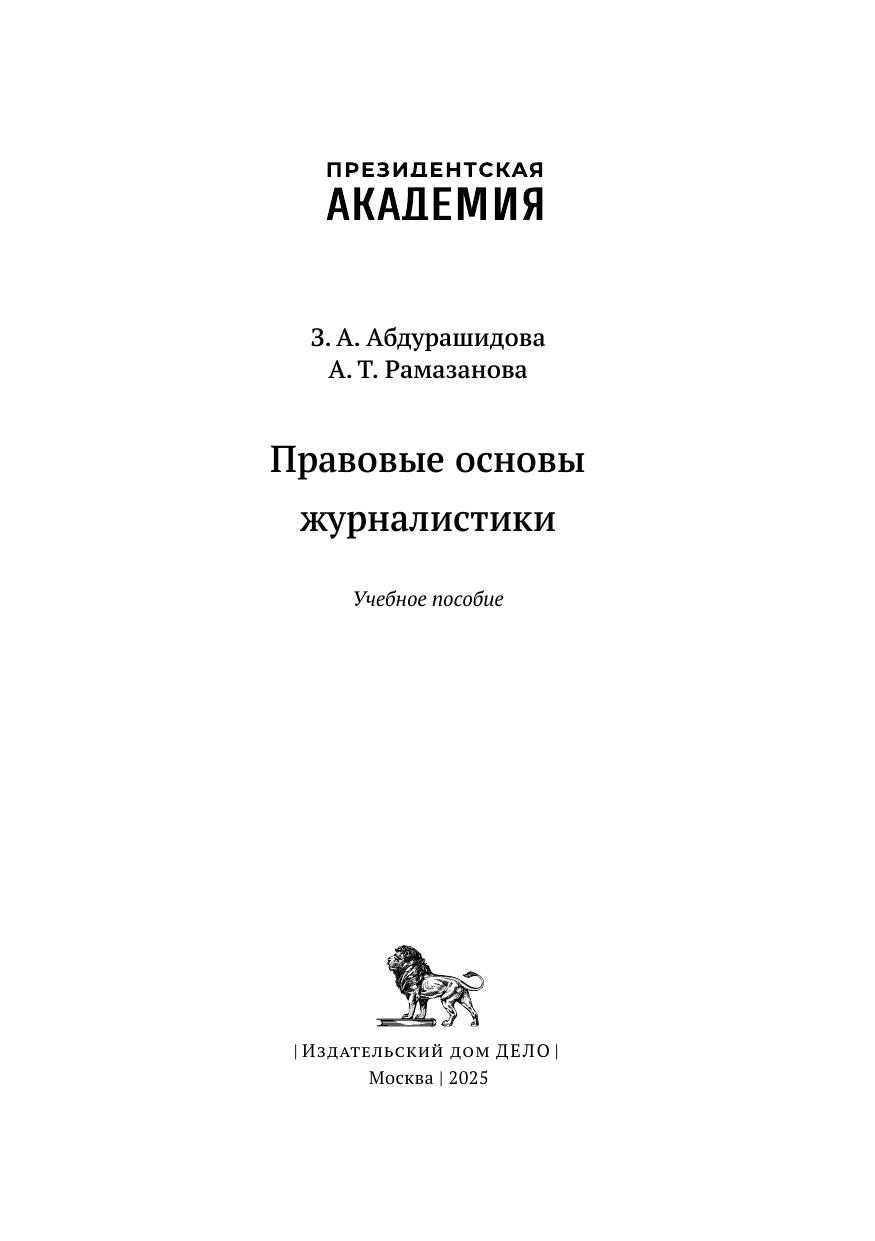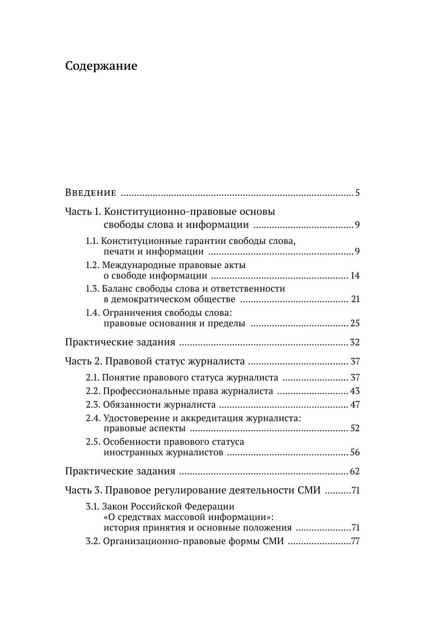 Учебное пособие «Правовые основы журналистики» представляет собой исследование нормативно- правового поля, в рамках которого осуществляется современная журналистская деятельность. В нем рассматриваются ключевые правовые институты, регулирующие деятельность журналистов и СМИ, анализируется правоприменительная практика, приводятся конкретные примеры юридических коллизий и способы их разрешения. Ценность данного пособия в рамках профессиональной подготовки журналистов составит его актуальность, обусловленная учетом новейших тенденций в сфере медиаправа, включая вопросы цифровизации, трансграничного распространения информации и новых форм медиакоммуникации. В условиях, когда законодательство не всегда успевает за технологическими новациями, умение анализировать правовые коллизии и применять общие принципы права к конкретным ситуациям становится неотъемлемой компетенцией журналиста.