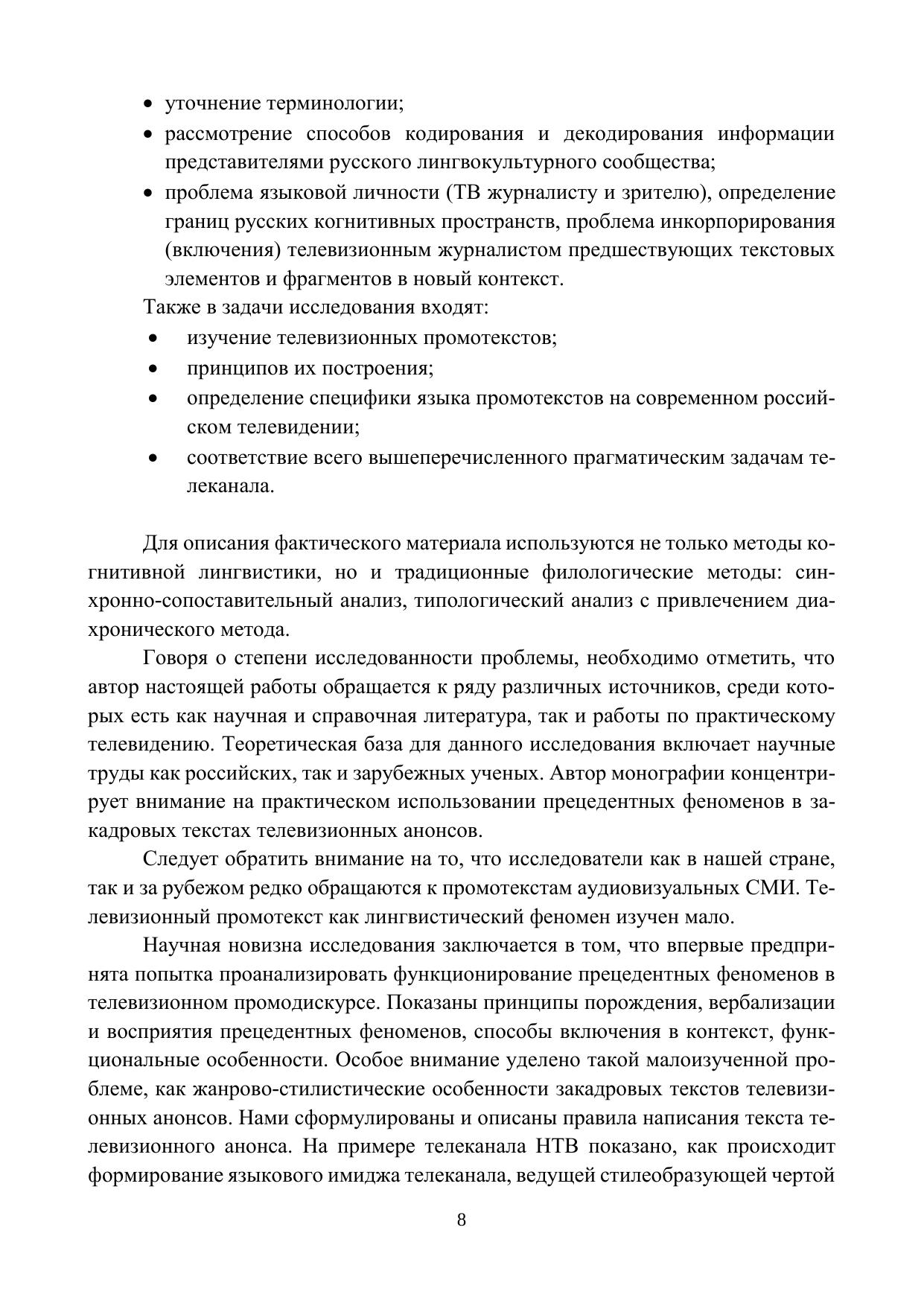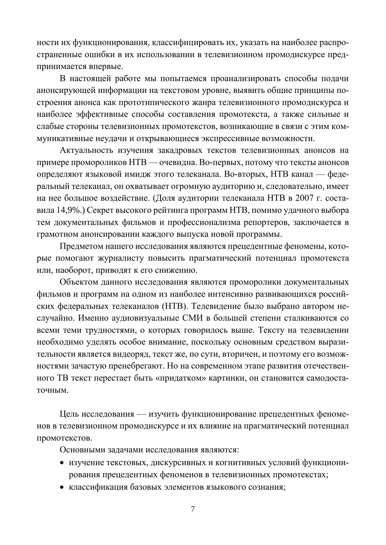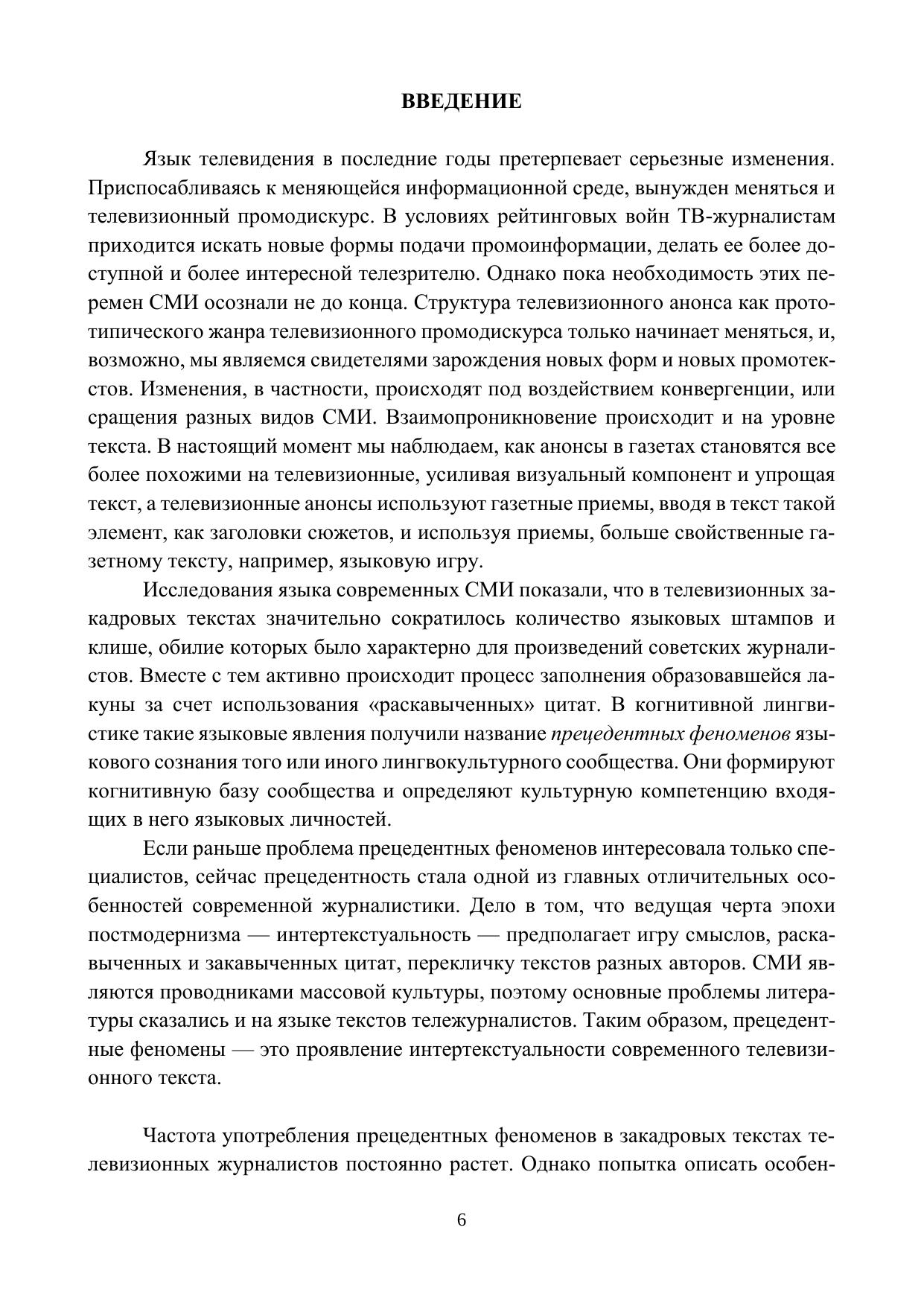 Монография посвящена функционированию прецедентных феноменов в телевизионном промодискурсе. Автор рассматривает телевизионный анонс как прототипический жанр телевизионного промодискурса; дает классификацию базовых элементов языкового сознания; уточняет терминологию; описывает различные способы кодирования и декодирования информации представителями русского лингвокультурного сообщества. Особое внимание уделено проблеме языковой личности (автору телевизион-ных промотекстов и зрителю), определению границ русских когнитивных пространств, проблеме инкорпорирования телевизионными журналистами предшествующих текстовых элементов и фрагментов в новый контекст, проблеме нарушения лингвоэтических норм в телевизионном промодискурсе.