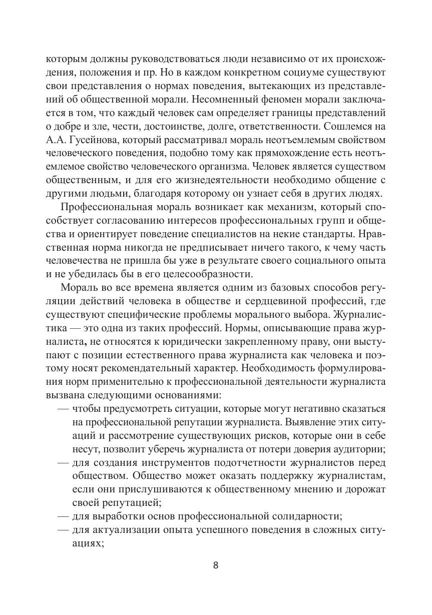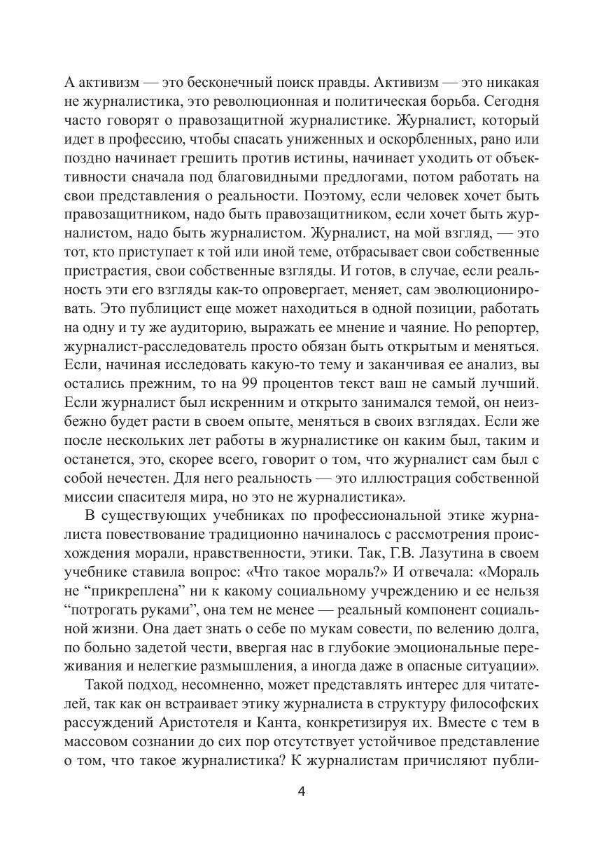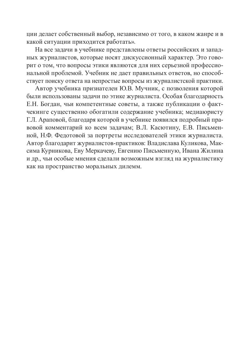 Этика журналиста рассмотрена в учебнике в контексте этапов формирования журналистики как профессиональной деятельности и в формате проектно-ориентированных задач, случаев из журналистской практики. Учебник состоит из двух частей. В первой студентам предлагаются некоторые теоретические знания о журналистике, становление которой было связано с закреплением ее общественного статуса через появление этических и правовых норм, института омбудсмена, технологических стандартов, профессиональных союзов и объединений журналистов. Вторая часть представляет собой этические коллизии с вариантами решений задач от практикующих журналистов. На все задачи представлены ответы российских и западных журналистов, которые носят дискуссионный характер. Учебник не дает правильных ответов, но способствует поиску ответов на непростые вопросы из журналистской практики.
