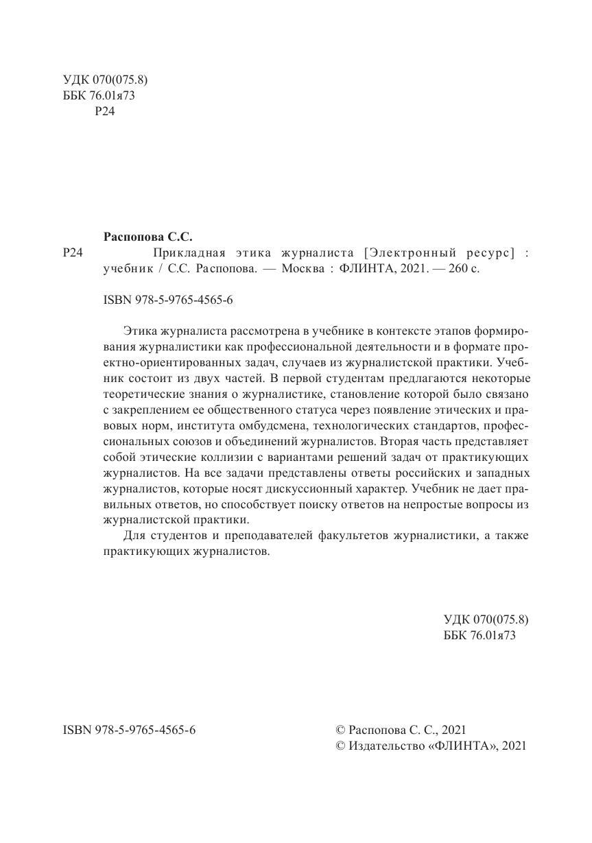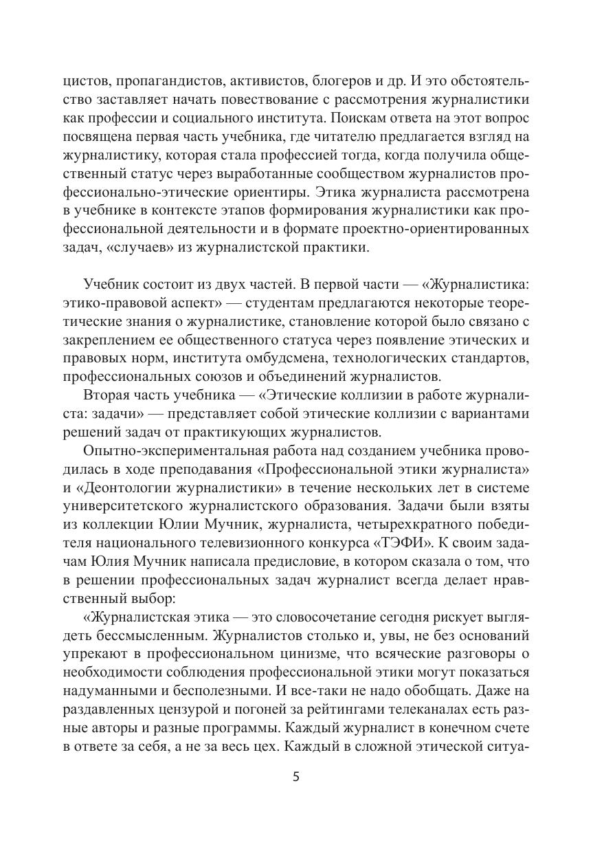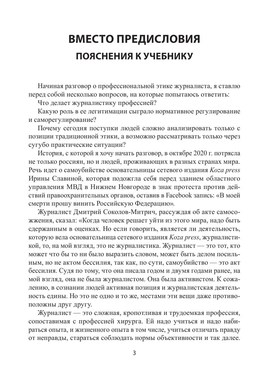 Этика журналиста рассмотрена в учебнике в контексте этапов формирования журналистики как профессиональной деятельности и в формате проектно-ориентированных задач, случаев из журналистской практики. Учебник состоит из двух частей. В первой студентам предлагаются некоторые теоретические знания о журналистике, становление которой было связано с закреплением ее общественного статуса через появление этических и правовых норм, института омбудсмена, технологических стандартов, профессиональных союзов и объединений журналистов. Вторая часть представляет собой этические коллизии с вариантами решений задач от практикующих журналистов. На все задачи представлены ответы российских и западных журналистов, которые носят дискуссионный характер. Учебник не дает правильных ответов, но способствует поиску ответов на непростые вопросы из журналистской практики.