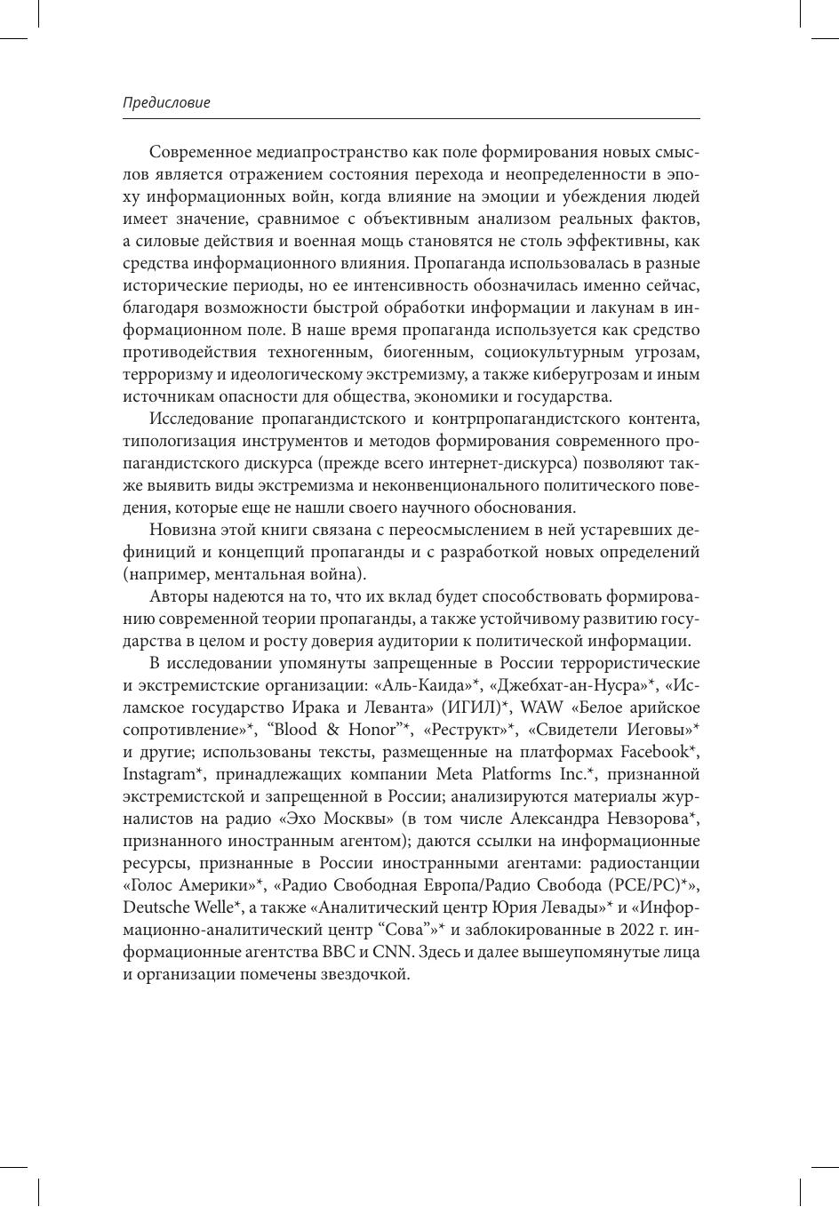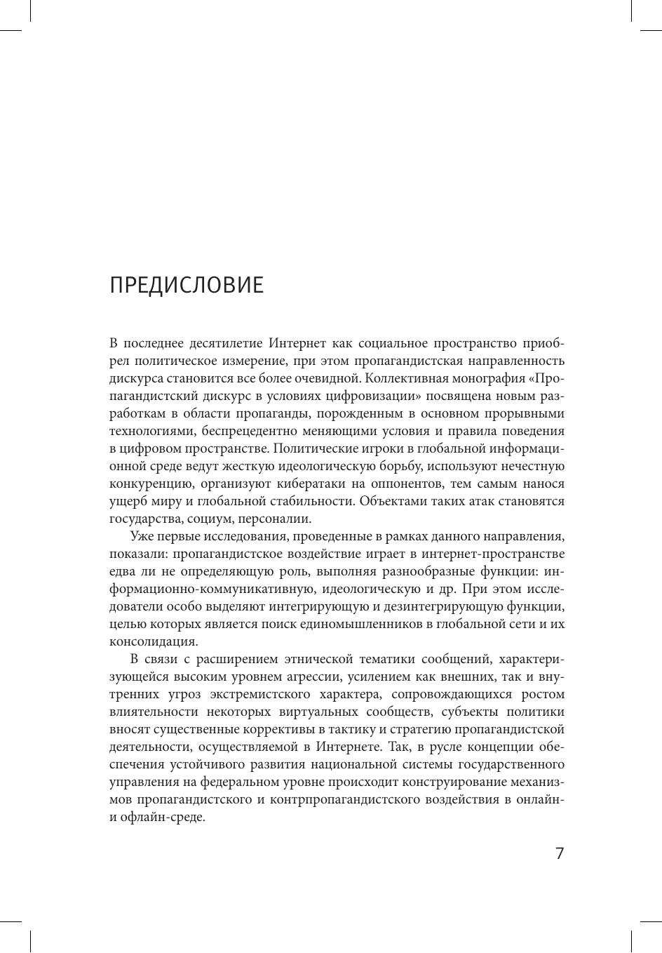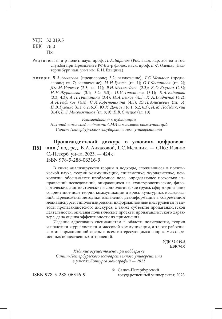 В книге анализируются теории и подходы, сложившиеся в политической науке, теории коммуникаций, лингвистике, журналистике, психологии; обозначается проблемное поле, определяющее несколько направлений исследований, опирающихся на культурологические , филологические, лингвистические и социологические труды, сформировавшие современное поле коммуникации и кросс-культурных исследований. Предложены методики выявления дезинформации в современном медиадискурсе; типологизированы информационные инструменты и методы пропагандистского дискурса, а также субъекты пропагандистской деятельности; описаны политические проекты пропагандистского характера; дана оценка эффективности их применения. Издание адресовано специалистам в области политологии, теории и практики журналистики и массовой коммуникации, а также работникам информационной сферы и всем интересующимся вопросами современных общественных отношений.