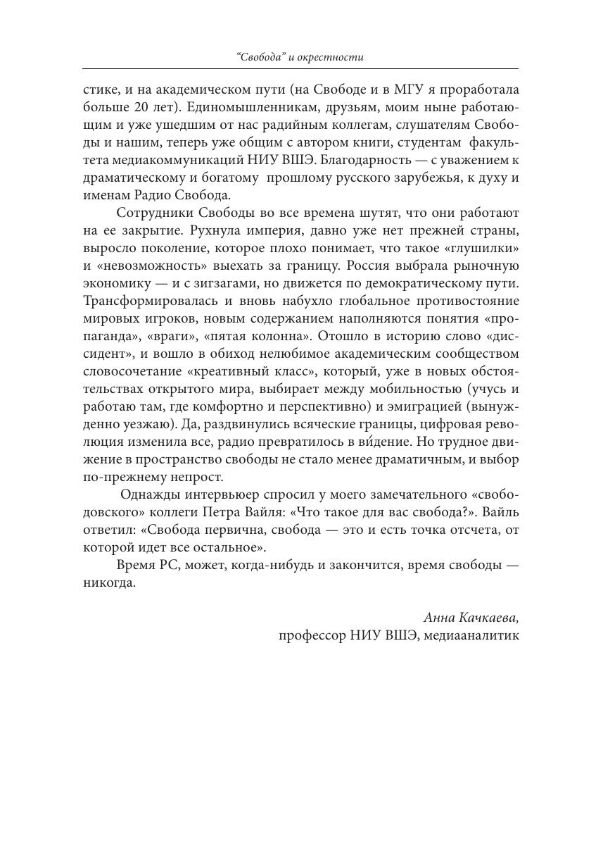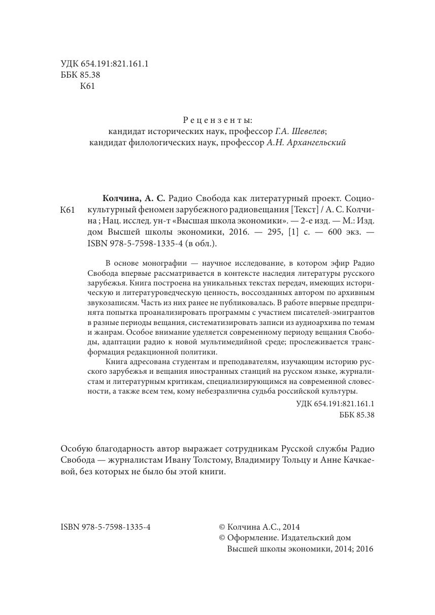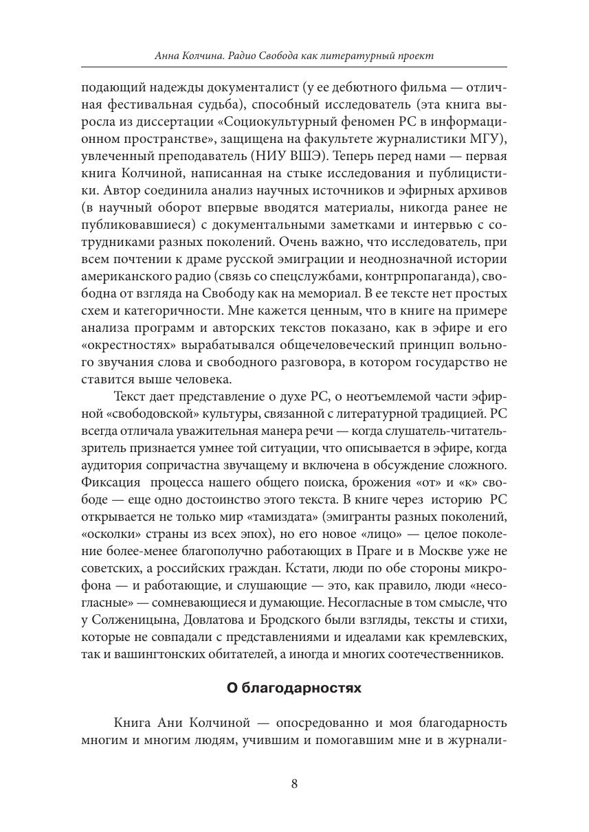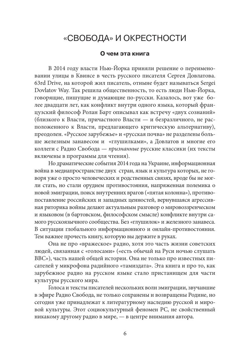 В основе монографии — научное исследование, в котором эфир Радио Свобода впервые рассматривается в контексте наследия литературы русского зарубежья. Книга построена на уникальных текстах передач, имеющих историческую и литературоведческую ценность, воссозданных автором по архивным звукозаписям. Часть из них ранее не публиковалась. В работе впервые предпринята попытка проанализировать программы с участием писателей-эмигрантов в разные периоды вещания, систематизировать записи из аудиоархива по темам и жанрам. Особое внимание уделяется современному периоду вещания Свободы, адаптации радио к новой мультимедийной среде; прослеживается трансформация редакционной политики. Книга адресована студентам и преподавателям, изучающим историю русского зарубежья и вещания иностранных станций на русском языке, журналистам и литературным критикам, специализирующимся на современной словесности, а также всем тем, кому небезразлична судьба российской культуры.