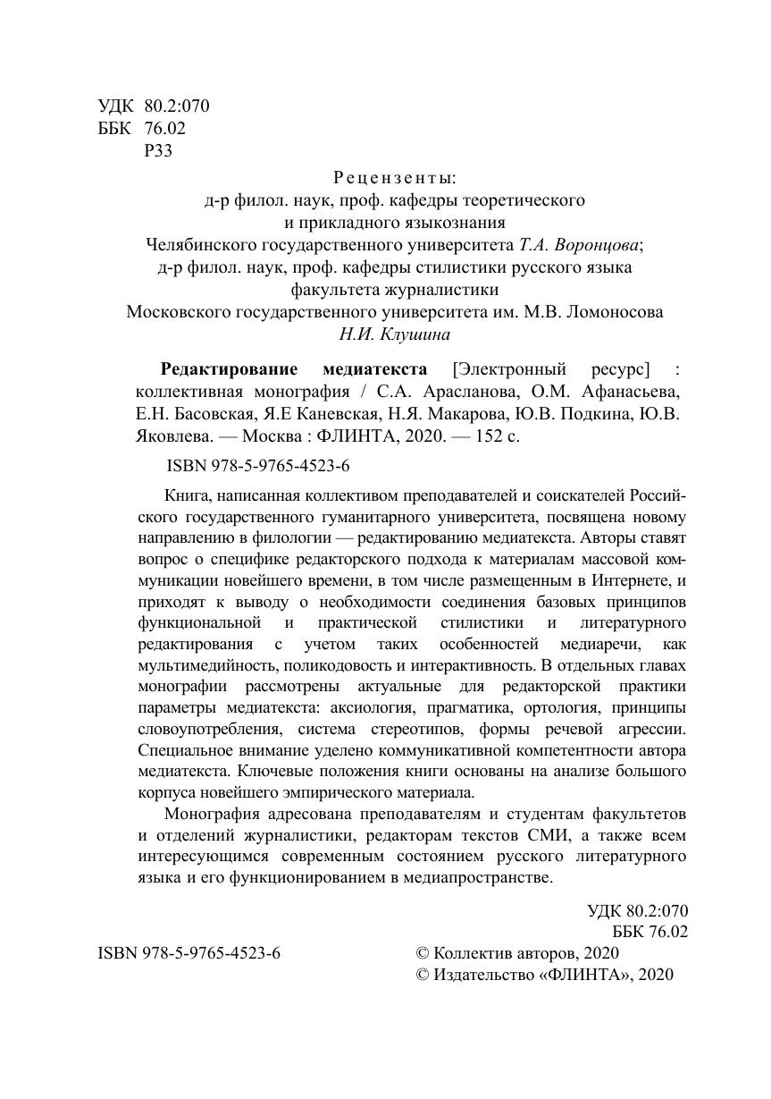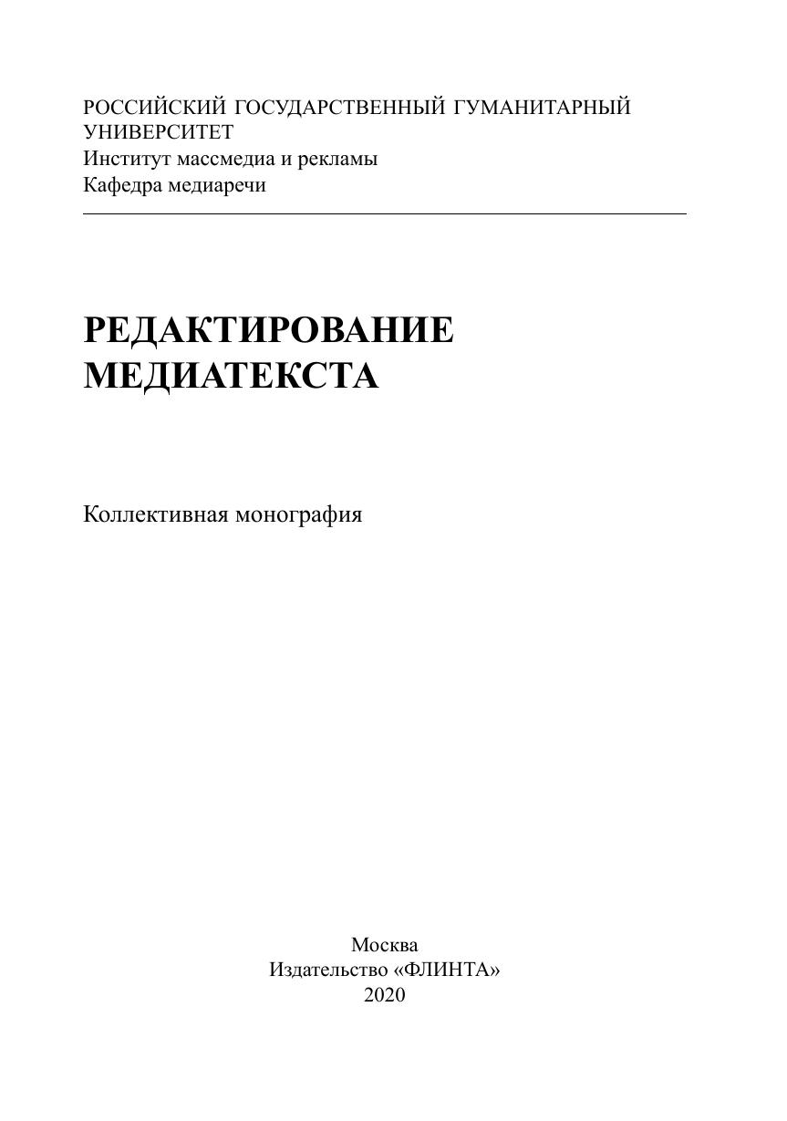 Книга, написанная коллективом преподавателей и соискателей Российского государственного гуманитарного университета, посвящена новому направлению в филологии — редактированию медиатекста. Авторы ставят вопрос о специфике редакторского подхода к материалам массовой коммуникации новейшего времени, в том числе размещенным в Интернете, и приходят к выводу о необходимости соединения базовых принципов функциональной и практической стилистики и литературного редактирования с учетом таких особенностей медиаречи, как мультимедийность, поликодовость и интерактивность. В отдельных главах монографии рассмотрены актуальные для редакторской практики параметры медиатекста: аксиология, прагматика, ортология, принципы словоупотребления, система стереотипов, формы речевой агрессии. Специальное внимание уделено коммуникативной компетентности автора медиатекста. Ключевые положения книги основаны на анализе большого корпуса новейшего эмпирического материала.