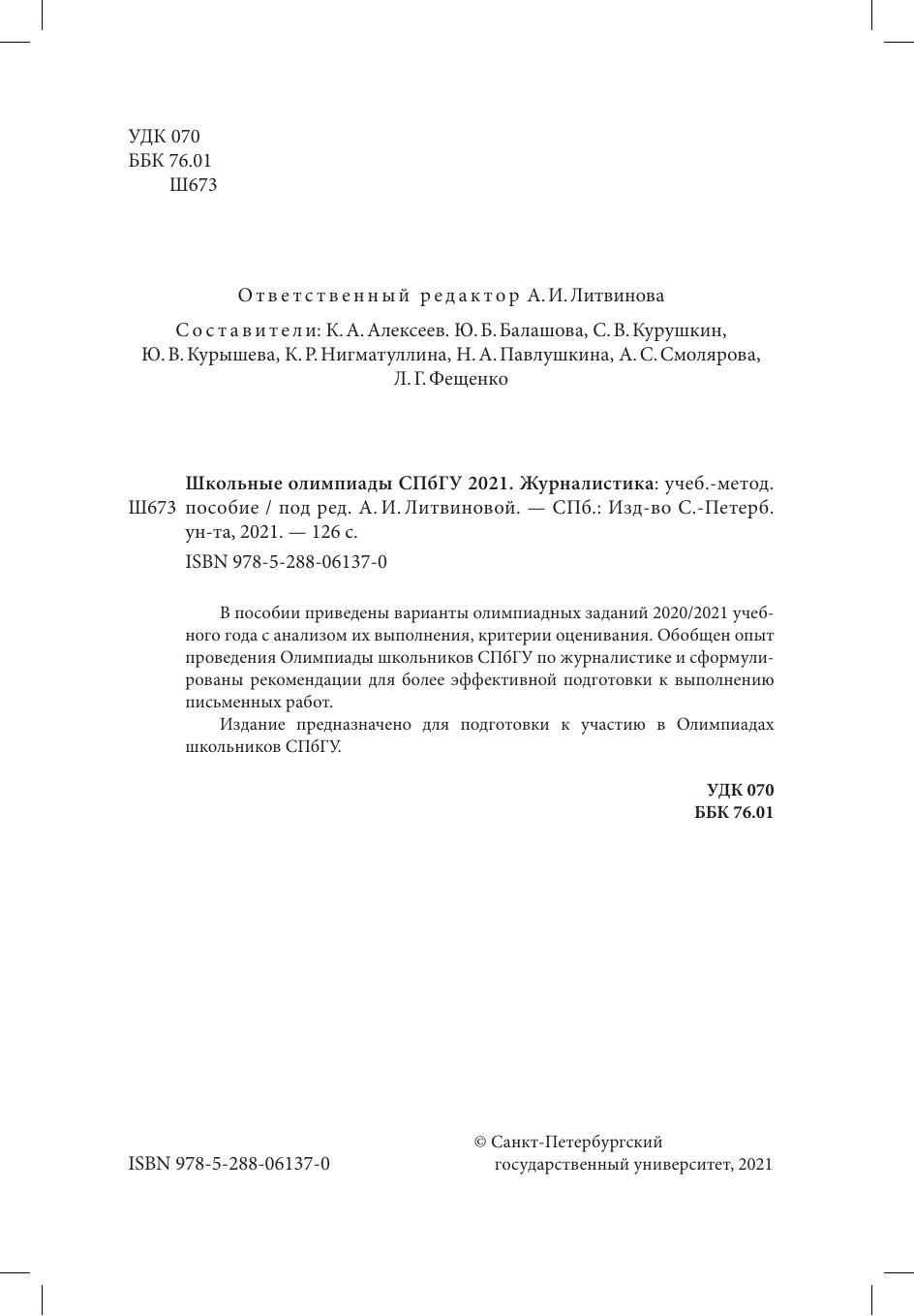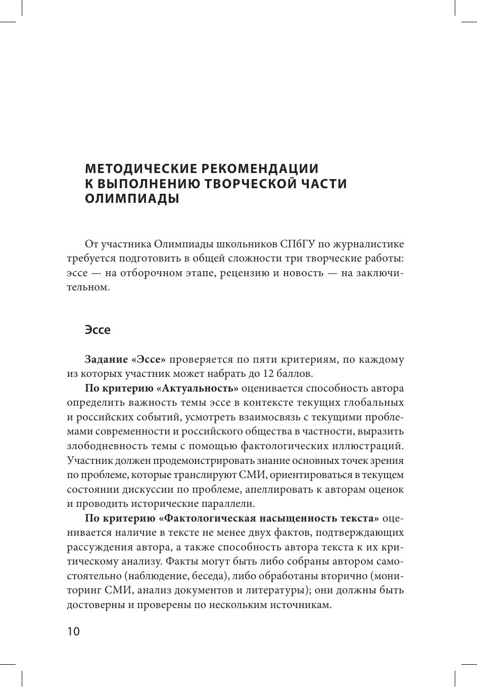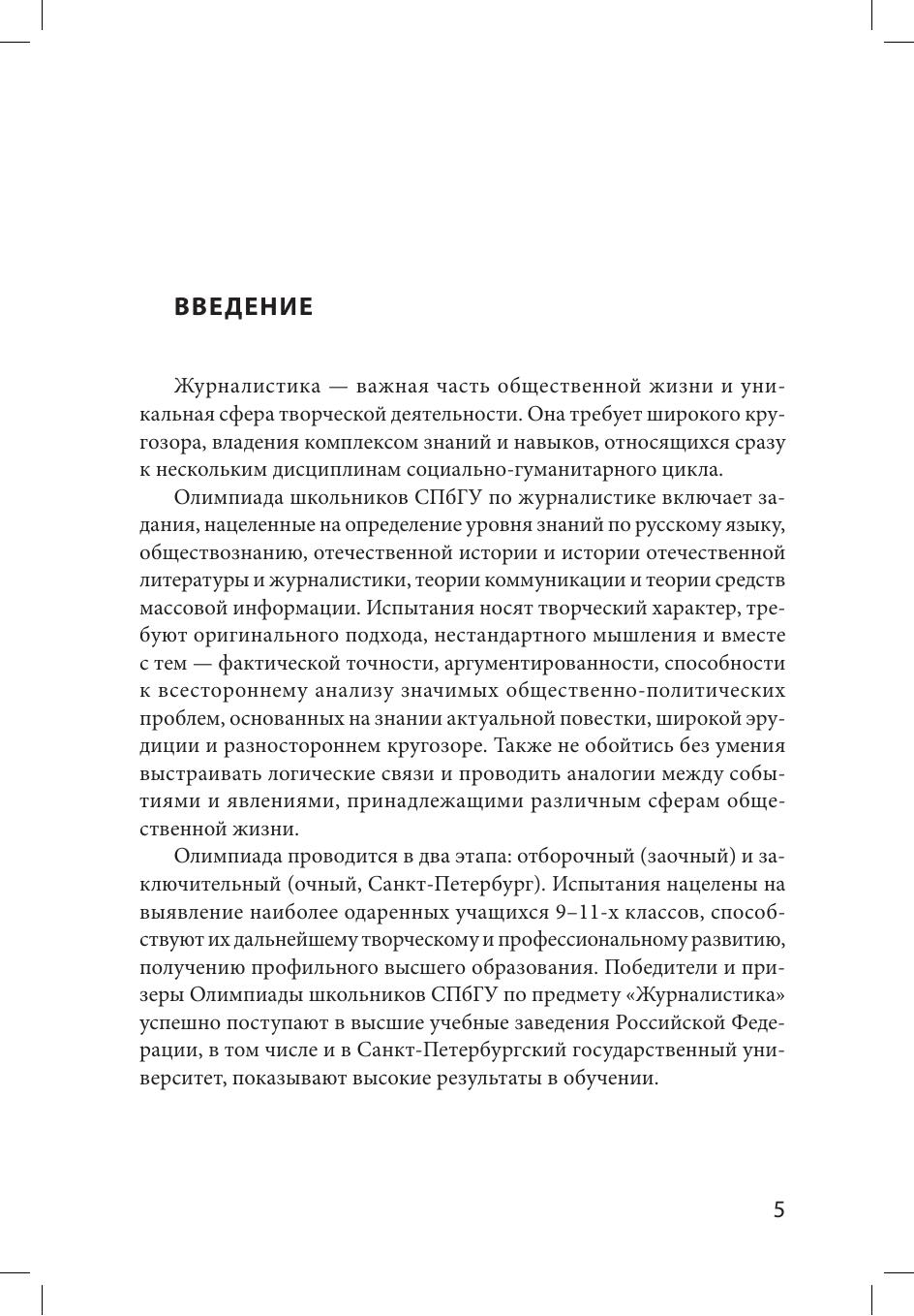 В пособии приведены варианты олимпиадных заданий 2020/2021 учебного года с анализом их выполнения, критерии оценивания. Обобщен опыт проведения Олимпиады школьников СПбГУ по журналистике и сформулированы рекомендации для более эффективной подготовки к выполнению письменных работ.
