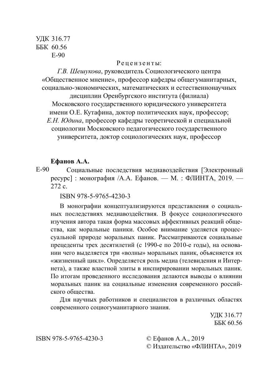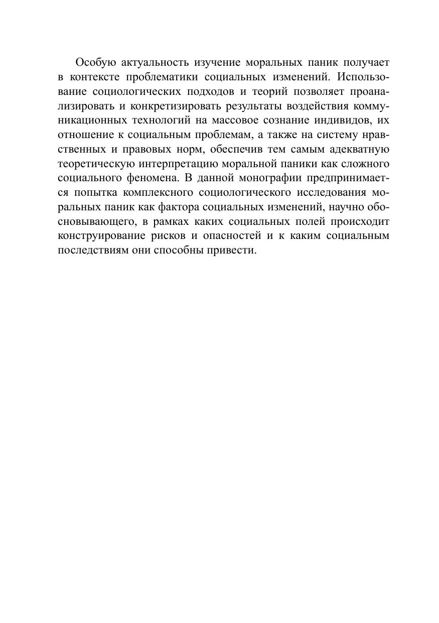 В монографии концептуализируются представления о социальных последствиях медиавоздействия. В фокусе социологического изучения автора такая форма массовых аффективных реакций общества, как моральные паники. Особое внимание уделяется процессуальной природе моральных паник. Рассматриваются социальные прецеденты трех десятилетий (с 1990-е по 2010-е годы), на основании чего выделяется три «волны» моральных паник, объясняется их «жизненный цикл». Определяется роль медиа (телевидения и Интернета), а также властной элиты в инспирировании моральных паник. По итогам проведенного исследования делаются выводы о влиянии моральных паник на социальные изменения современного российского общества.