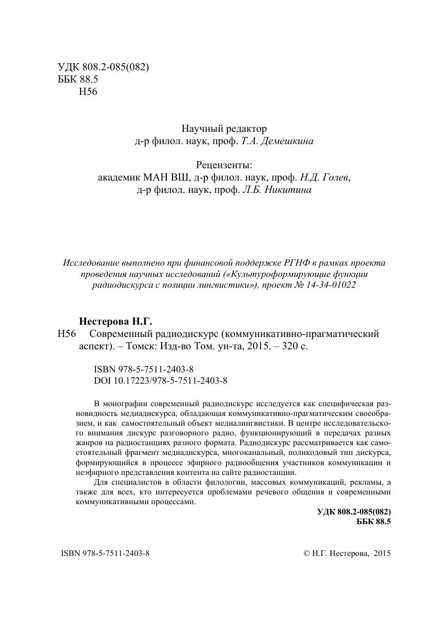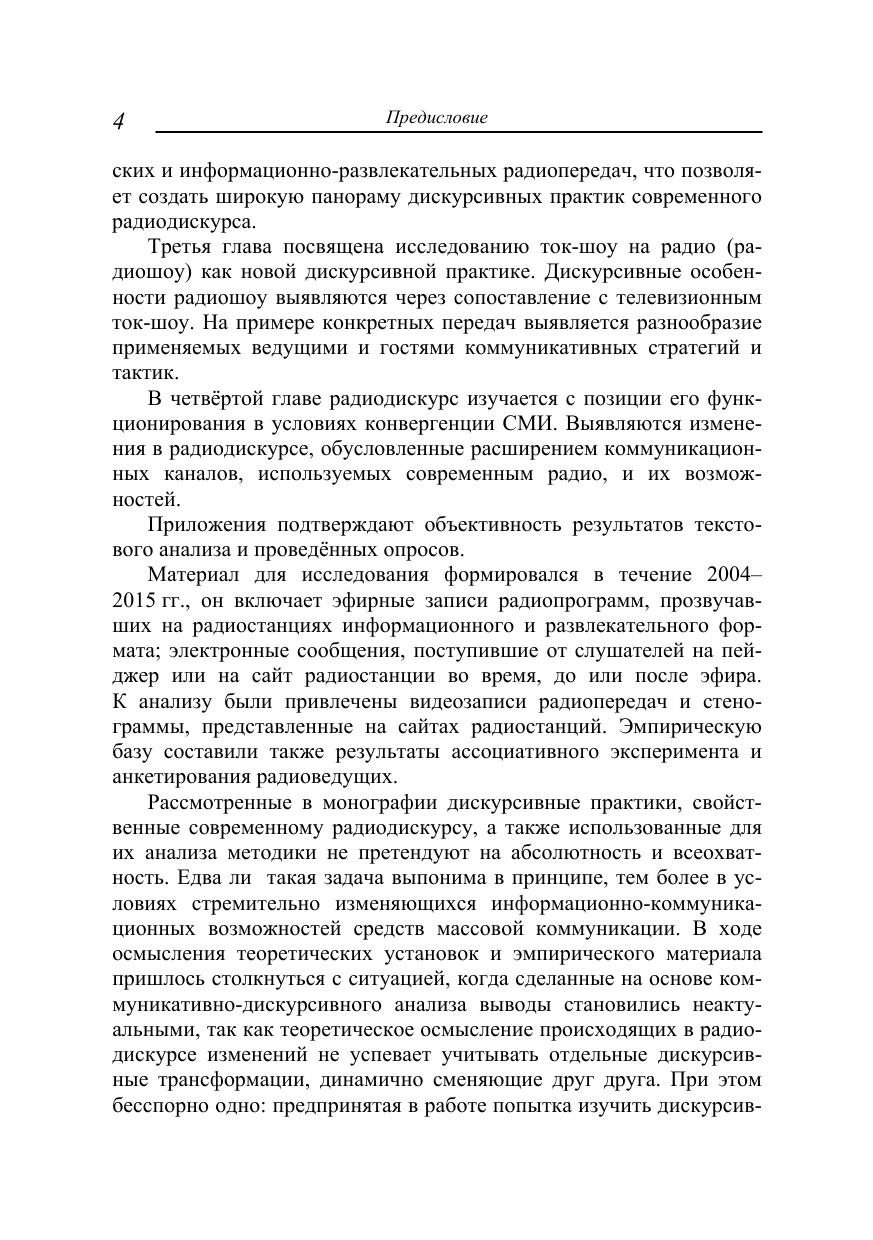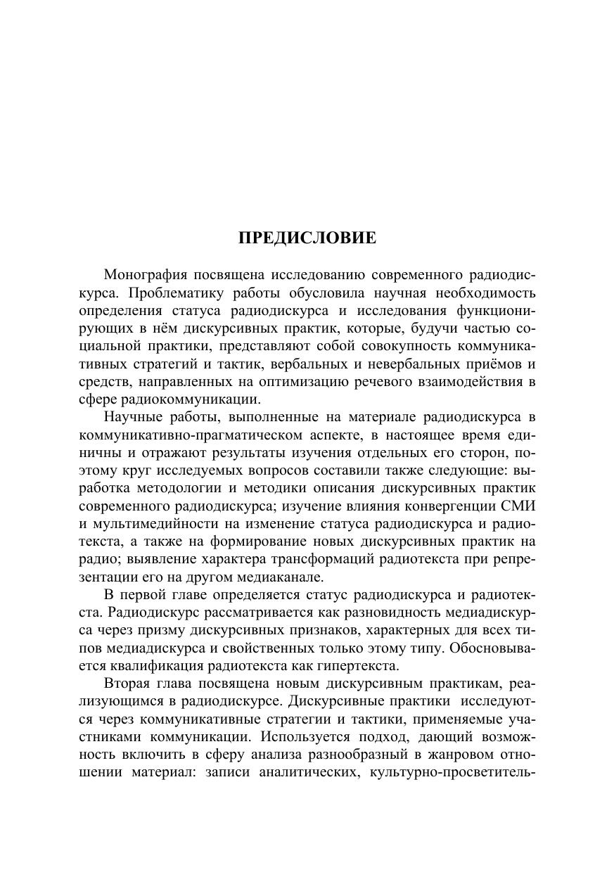 В монографии современный радиодискурс исследуется как специфическая разновидность медиадискурса, обладающая коммуникативно-прагматическим своеобразием, и как самостоятельный объект медиалингвистики. В центре исследовательского внимания дискурс разговорного радио, функционирующий в передачах разных жанров на радиостанциях разного формата. Радиодискурс рассматривается как самостоятельный фрагмент медиадискурса, многоканальный, поликодовый тип дискурса, формирующийся в процессе эфирного радиообщения участников коммуникации и неэфирного представления контента на сайте радиостанции. Для специалистов в области филологии, массовых коммуникаций, рекламы, а также для всех, кто интересуется проблемами речевого общения и современными коммуникативными процессами.