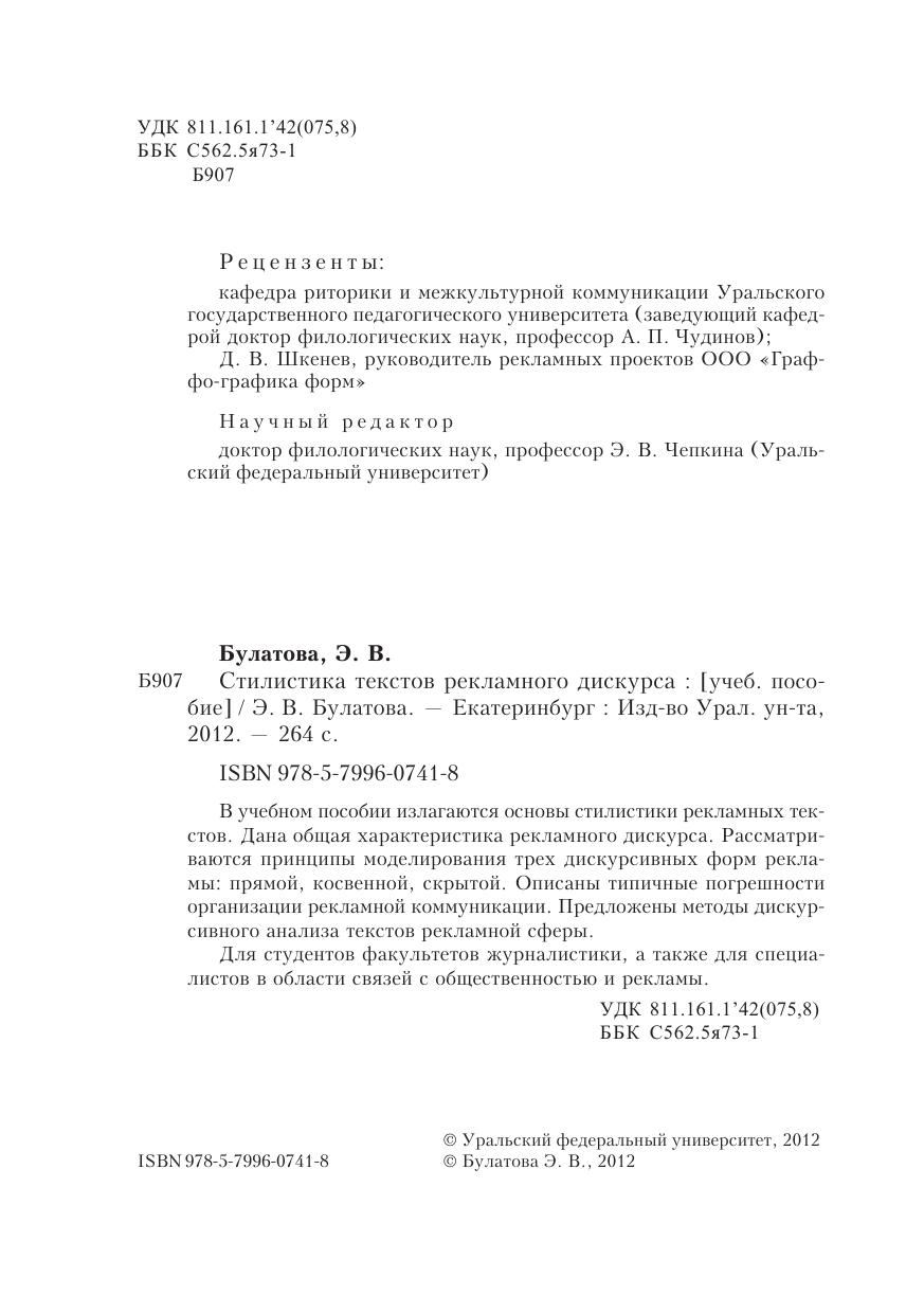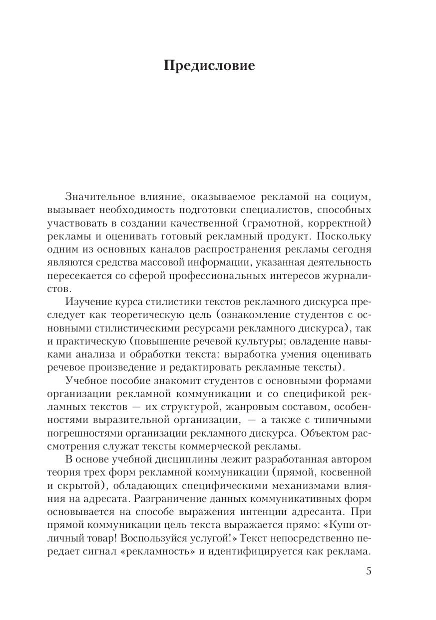 В учебном пособии излагаются основы стилистики рекламных текстов. Дана общая характеристика рекламного дискурса. Рассматриваются принципы моделирования трех дискурсивных форм рекламы: прямой, косвенной, скрытой. Описаны типичные погрешности организации рекламной коммуникации. Предложены методы дискурсивного анализа текстов рекламной сферы. Для студентов факультетов журналистики, а также для специалистов в области связей с общественностью и рекламы.