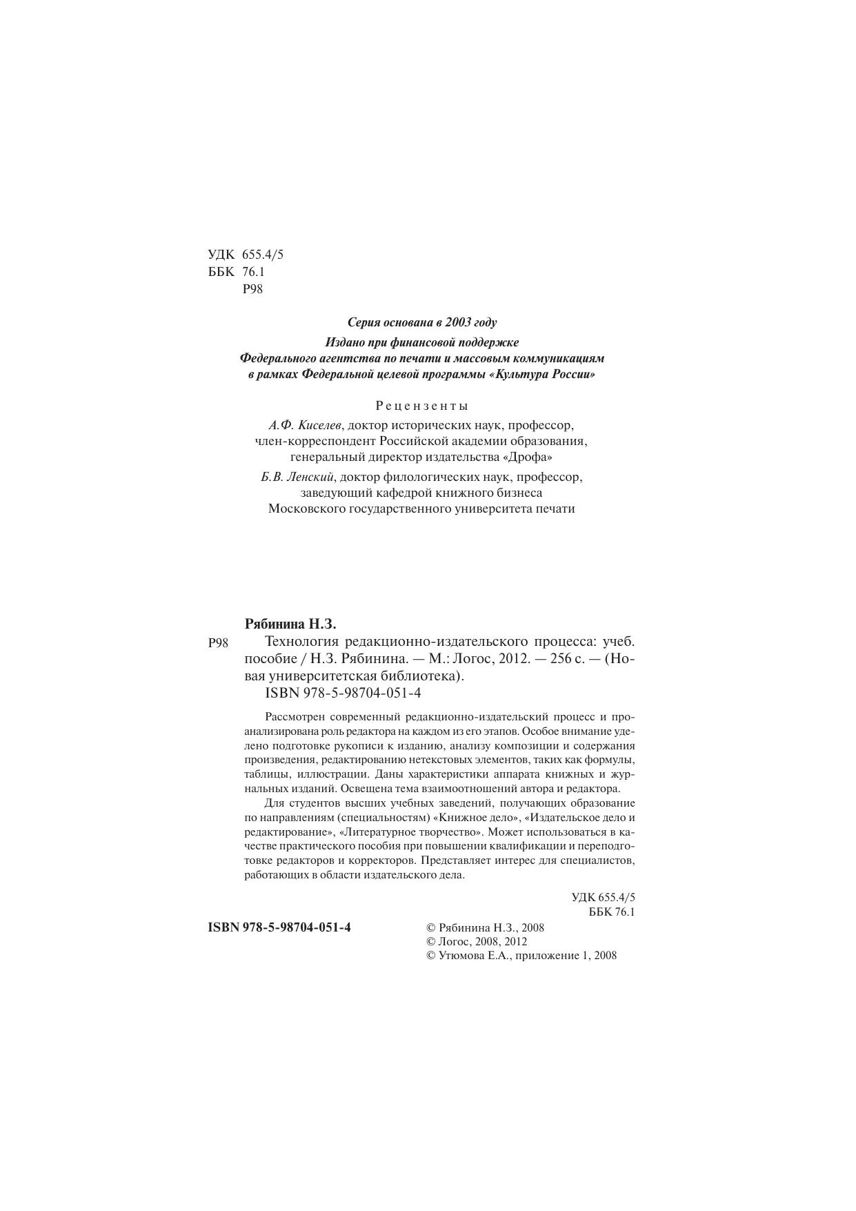 Рассмотрен современный редакционно-издательский процесс и проанализирована роль редактора на каждом из его этапов. Особое внимание уделено подготовке рукописи к изданию, анализу композиции и содержания произведения, редактированию нетекстовых элементов, таких как формулы, таблицы, иллюстрации. Даны характеристики аппарата книжных и журнальных изданий. Освещена тема взаимоотношений автора и редактора. Для студентов высших учебных заведений, получающих образование по направлениям (специальностям) «Книжное дело», «Издательское дело и редактирование», «Литературное творчество». Может использоваться в качестве практического пособия при повышении квалификации и переподготовке редакторов и корректоров. Представляет интерес для специалистов, работающих в области издательского дела.
