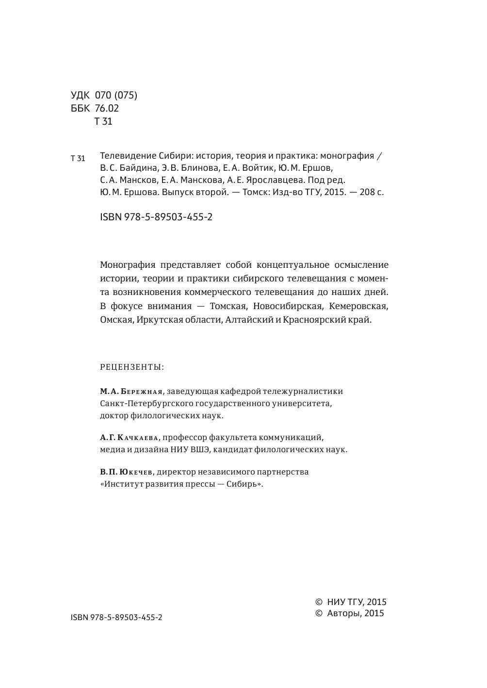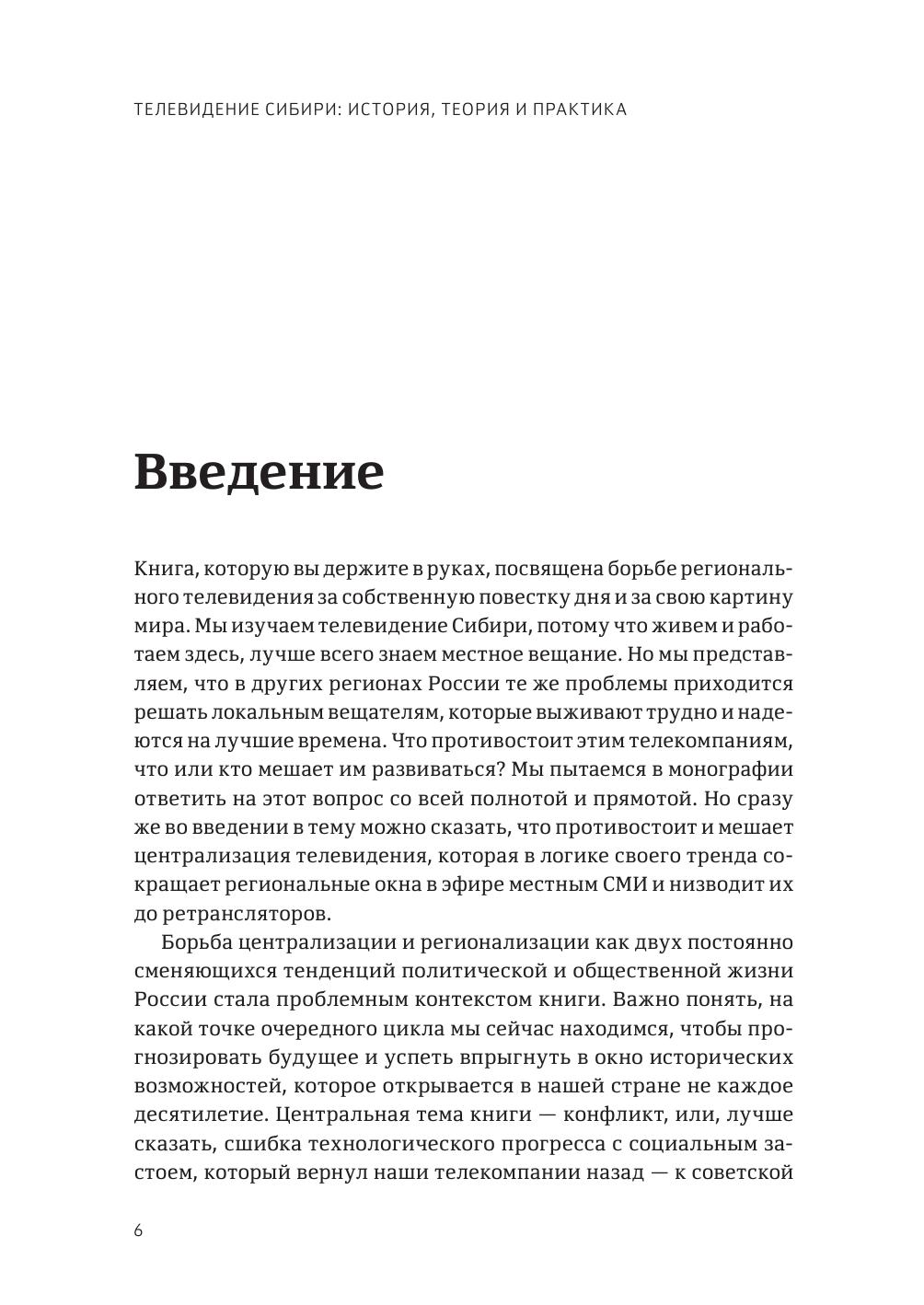 Монография представляет собой концептуальное осмысление истории, теории и практики сибирского телевещания с момента возникновения коммерческого телевещания до наших дней. В фокусе внимания — Томская, Новосибирская, Кемеровская, Омская, Иркутская области, Алтайский и Красноярский край.