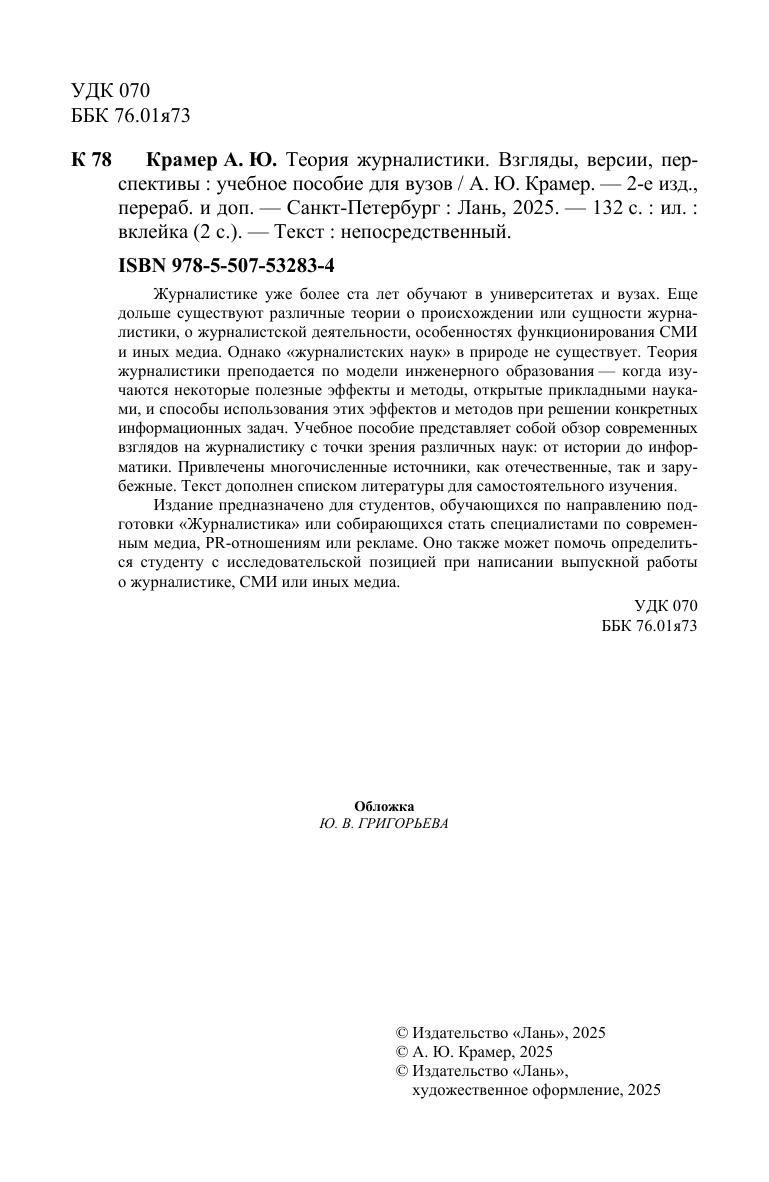 Журналистике уже более ста лет обучают в университетах и вузах. Еще дольше существуют различные теории о происхождении или сущно-сти журналистики, о журналистской деятельности, особенностях функцио-нирования СМИ и иных медиа. Однако «журналистских наук» в природе не существует. Теория журналистики преподается по модели инженерного образования — когда изучаются некоторые полезные эффекты и методы, открытые прикладными науками, и способы использования этих эффектов и методов при решении конкретных информационных задач. Учебное посо-бие представляет собой обзор современных взглядов на журналистику с точки зрения различных наук: от истории до информатики. Привлечены многочисленные источники, как отечественные, так и зарубежные. Текст дополнен списком литературы для самостоятельного изучения. Издание предназначено для студентов, обучающихся по направлению подготовки «Журналистика» или собирающихся стать специалистами по современным медиа, PR-отношениям или рекламе. Оно также может помочь определиться студенту с исследовательской позицией при написании выпускной работы о журналистике, СМИ или иных медиа.