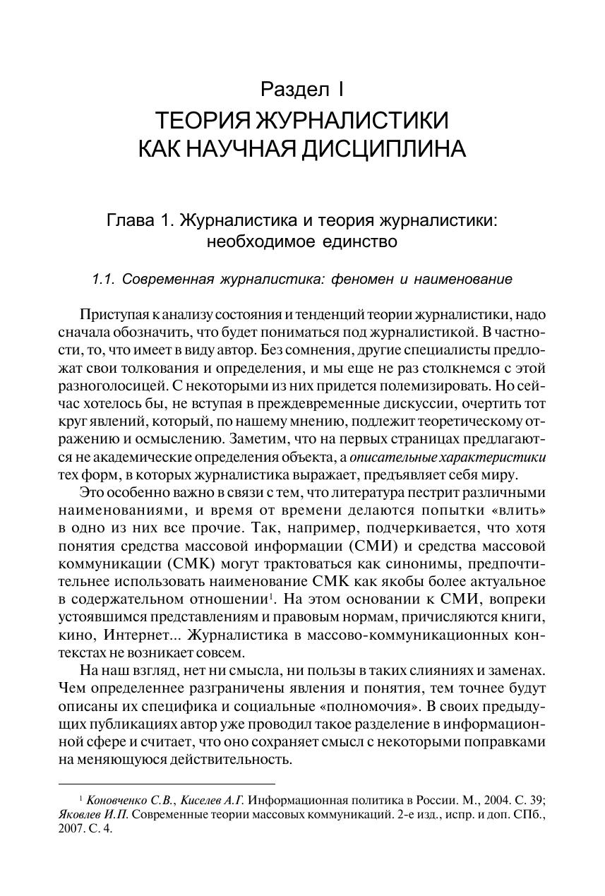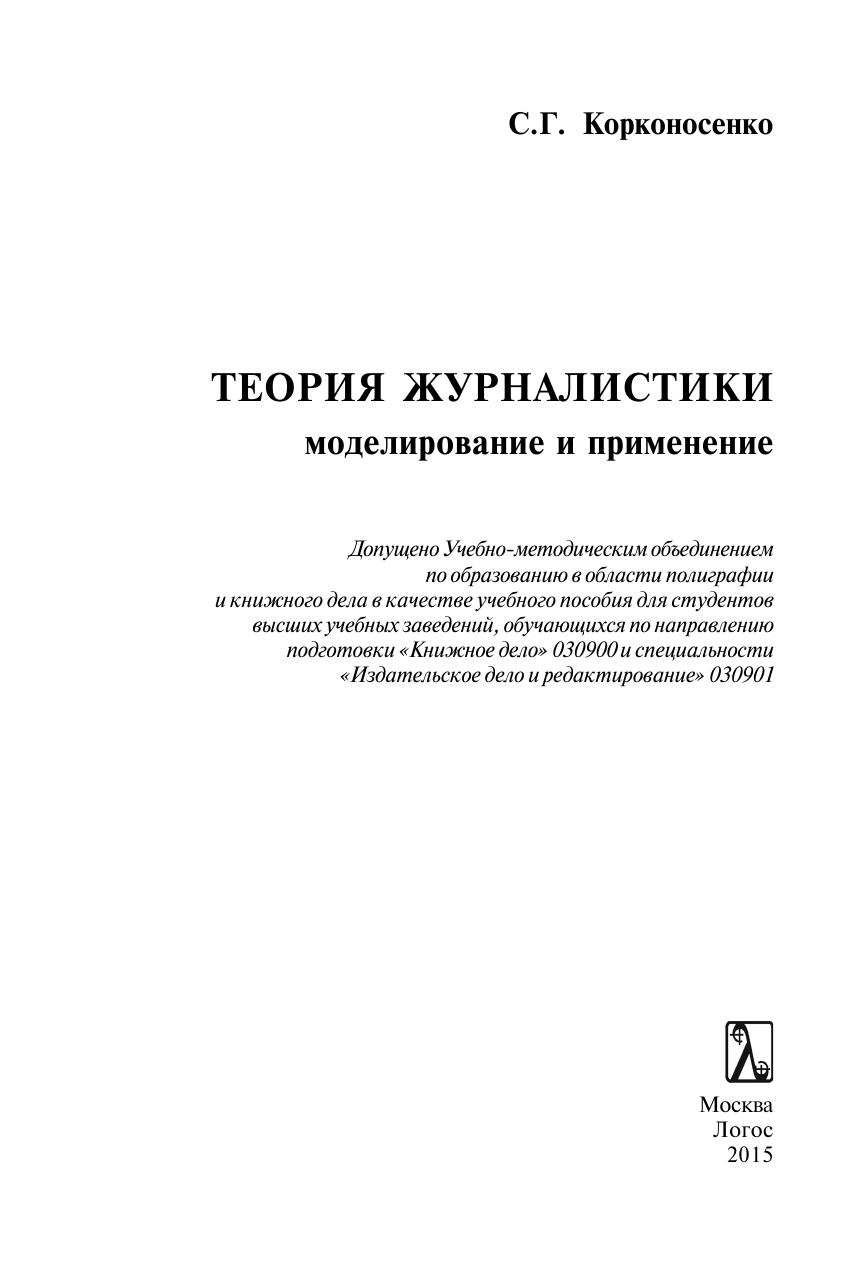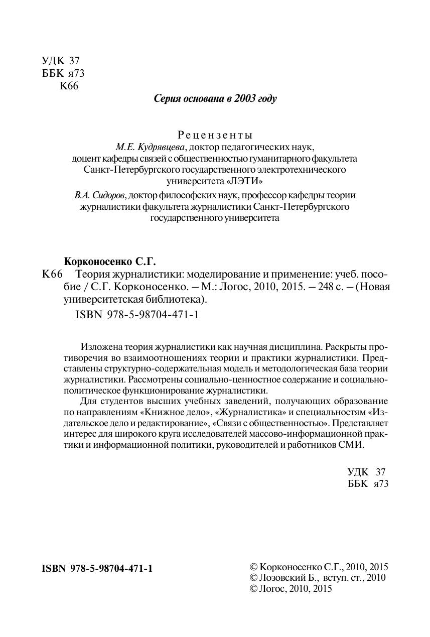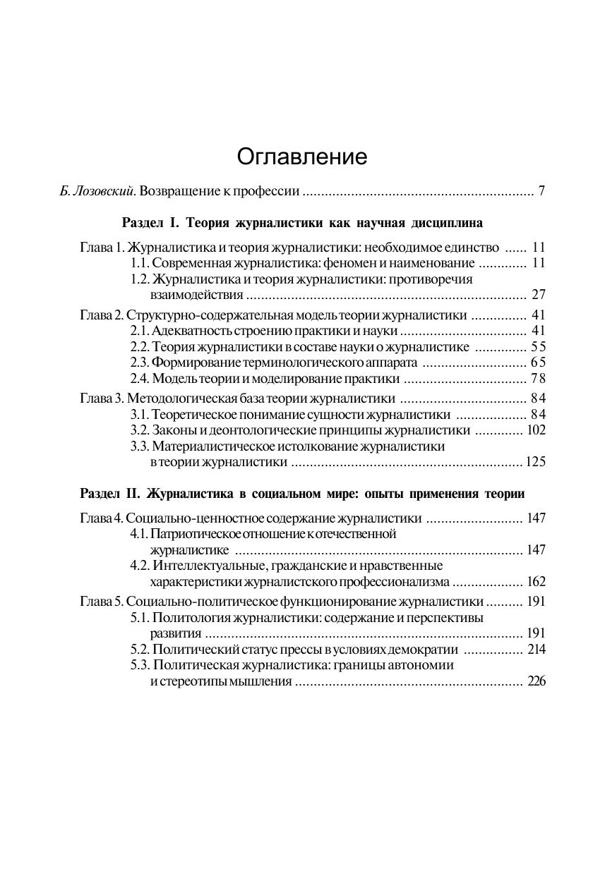 Изложена теория журналистики как научная дисциплина. Раскрыты противоречия во взаимоотношениях теории и практики журналистики. Представлены структурно-содержательная модель и методологическая база теории журналистики. Рассмотрены социально-ценностное содержание и социально-политическое функционирование журналистики. Для студентов высших учебных заведений, получающих образование по направлениям «Книжное дело», «Журналистика» и специальностям «Издательское дело и редактирование», «Связи с общественностью». Представляет интерес для широкого круга исследователей массово-информационной практики и информационной политики, руководителей и работников СМИ.