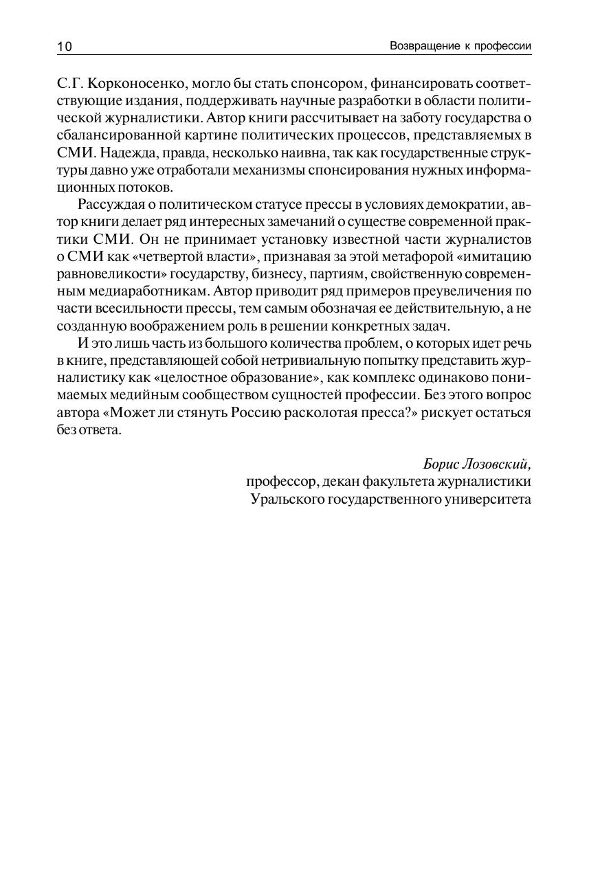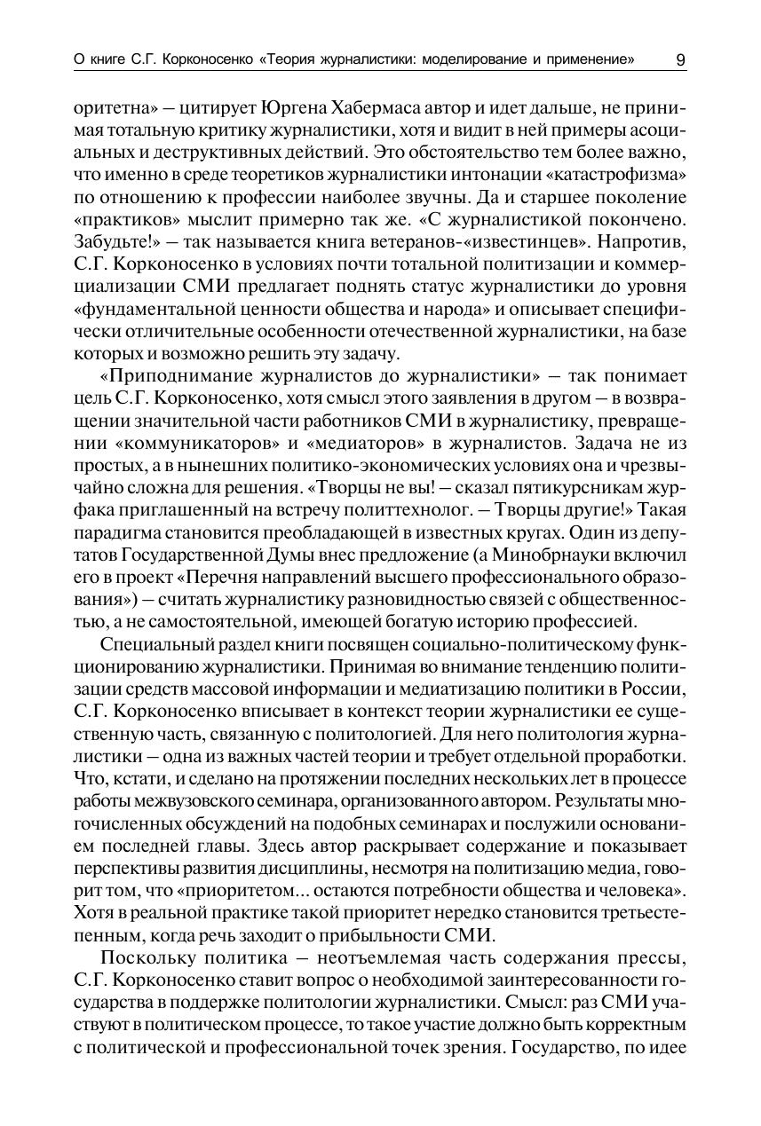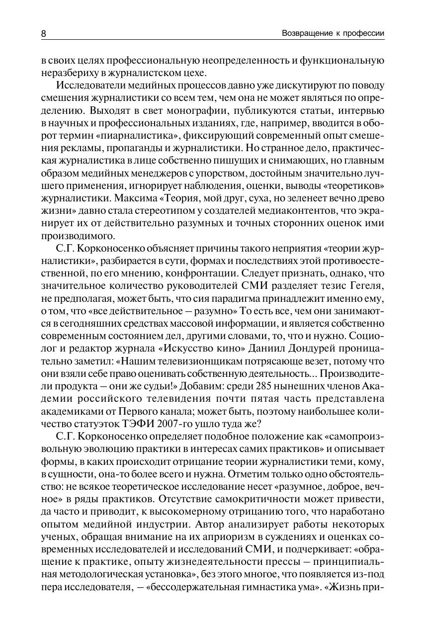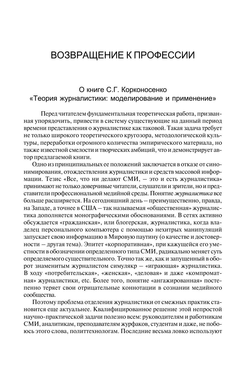 Изложена теория журналистики как научная дисциплина. Раскрыты противоречия во взаимоотношениях теории и практики журналистики. Представлены структурно-содержательная модель и методологическая база теории журналистики. Рассмотрены социально-ценностное содержание и социально-политическое функционирование журналистики. Для студентов высших учебных заведений, получающих образование по направлениям «Книжное дело», «Журналистика» и специальностям «Издательское дело и редактирование», «Связи с общественностью». Представляет интерес для широкого круга исследователей массово-информационной практики и информационной политики, руководителей и работников СМИ.