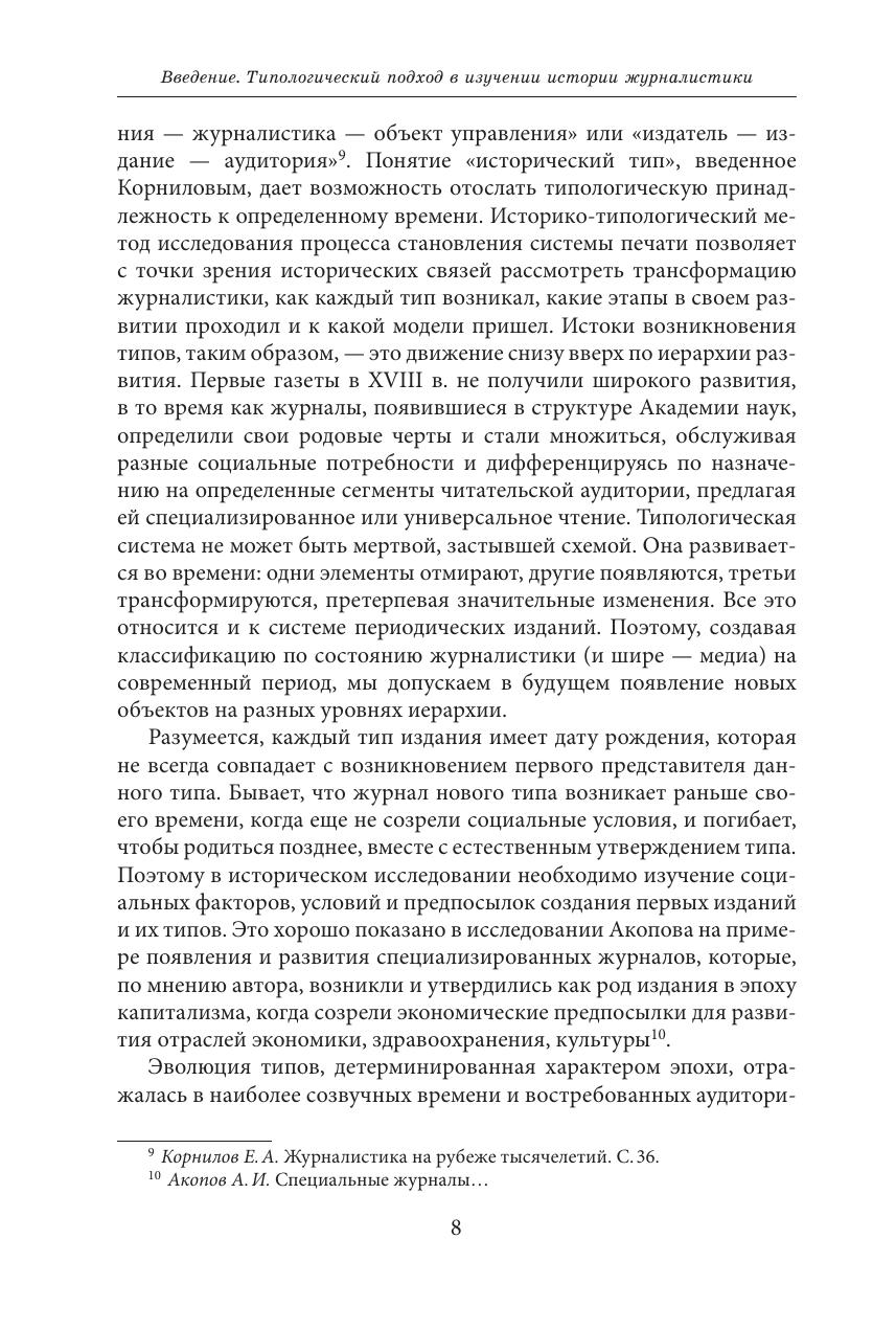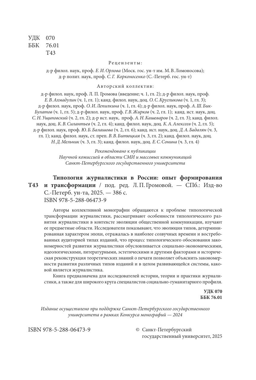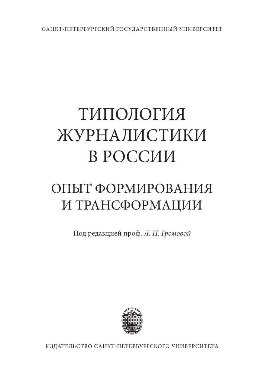 Авторы коллективной монографии обращаются к проблеме типологической трансформации журналистики, рассматривают особенности типологического развития журналистики в контексте эволюции общественной коммуникации, изучают ее предметные области. Исследователи показывают, что эволюция типов, детерминированная характером эпохи, отражалась в наиболее созвучных времени и востребованных аудиторией типах изданий, что процесс типологического обоснования закономерностей развития журналистики обуславливается социально-экономическими, идеологическими, литературными, эстетическими и другими факторами и историческая реконструкция теоретических знаний о печати позволяет объяснить закономерности развития типов изданий и в целом развивающейся системы, каковой является журналистика. Книга предназначена для исследователей истории, теории и практики журналистики, а также для широкого круга специалистов социально-гуманитарного профиля.