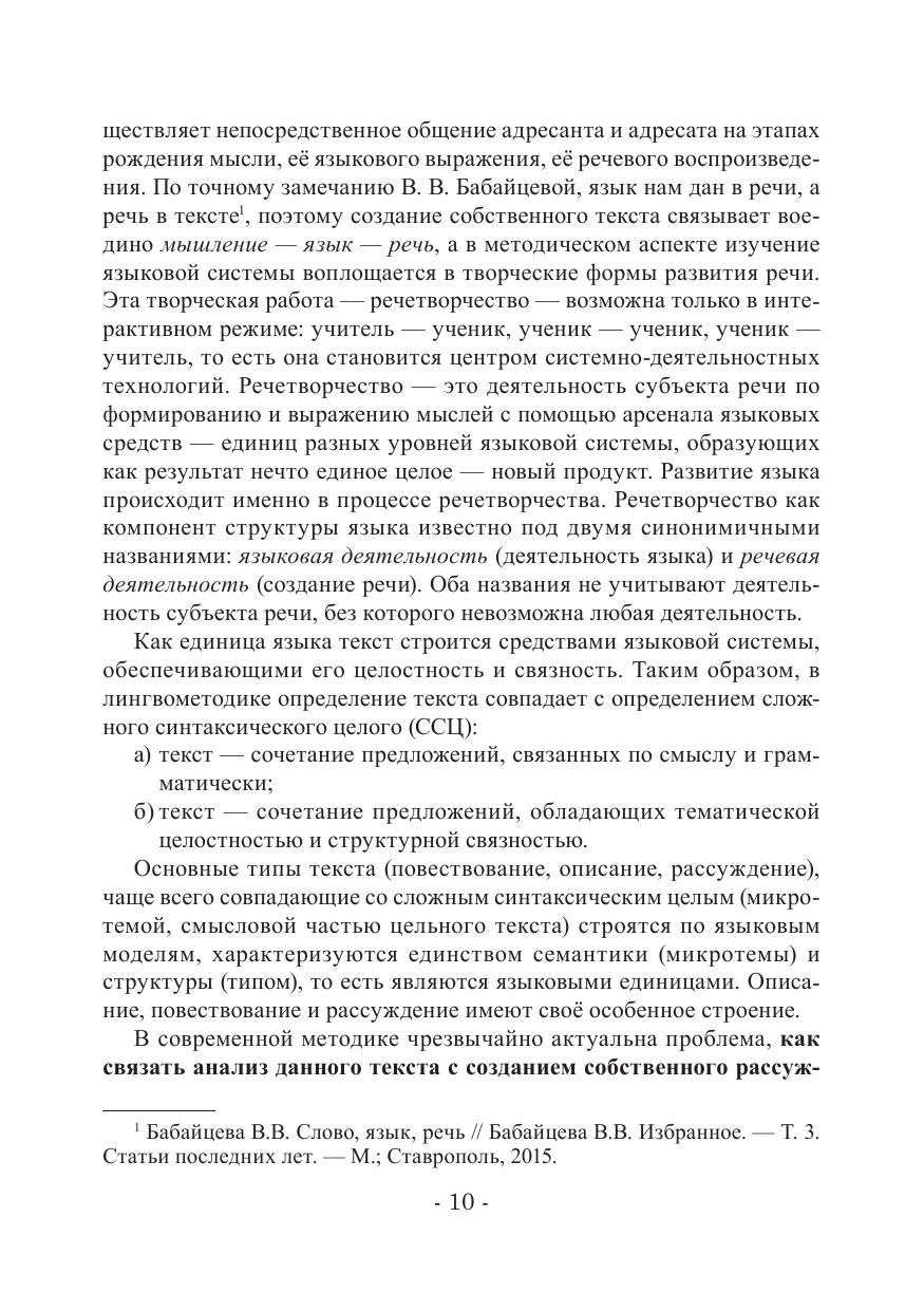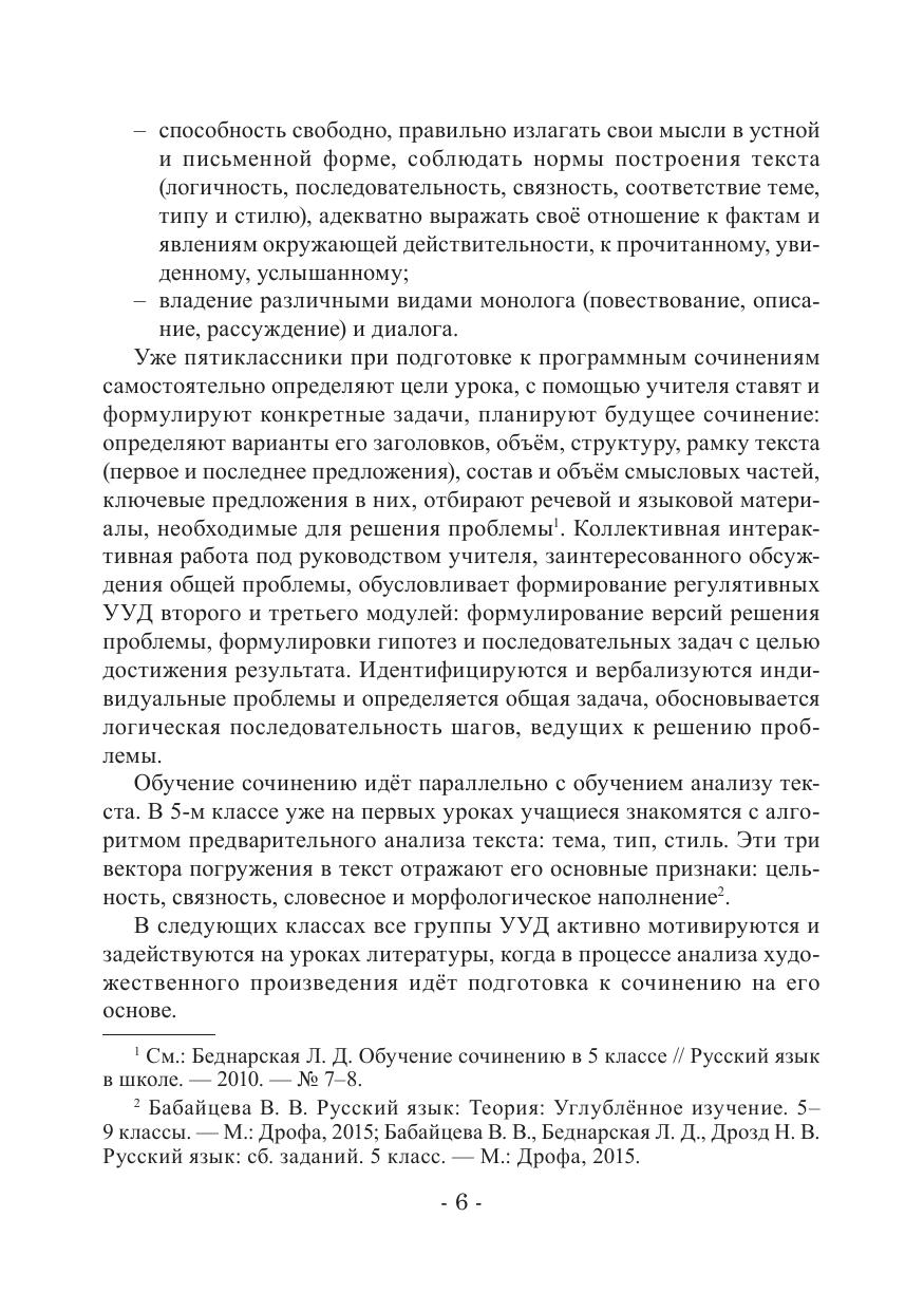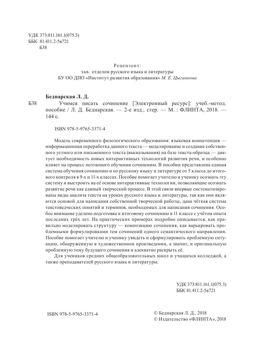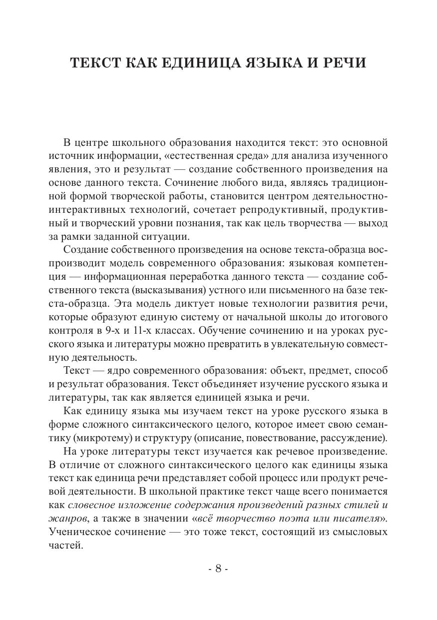 Модель современного филологического образования: языковая компетенция — информационная переработка данного текста — моделирование и создание собственного устного или письменного текста (высказывания) на базе текста-образца — диктует необходимость новых интерактивных технологий развития речи, и особенно влияет на процесс поэтапного обучения сочинению. В пособии представлена единая система обучения сочинению и по русскому языку и литературе от 5 класса до итогового контроля в 9-х и 11-х классах. Пособие помогает учителю и ученику осознать эту систему и выстроить на её основе интерактивные технологии, позволяющие осознать развитие речи как единый творческий процесс. В этой связи впервые систематизированы виды анализа текста на уроках русского языка и литературы, так как они являются основой для написания собственной творческой работы, дана чёткая система текстоведческих понятий и терминов, необходимых для написания сочинения. Особое внимание уделено подготовке к итоговому сочинению в 11 классе с учётом опыта последних трёх лет. На практических примерах подробно описывается, как правильно моделировать структуру — композицию сочинения, как варьировать проблемными формулировками тем сочинений одного семантического направления.