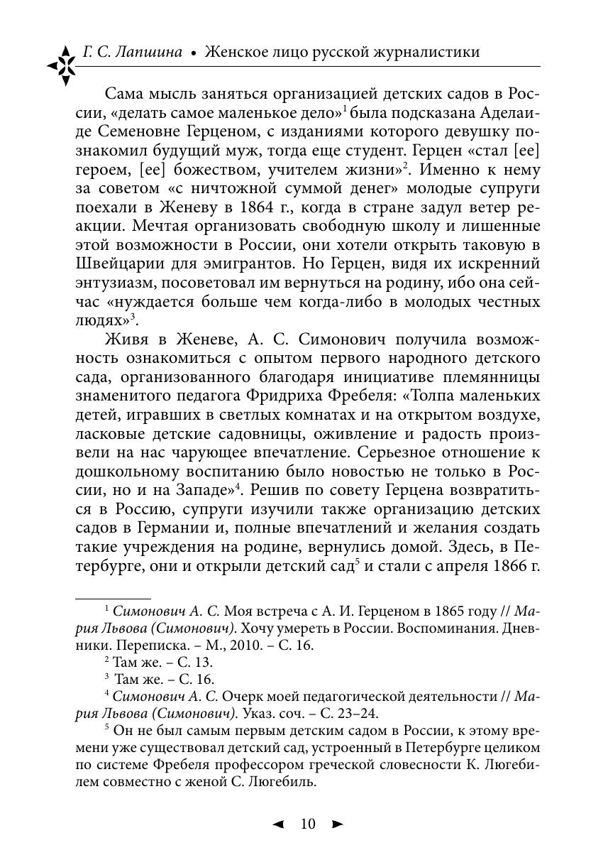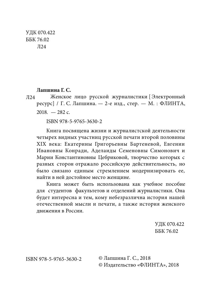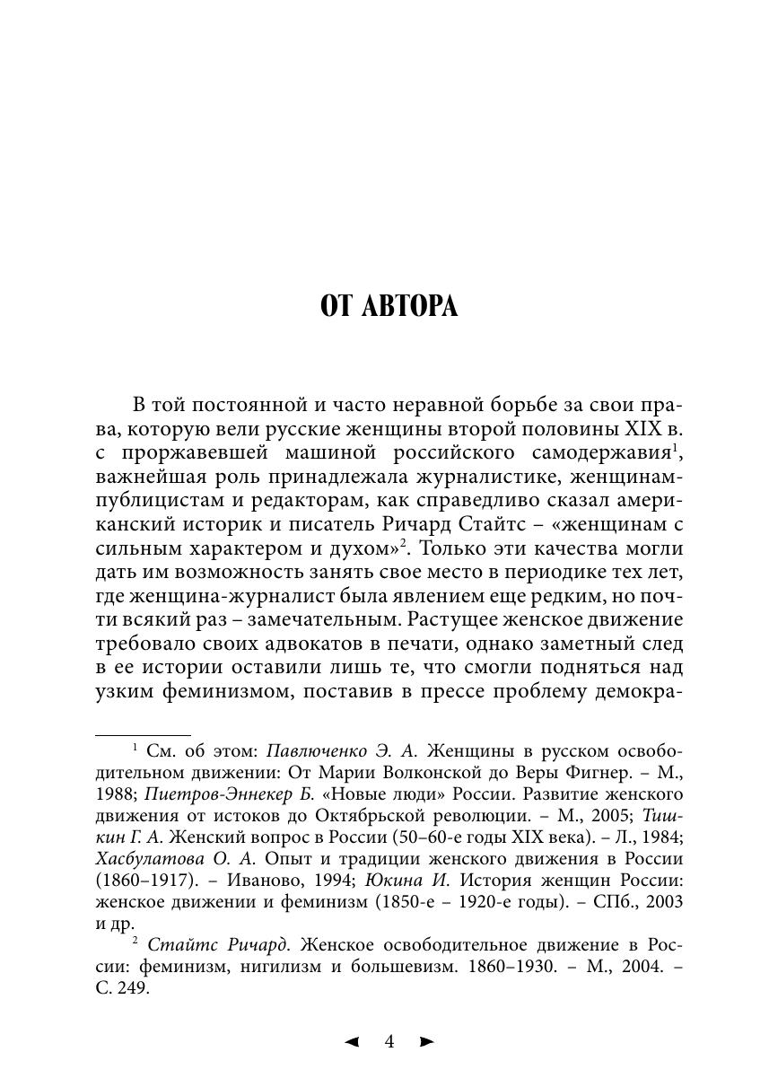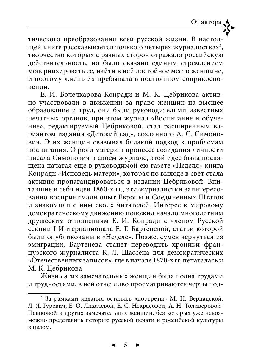Книга посвящена жизни и журналистской деятельности четырех видных участниц русской печати второй половины ХIХ века: Екатерины Григорьевны Бартеневой, Евгении Ивановны Конради, Аделаиды Семеновны Симонович и Марии Константиновны Цебриковой, творчество которых с разных сторон отражало российскую действительность, но было связано единым стремлением модернизировать ее, найти в ней достойное место женщине. Книга может быть использована как учебное пособие для студентов факультетов и отделений журналистики. Она будет интересна и тем, кому небезразлична история нашей отечественной мысли и печати, а также история женского движения в России.