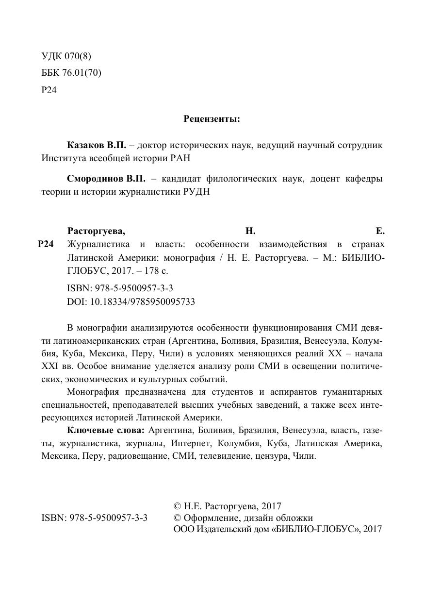 Ключевые слова: Аргентина, Боливия, Бразилия, Венесуэла, власть, газеты, журналистика, журналы, Интернет, Колумбия, Куба, Латинская Америка, Мексика, Перу, радиовещание, СМИ, телевидение, цензура, Чили.