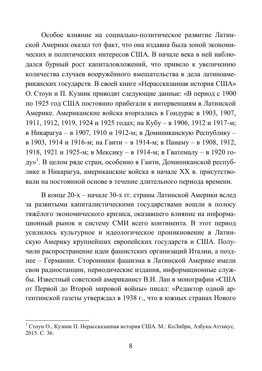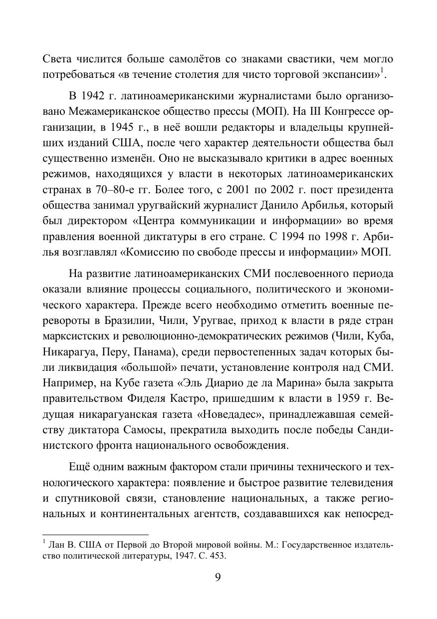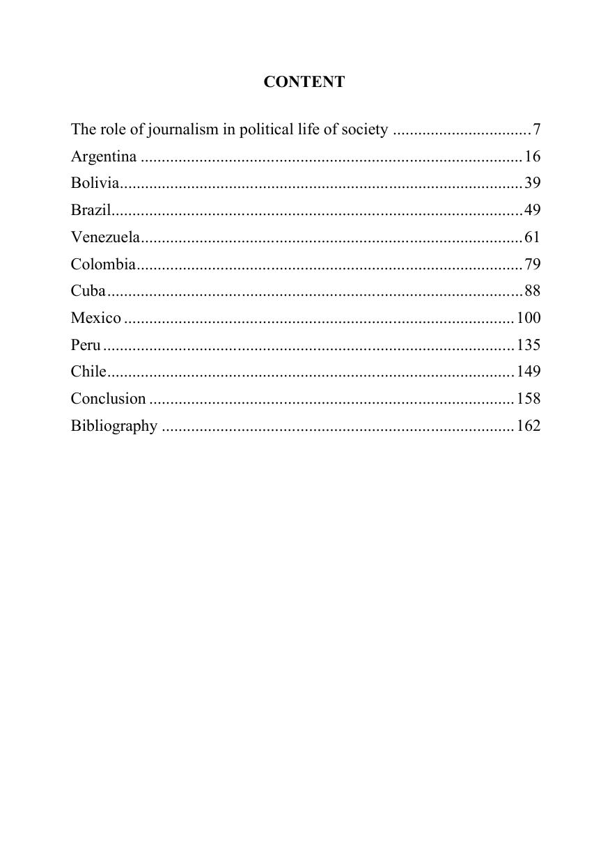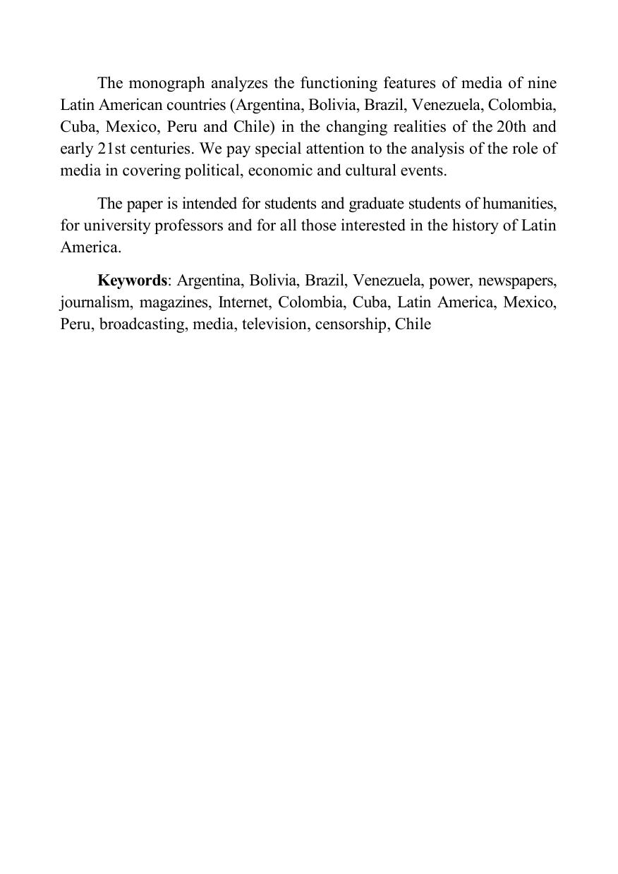 В монографии анализируются особенности функционирования СМИ девяти латиноамериканских стран (Аргентина, Боливия, Бразилия, Венесуэла, Колумбия, Куба, Мексика, Перу, Чили) в условиях меняющихся реалий ХХ – начала