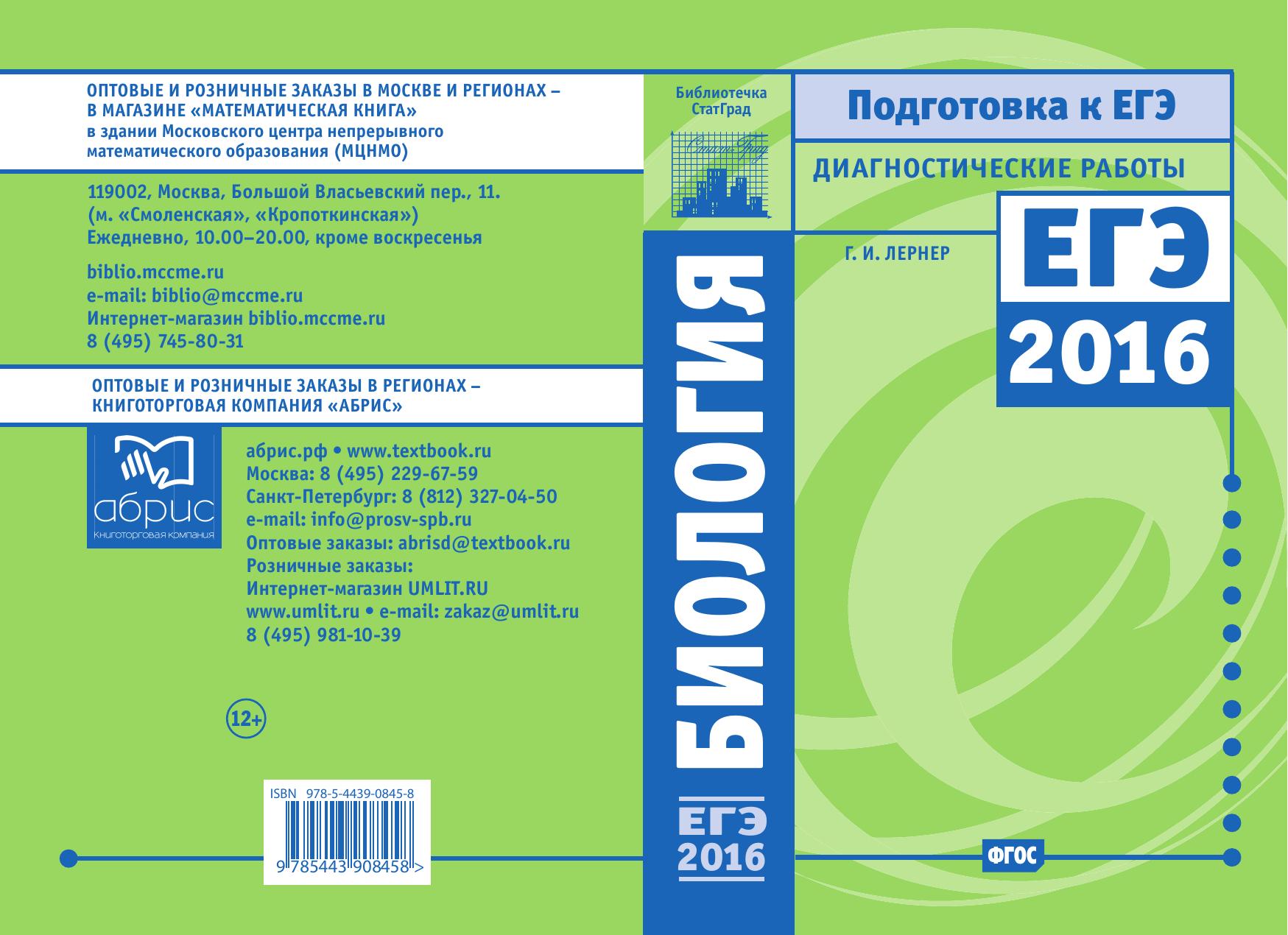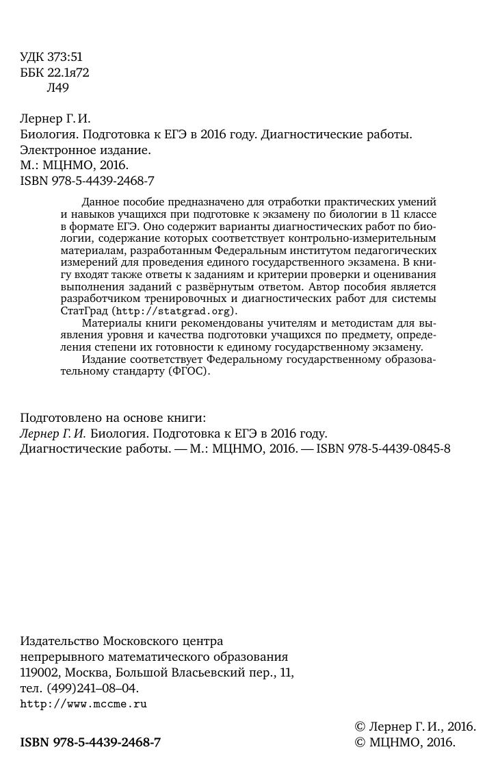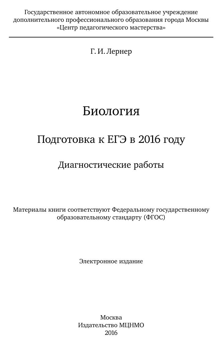 Данное пособие предназначено для отработки практических умений и навыков учащихся при подготовке к экзамену по биологии в 11 классе в формате ЕГЭ. Оно содержит варианты диагностических работ по биологии, содержание которых соответствует контрольно-измерительным материалам, разработанным Федеральным институтом педагогических измерений для проведения единого государственного экзамена. В книгу входят также ответы к заданиям и критерии проверки и оценивания выполнения заданий с развёрнутым ответом. Автор пособия является разработчиком тренировочных и диагностических работ для системы СтатГрад (http://statgrad.org). Материалы книги рекомендованы учителям и методистам для выявления уровня и качества подготовки учащихся по предмету, определения степени их готовности к единому государственному экзамену. Издание соответствует Федеральному государственному образовательному стандарту (ФГОС).