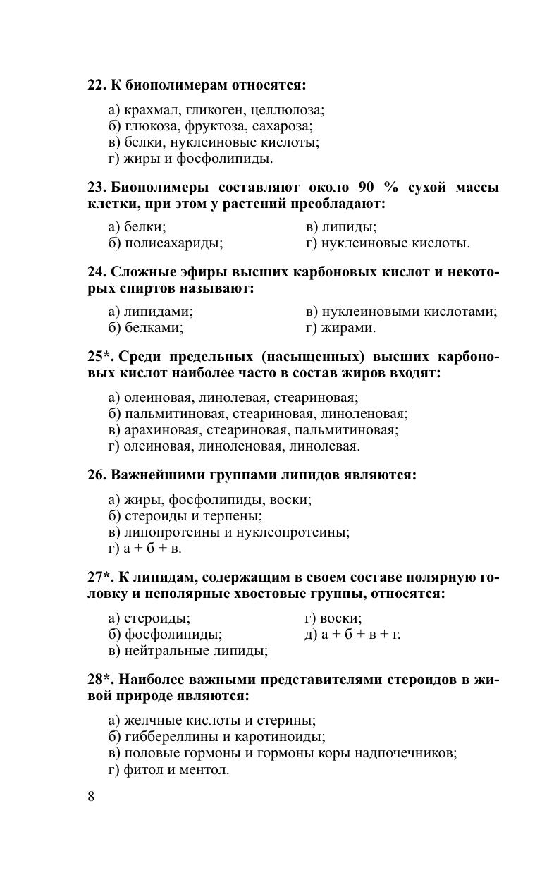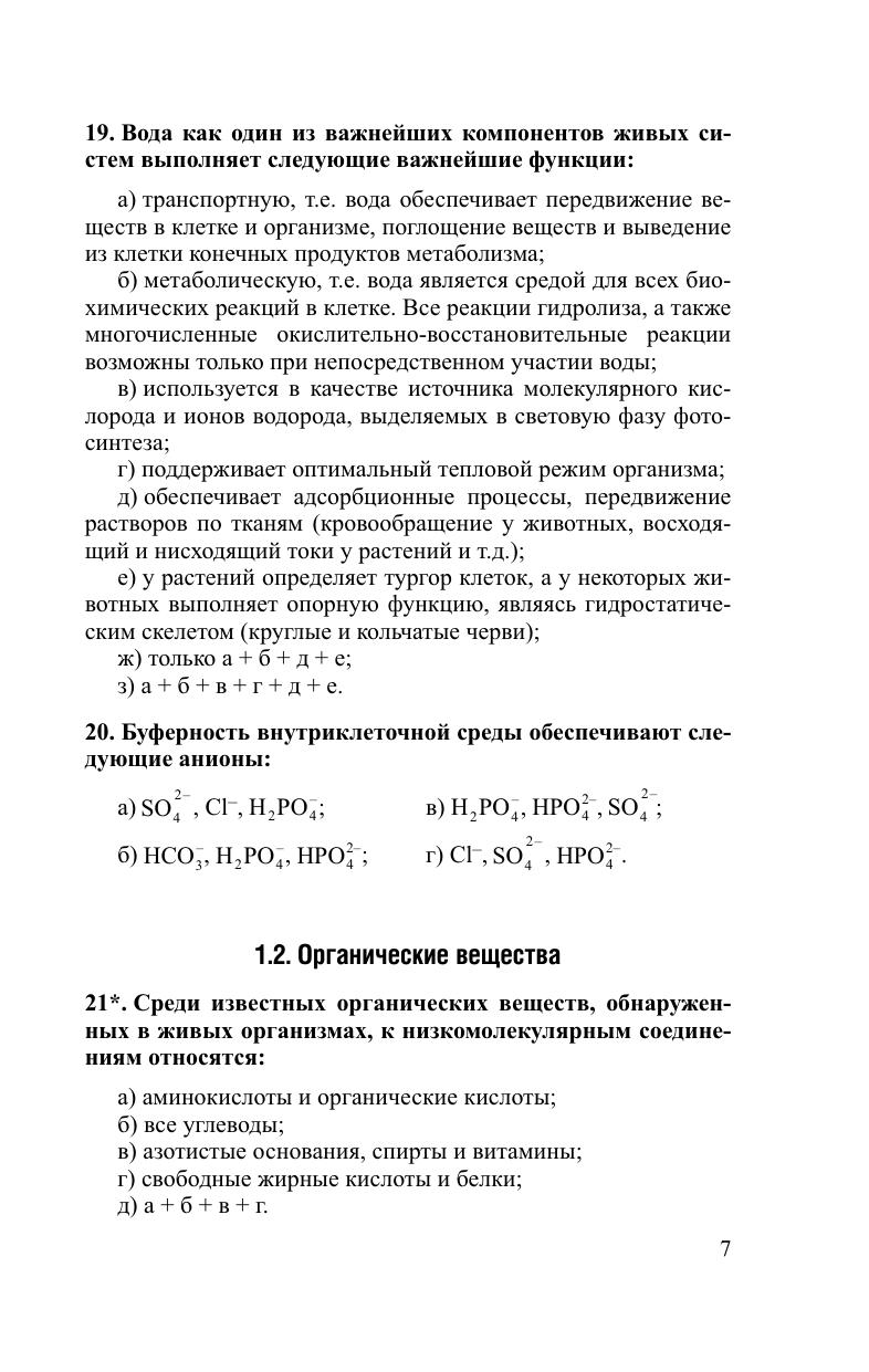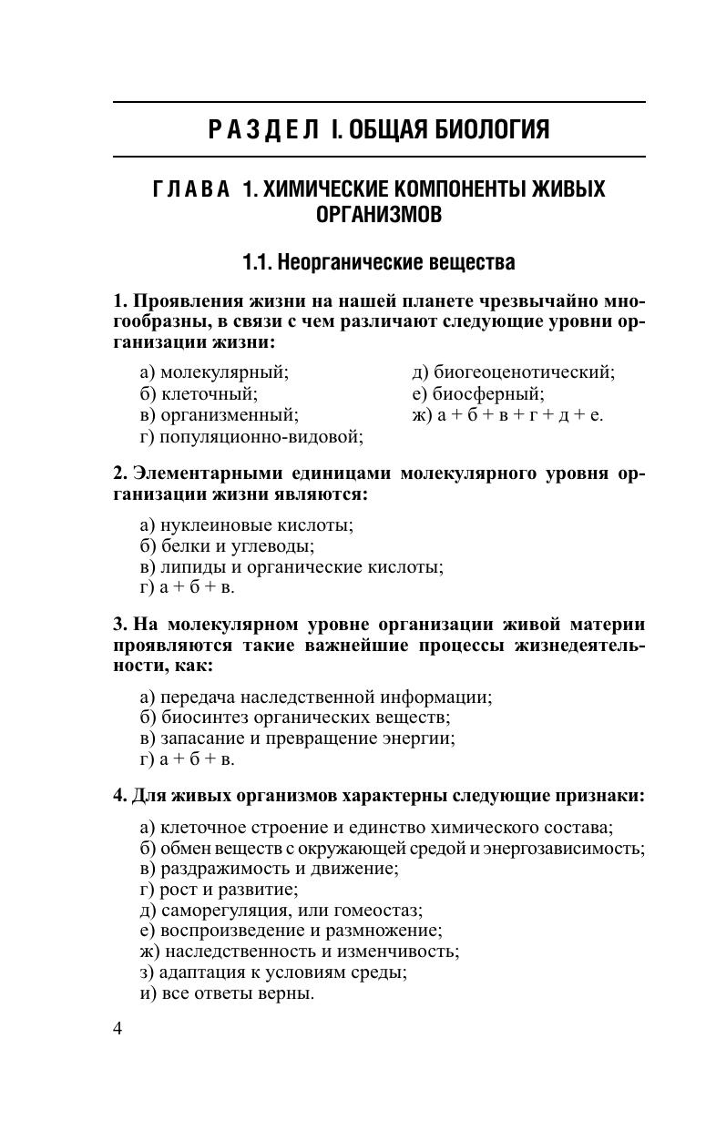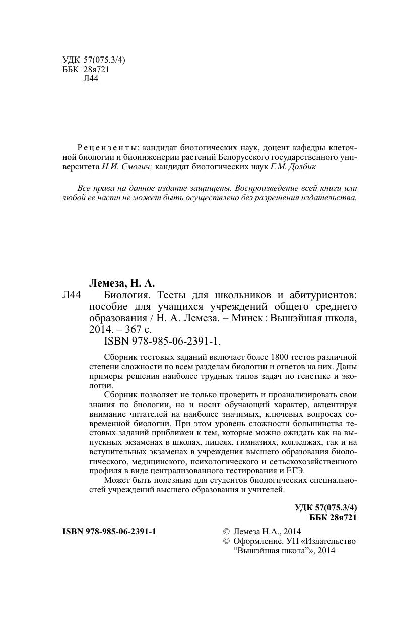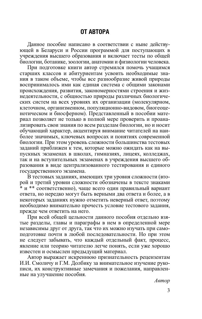 Сборник тестовых заданий включает более 1800 тестов различной степени сложности по всем разделам биологии и ответов на них. Даны примеры решения наиболее трудных типов задач по генетике и экологии. Сборник позволяет не только проверить и проанализировать свои знания по биологии, но и носит обучающий характер, акцентируя внимание читателей на наиболее значимых, ключевых вопросах современной биологии. При этом уровень сложности большинства тестовых заданий приближен к тем, которые можно ожидать как на выпускных экзаменах в школах, лицеях, гимназиях, колледжах, так и на вступительных экзаменах в учреждения высшего образования биологического, медицинского, психологического и сельскохозяйственного профиля в виде централизованного тестирования и ЕГЭ. Может быть полезным для студентов биологических специальностей учреждений высшего образования и учителей.