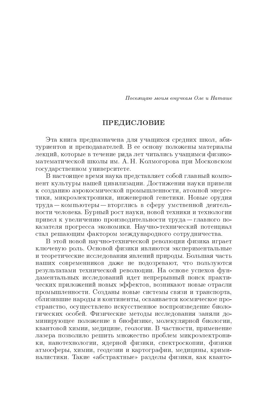 В основу книги положены лекции, которые автор читал учащимся школы им. А.Н. Колмогорова при МГУ. Изложен теоретический материал по всем темам программы физики средней школы, включены решения более 440 примеров и задач. Подробно рассмотрены вопросы, которые, как показала практика приемных экзаменов на естественные факультеты МГУ, наиболее сложны для учащихся. Здесь же любознательный читатель познакомится с историей возникновения новых понятий, терминов и открытий выдающихся людей — людей умственного труда, первооткрывателей, увлеченных творческой деятельностью. Основная цель книги — научить учащихся активно применять теоретические основы физики как рабочий аппарат, позволяющий решать конкретные задачи и приобрести уверенность в самостоятельной работе. Для учащихся средних школ, лицеев, гимназий, для абитуриентов, студентов и преподавателей.