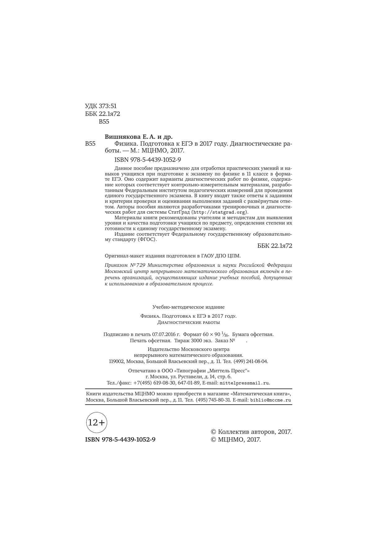 Данное пособие предназначено для отработки практических умений и навыков учащихся при подготовке к экзамену по физике в 11 классе в формате ЕГЭ. Оно содержит варианты диагностических работ по физике, содержание которых соответствует контрольно-измерительным материалам, разработанным Федеральным институтом педагогических измерений для проведения единого государственного экзамена. В книгу входят также ответы к заданиям и критерии проверки и оценивания выполнения заданий с развёрнутым ответом. Авторы пособия являются разработчиками тренировочных и диагностических работ для системы СтатГрад (http://statgrad.org).