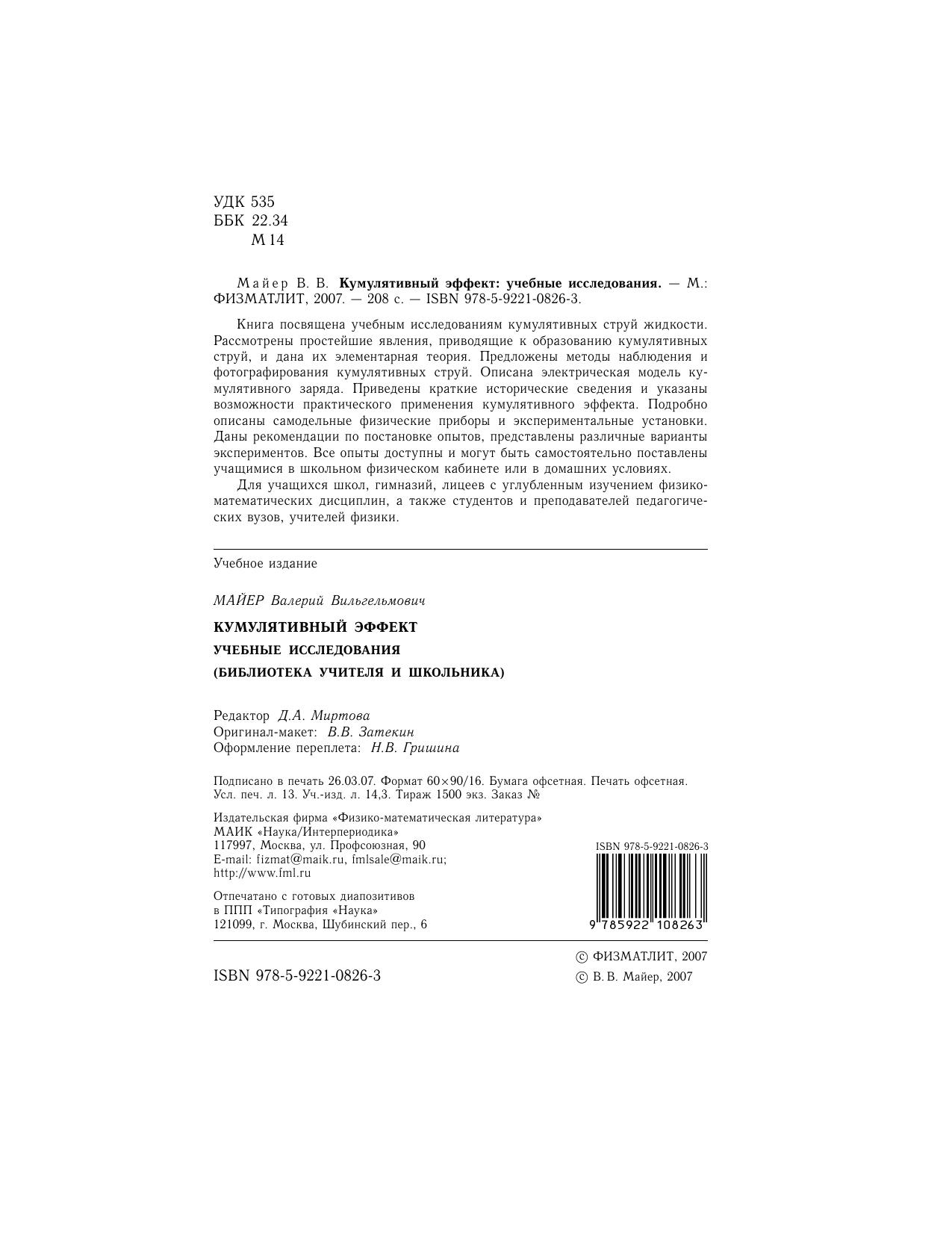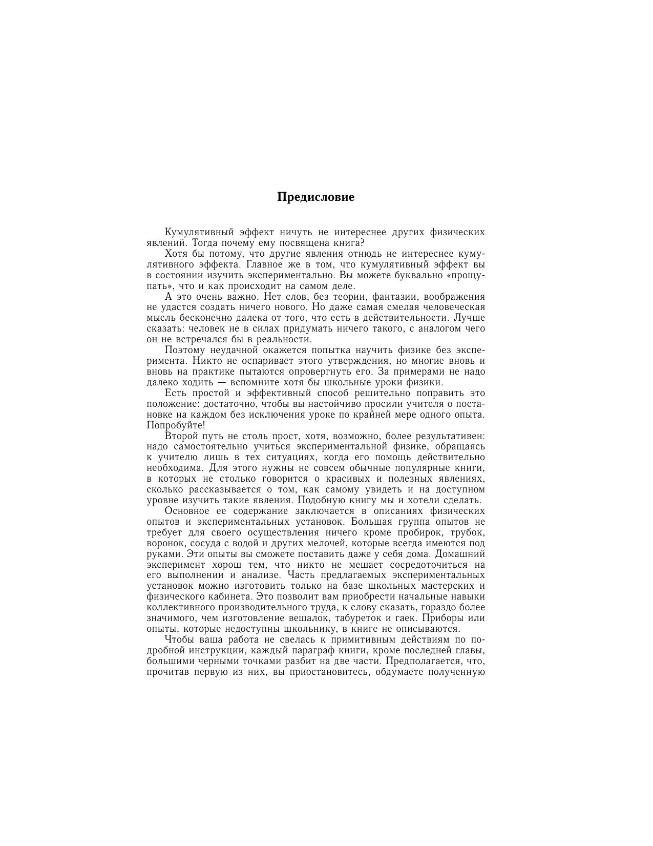 Книга посвящена учебным исследованиям кумулятивных струй жидкости. Рассмотрены простейшие явления, приводящие к образованию кумулятивных струй, и дана их элементарная теория. Предложены методы наблюдения и фотографирования кумулятивных струй. Описана электрическая модель кумулятивного заряда. Приведены краткие исторические сведения и указаны возможности практического применения кумулятивного эффекта. Подробно описаны самодельные физические приборы и экспериментальные установки. Даны рекомендации по постановке опытов, представлены различные варианты экспериментов. Все опыты доступны и могут быть самостоятельно поставлены учащимися в школьном физическом кабинете или в домашних условиях. Для учащихся школ, гимназий, лицеев с углубленным изучением физико-математических дисциплин, а также студентов и преподавателей педагогических вузов, учителей физики.