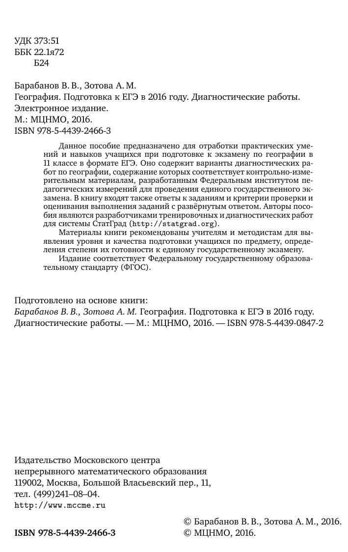 Данное пособие предназначено для отработки практических умений и навыков учащихся при подготовке к экзамену по географии в 11 классе в формате ЕГЭ. Оно содержит варианты диагностических работ по географии, содержание которых соответствует контрольно-измерительным материалам, разработанным Федеральным институтом педагогических измерений для проведения единого государственного экзамена. В книгу входят также ответы к заданиям и критерии проверки и оценивания выполнения заданий с развёрнутым ответом. Авторы пособия являются разработчиками тренировочных и диагностических работ для системы СтатГрад (http://statgrad.org). Материалы книги рекомендованы учителям и методистам для выявления уровня и качества подготовки учащихся по предмету, определения степени их готовности к единому государственному экзамену. Издание соответствует Федеральному государственному образовательному стандарту (ФГОС).